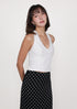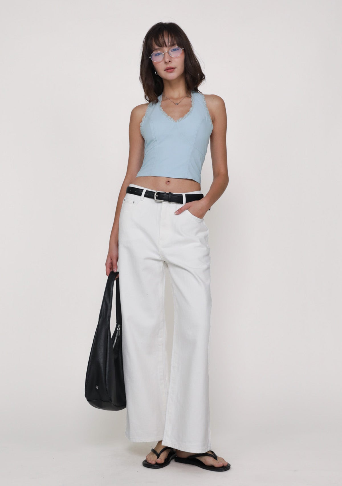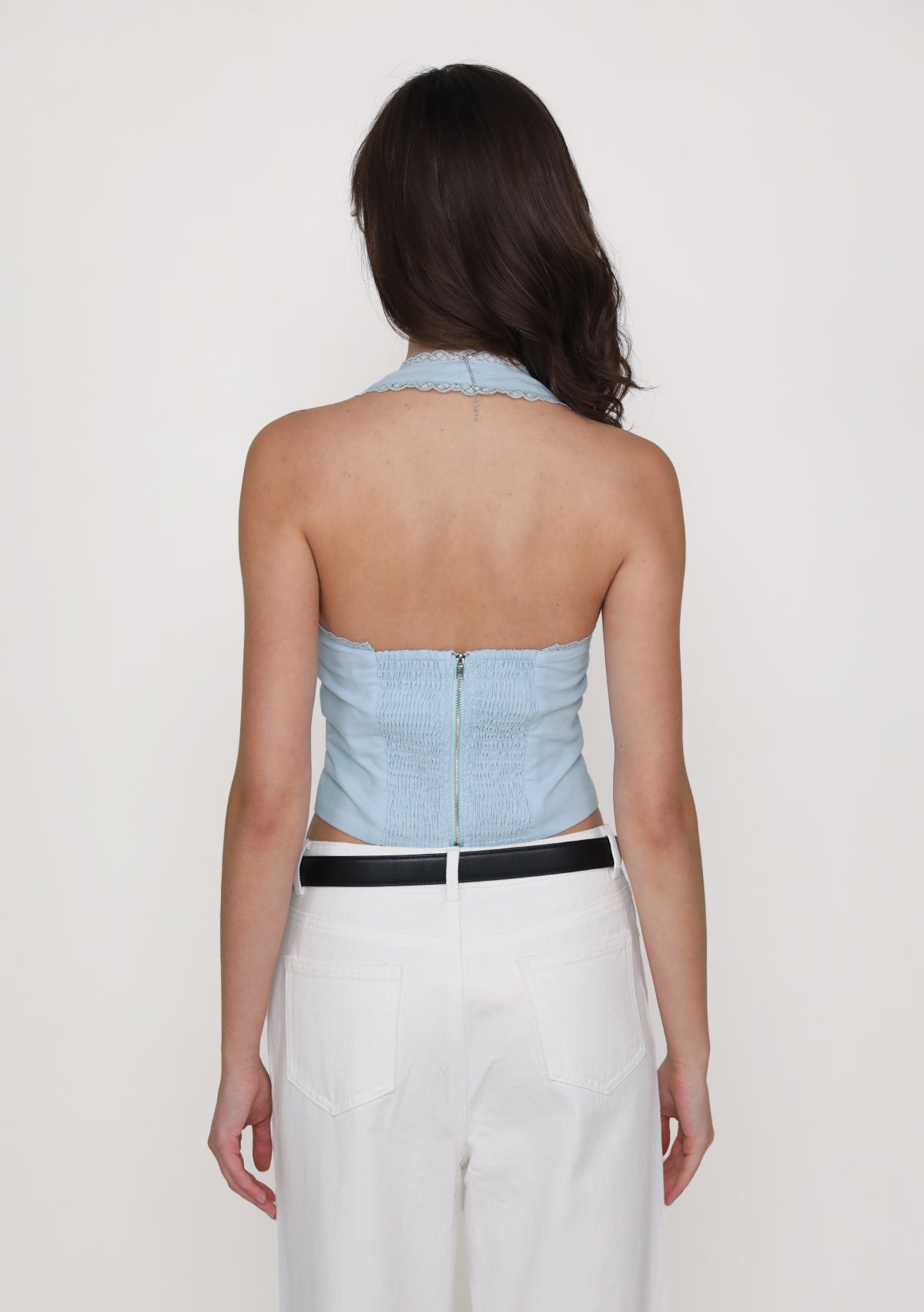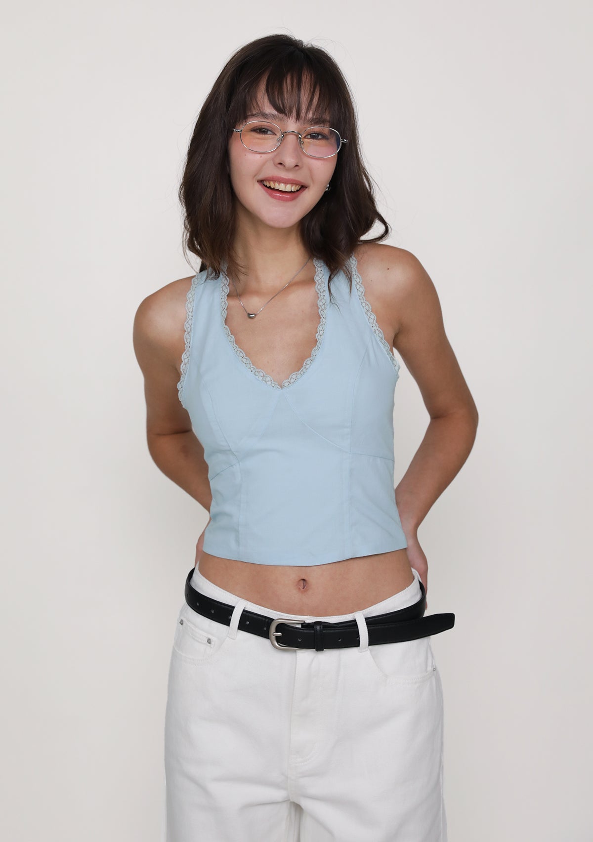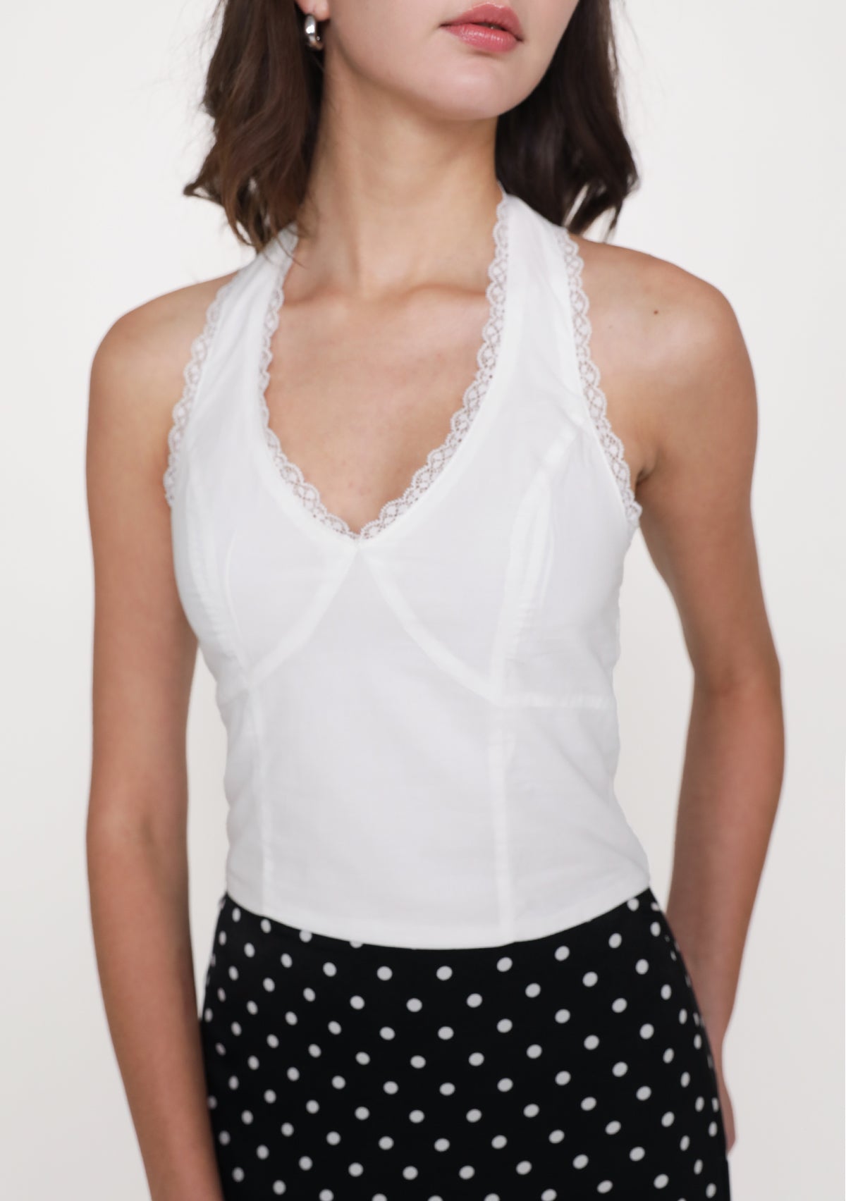 Scarlett Lace Trim Halter Top is a fitted cotton halter top featuring delicate lace trim and an exposed back zip.