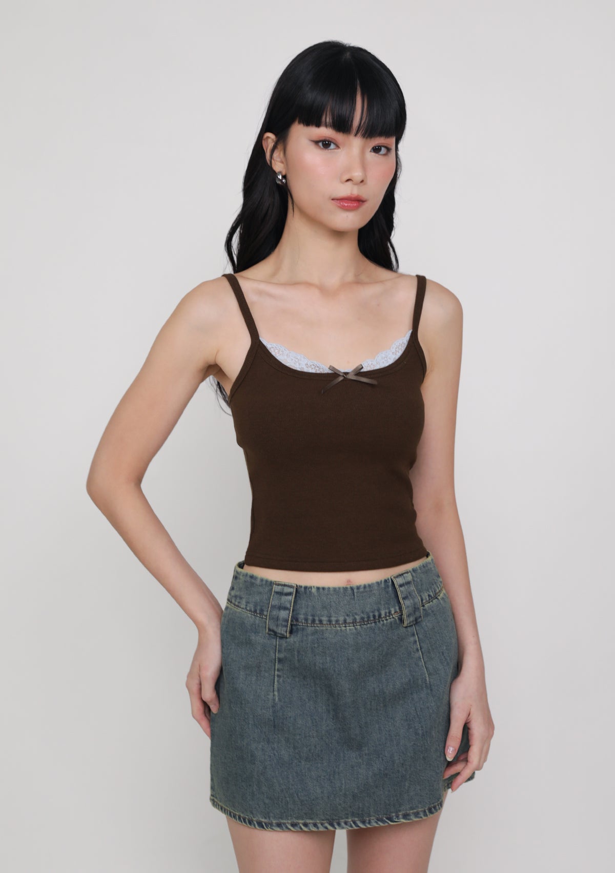 Soft details meet everyday ease with Uma Lace Layered Padded Top. Designed with a curved lace layer at the neckline and a dainty ribbon at the bust, it brings just the right amount of charm to your basics. The stretchy fabric hugs comfortably, making it perfect for layering or lounging.