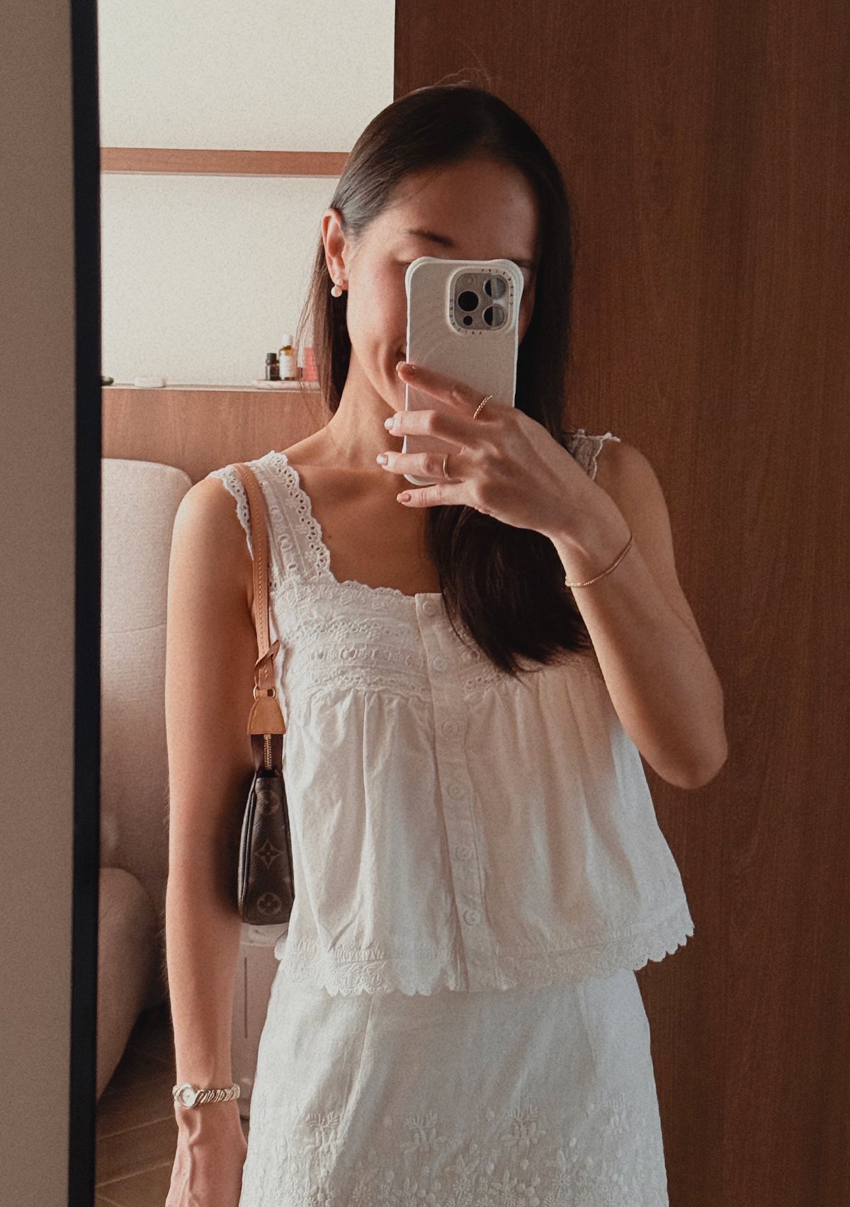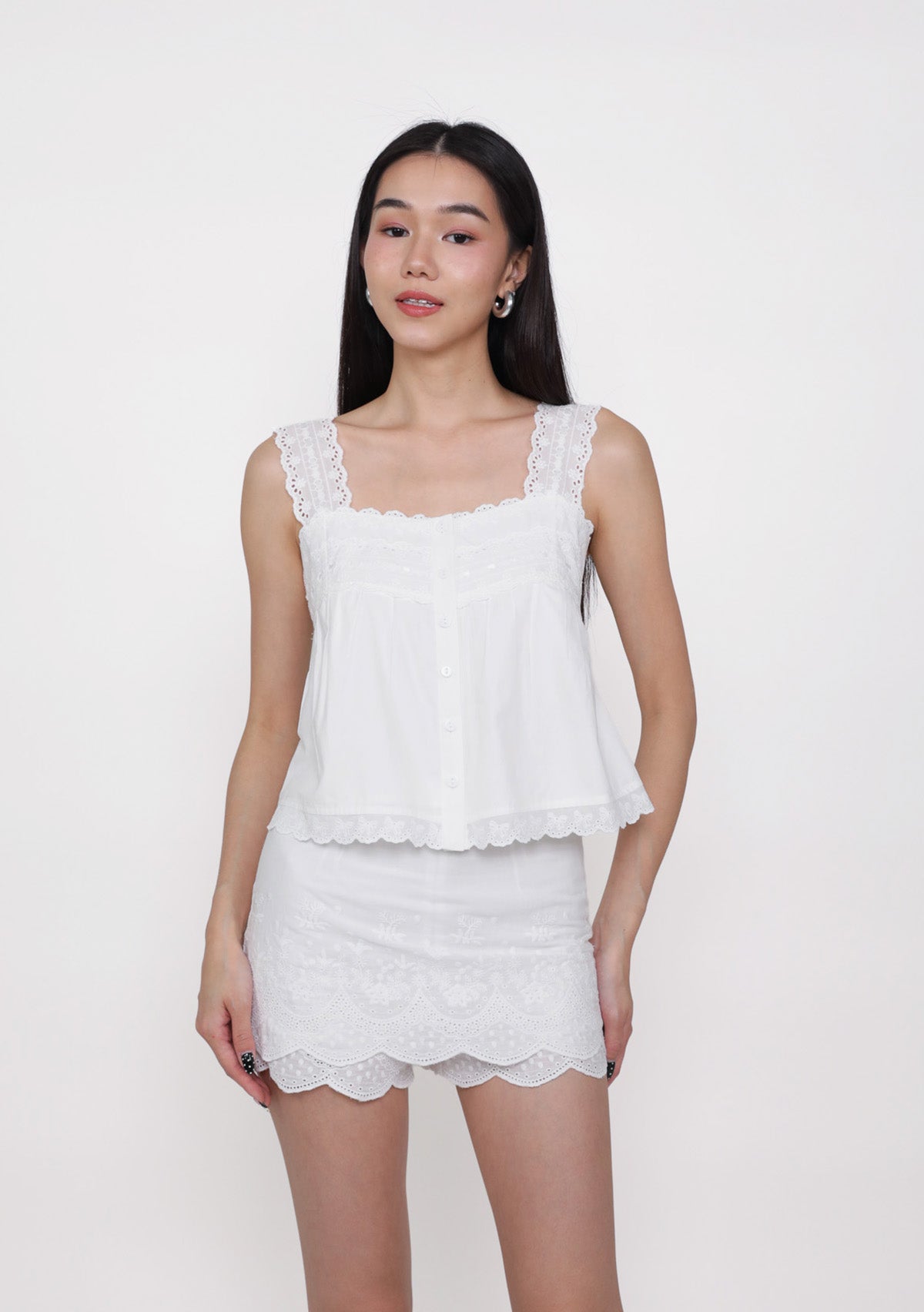 Klaris is airy, charming, and effortlessly wearable. Designed with a relaxed babydoll silhouette and delicate eyelet detailing, this top adds texture and softness to any outfit. Functional front buttons allow easy styling, while the inner lining ensures comfort and coverage. Pair it with skirts, shorts, or jeans for a playful, polished everyday look.