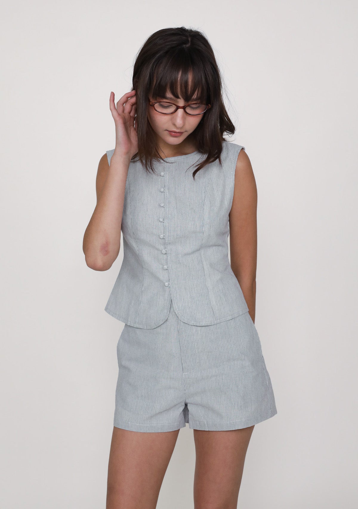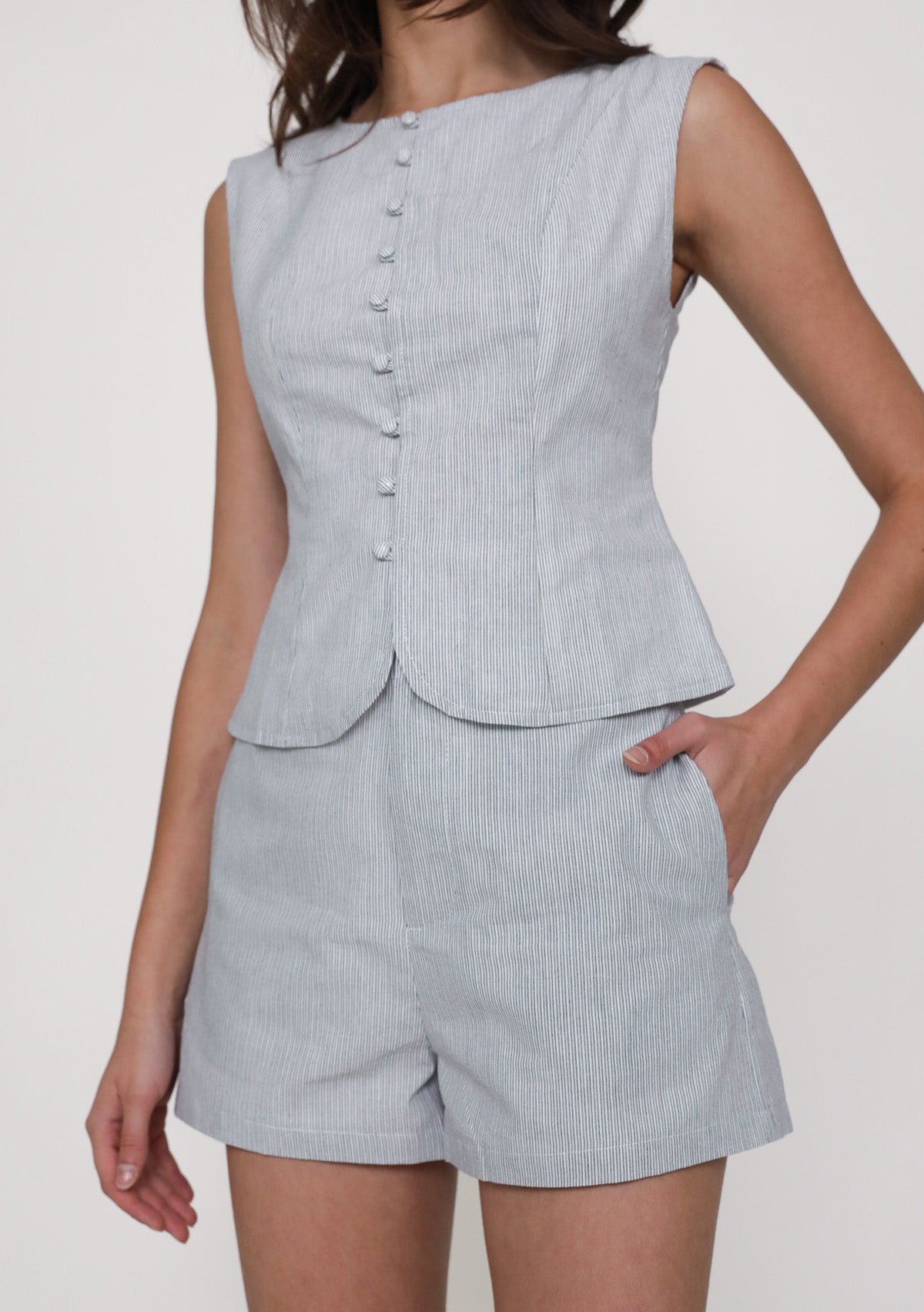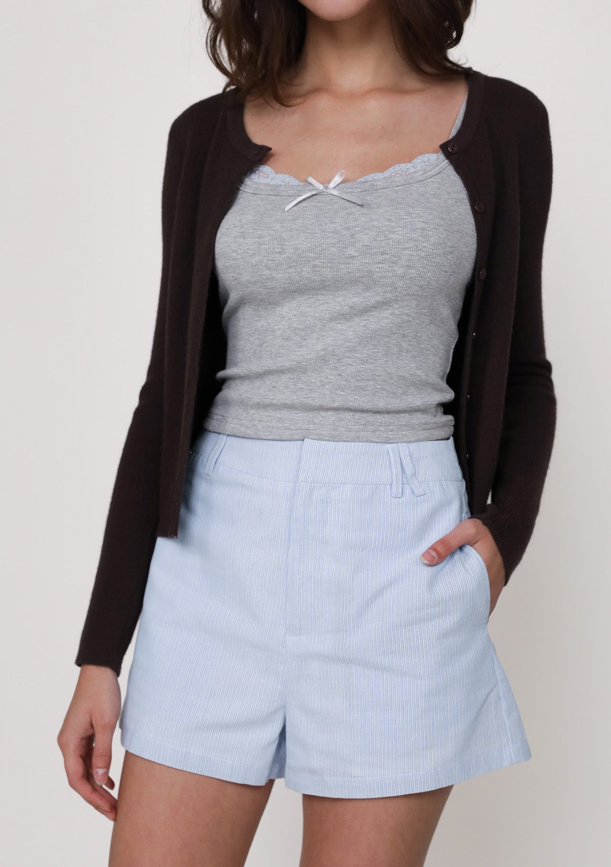 Yena Tailored Shorts (Striped) are inner lined cotton shorts with a fine stripe print and clean hook closure – perfect for everyday polished dressing.