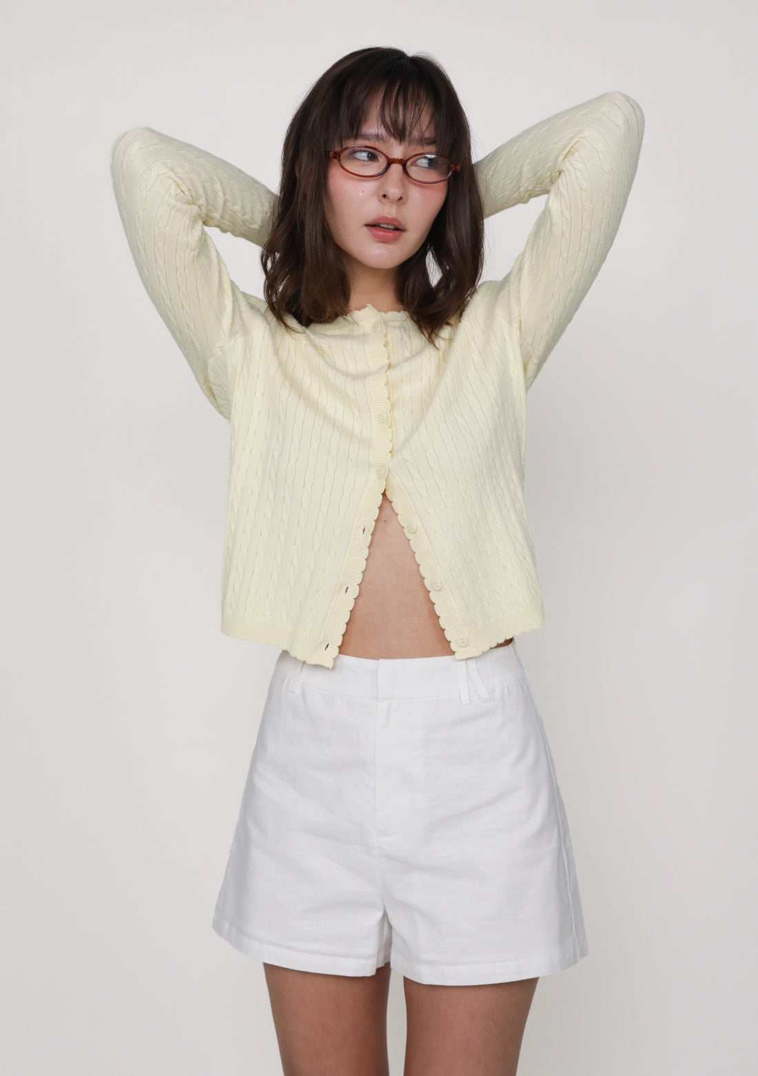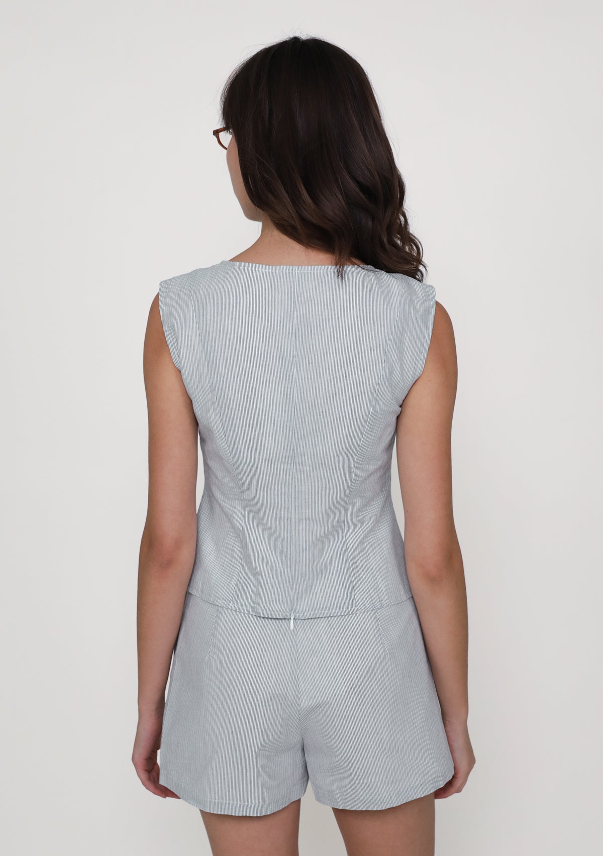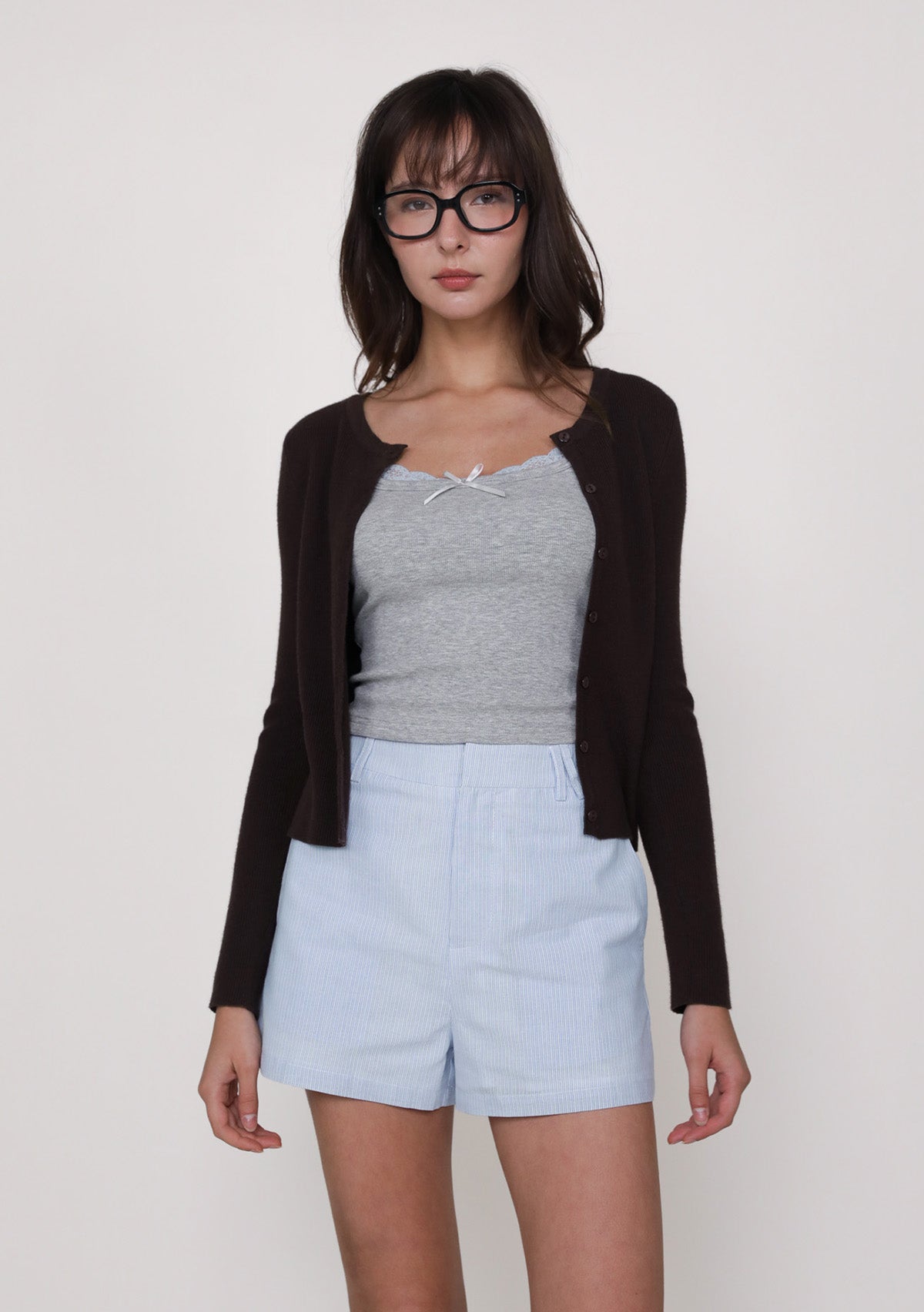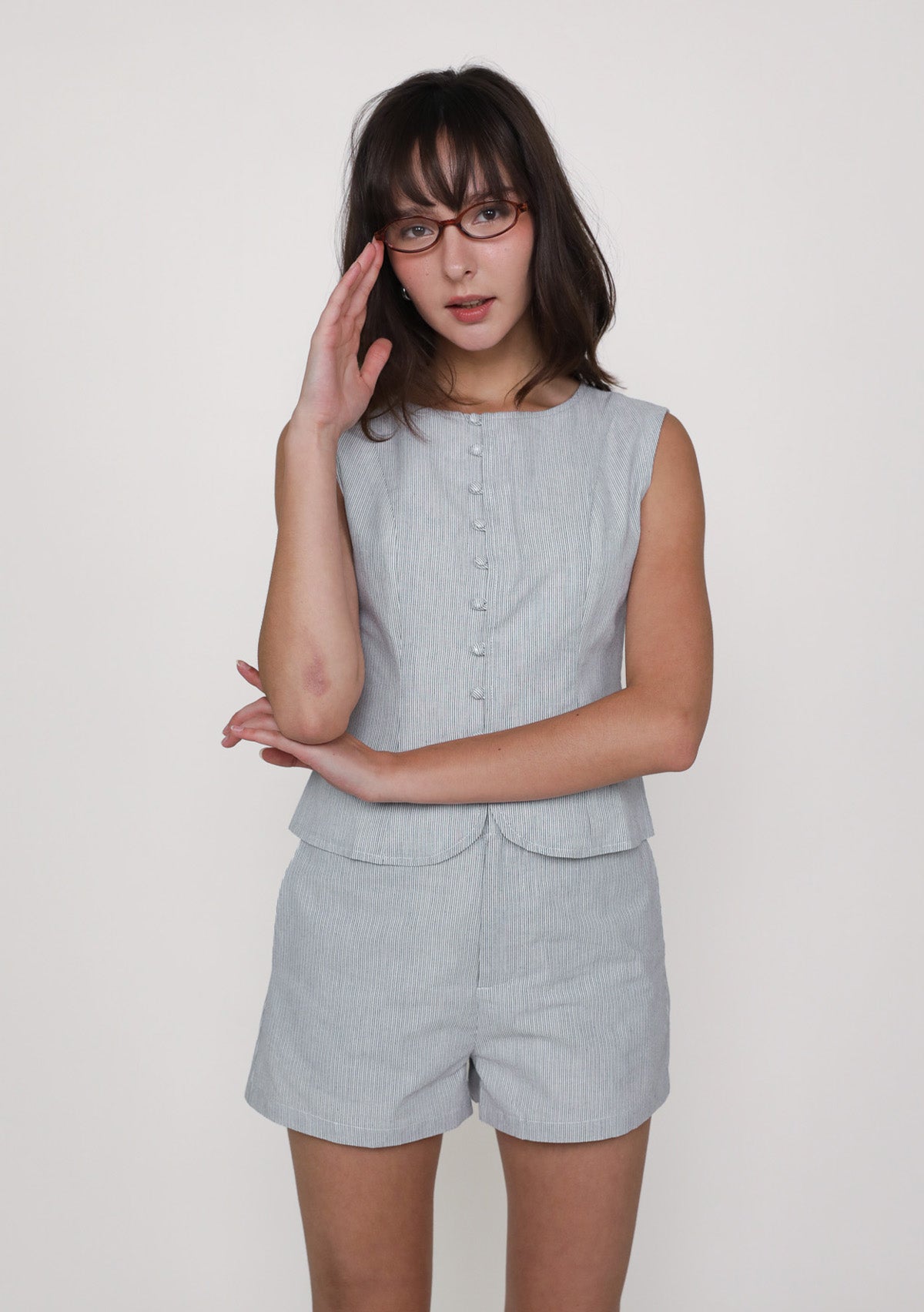 Yena Tailored Shorts (Striped) are inner lined cotton shorts with a fine stripe print and clean hook closure – perfect for everyday polished dressing.