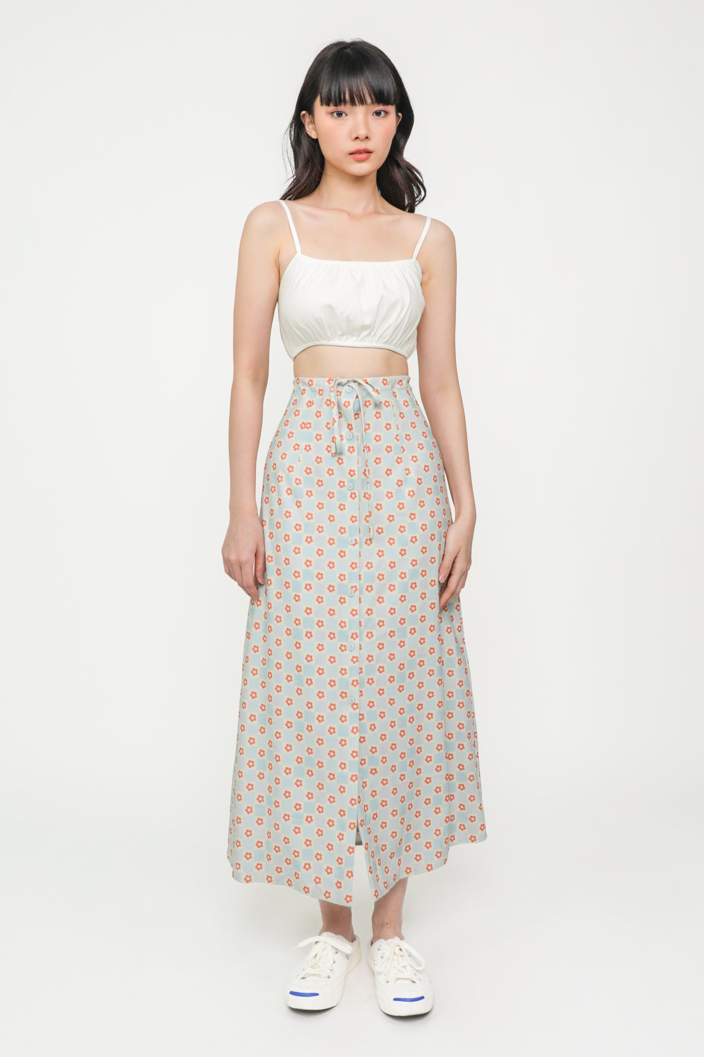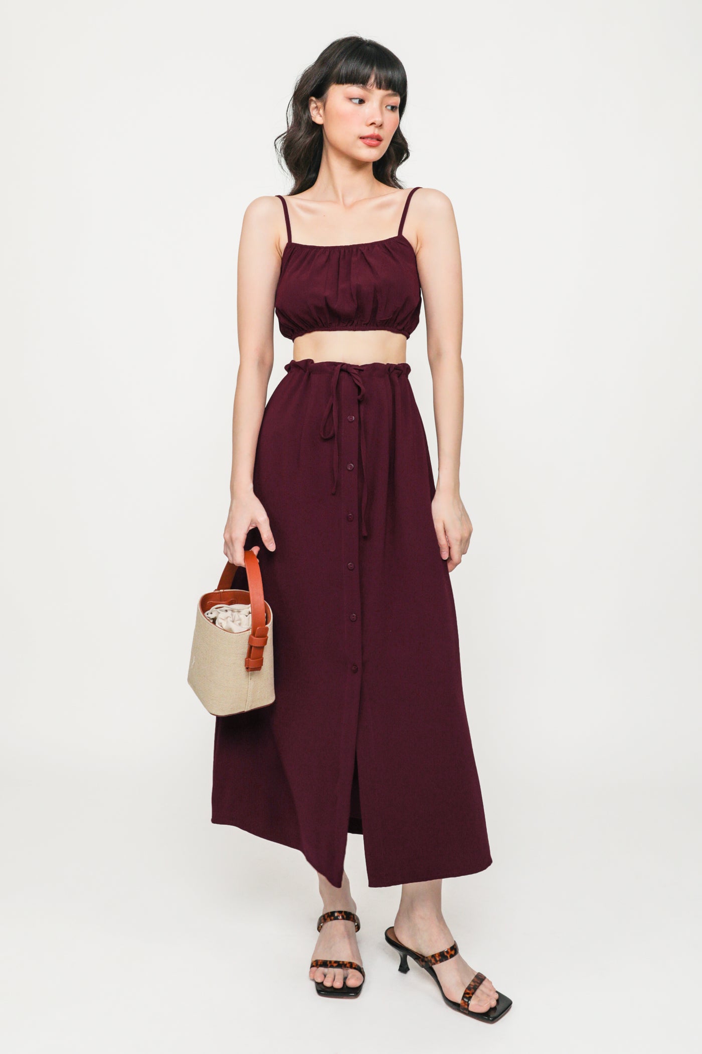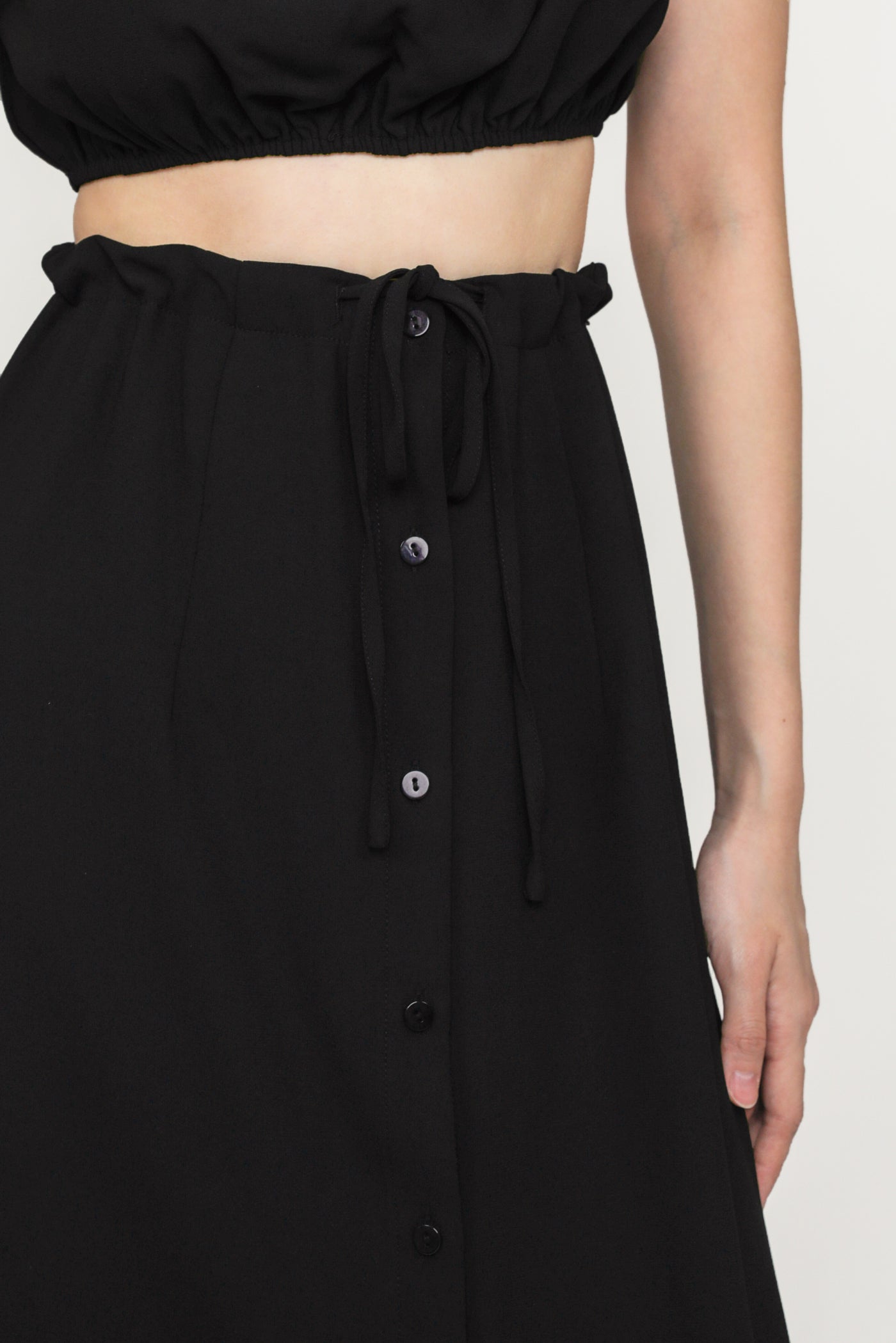 Don't underestimate the elegance of a simple midi skirt. Cody Drawstring Midi Skirt has a flowy silhouette with button details for a chic touch. This midi skirt pairs easily with your favourite basic crop top and blouses. Elevate your weekend looks by switching up your bottoms for this sleek midi skirt.
