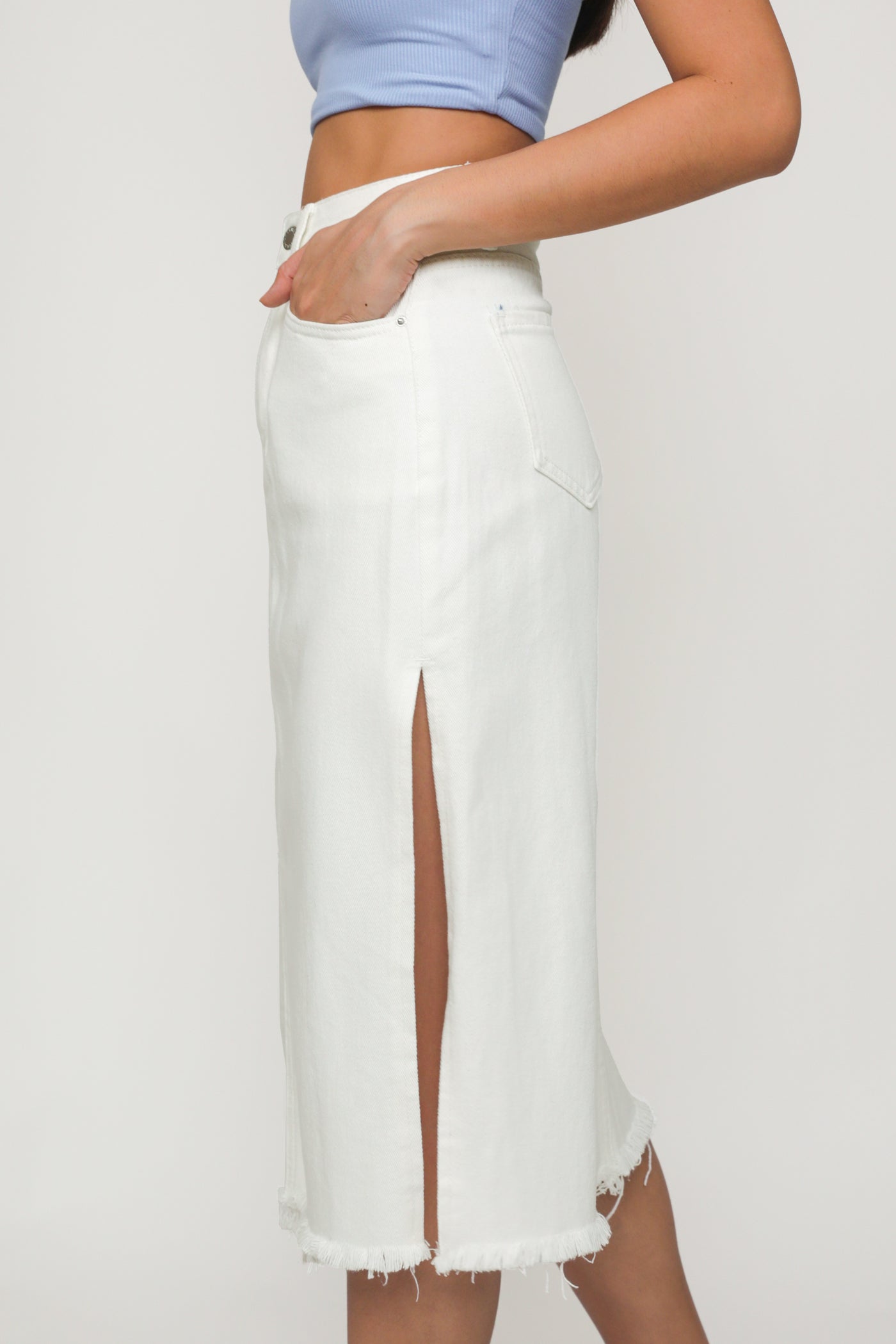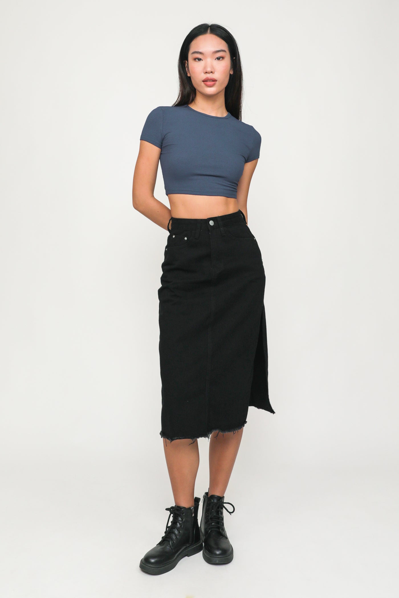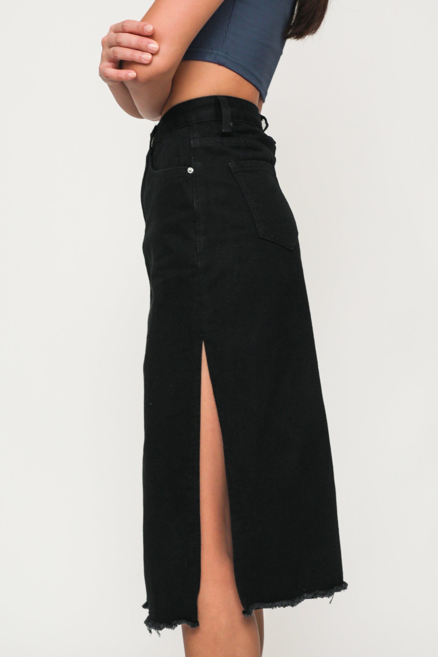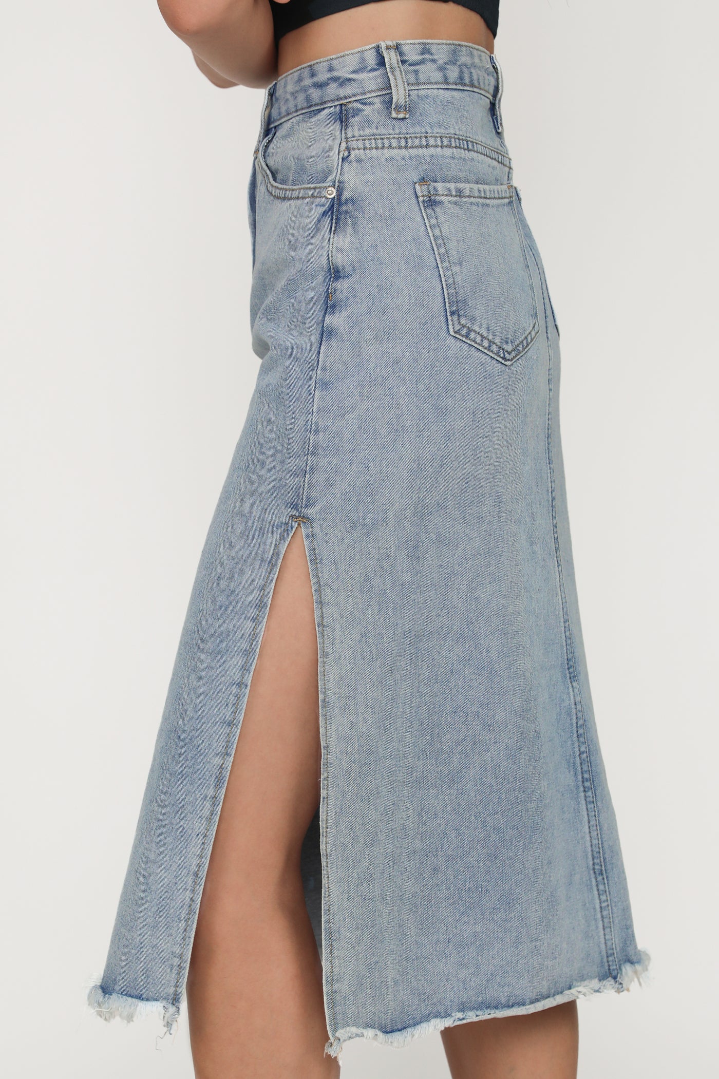 Your weekend looks are sorted with Jada. This denim midi skirt is a timeless feminine piece that effortlessly ties an outfit together. Jada's high slits on the sides also gives a chic hint to any look.