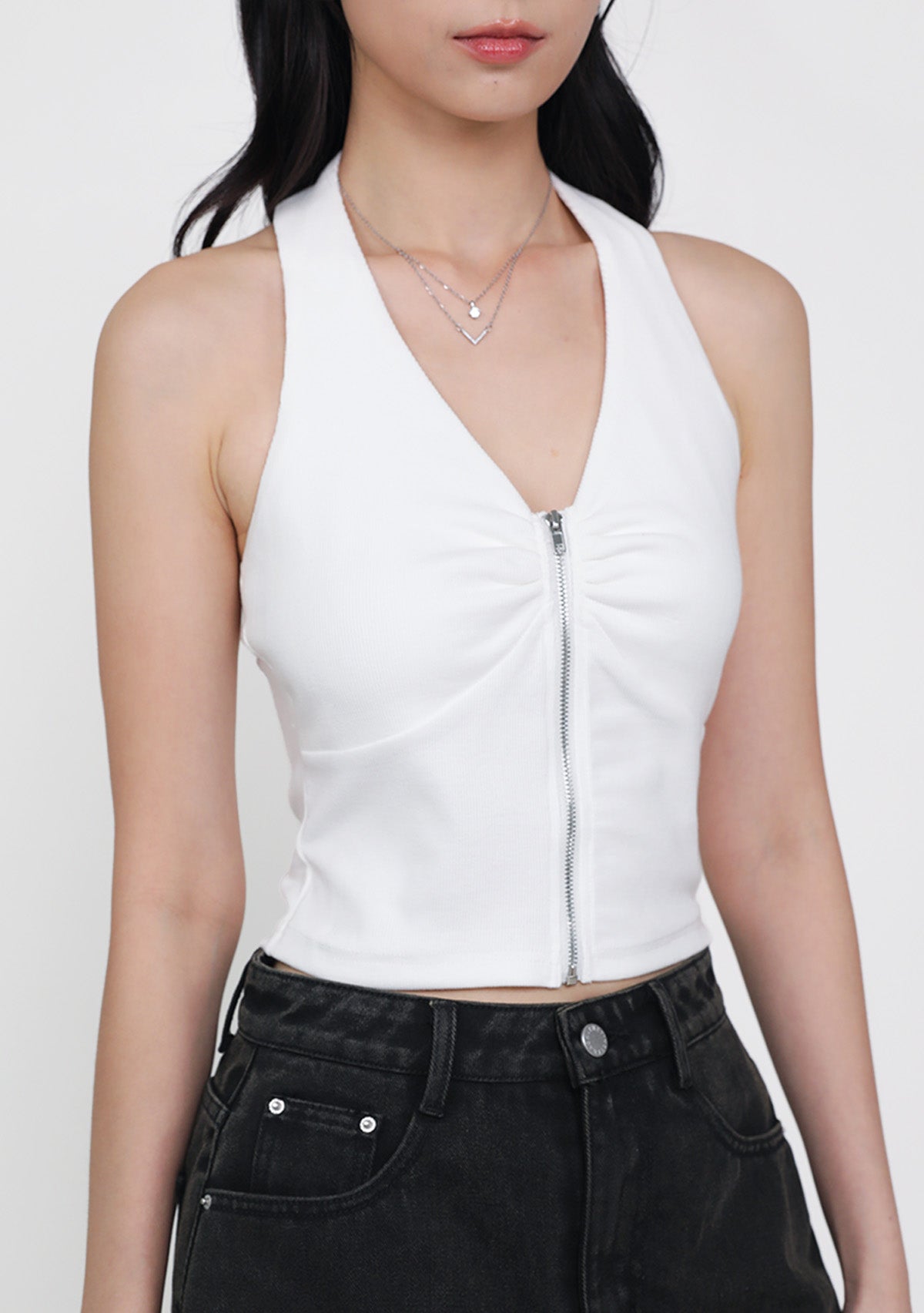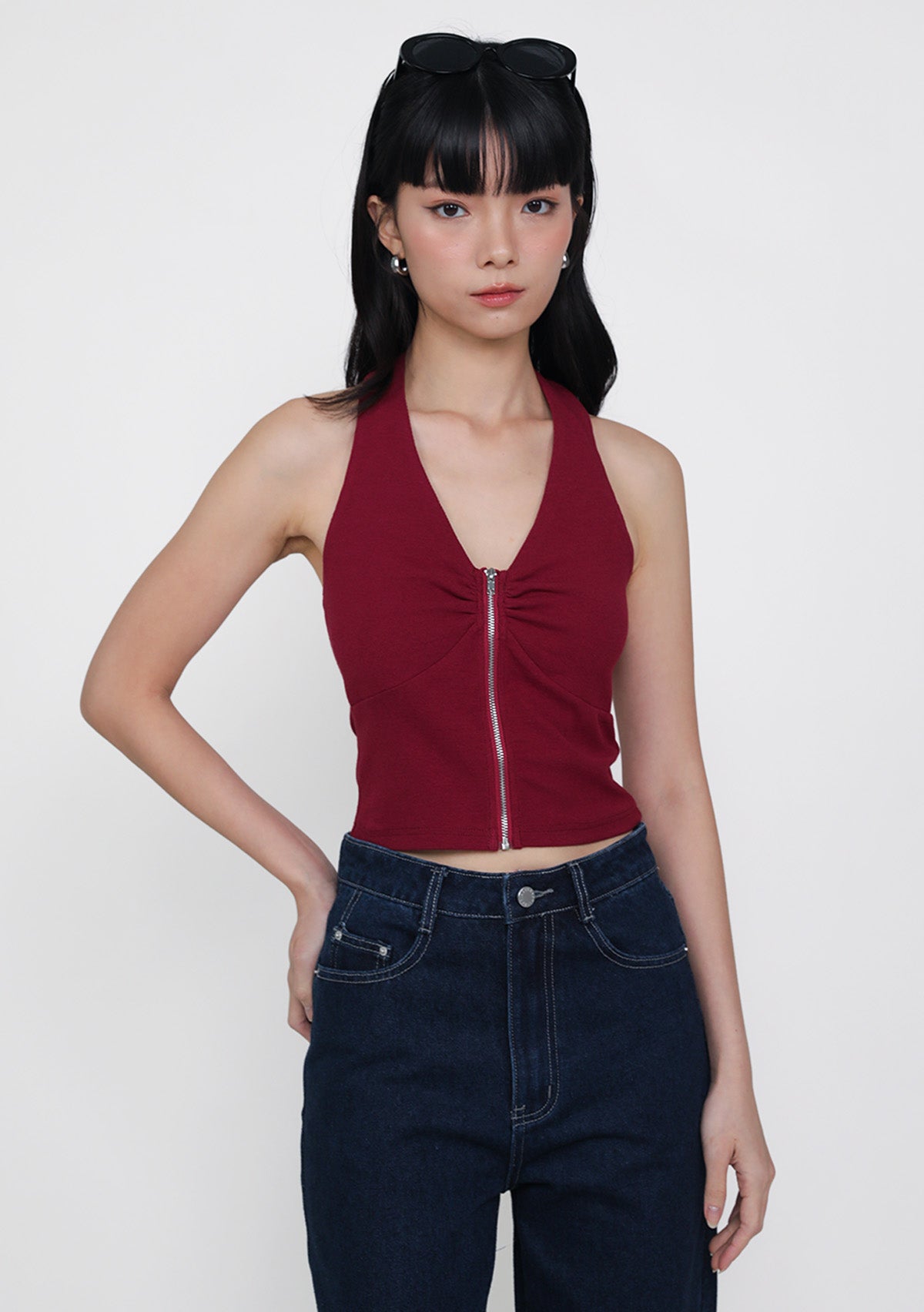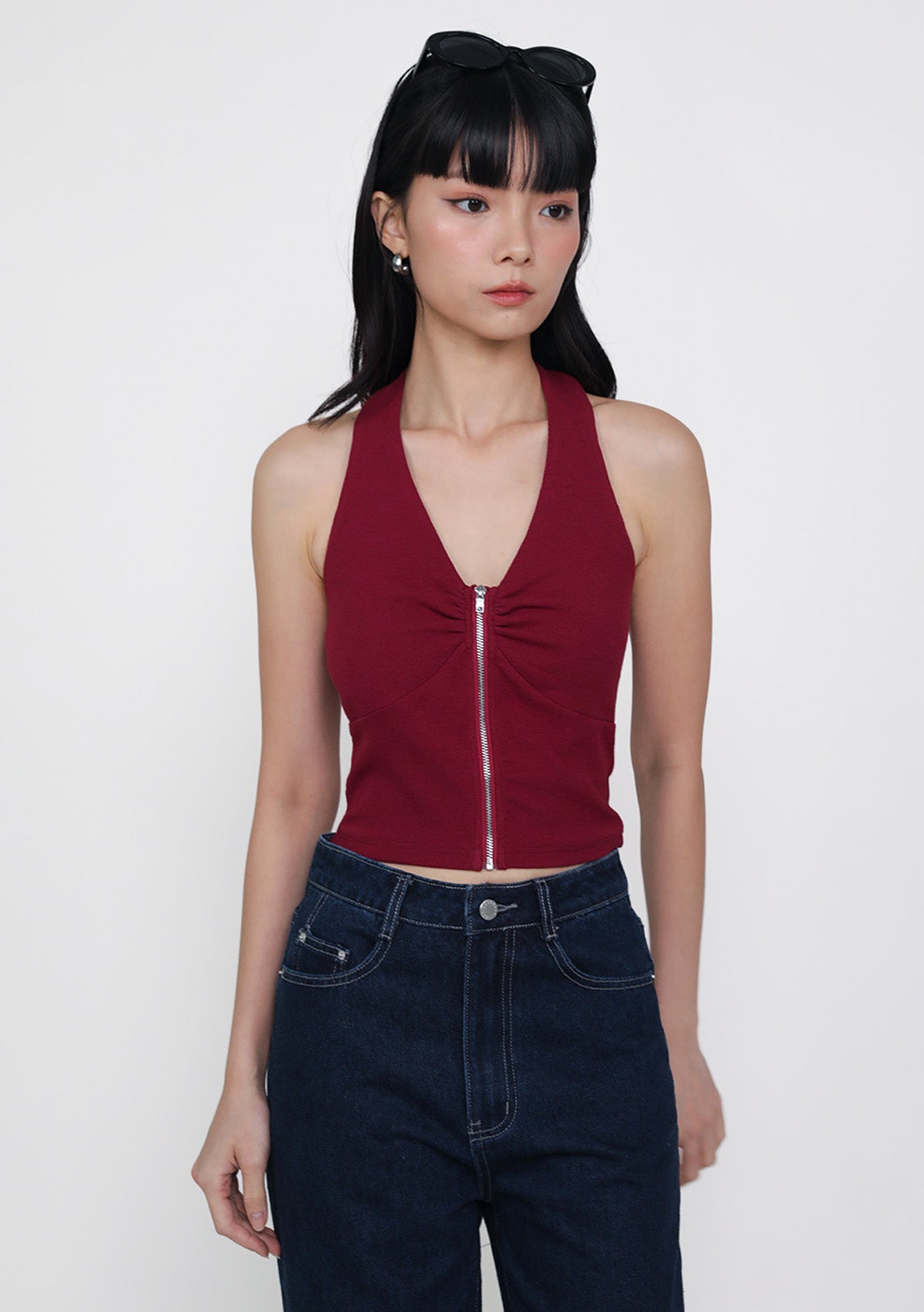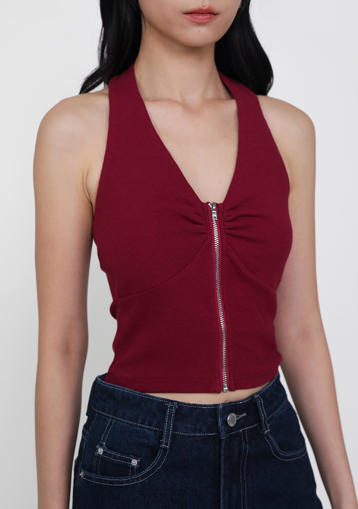 Marielle Zip Up Padded Halter Top features a sporty halter design, removable padding, and front zip—stretchy, comfortable, and effortlessly flattering.