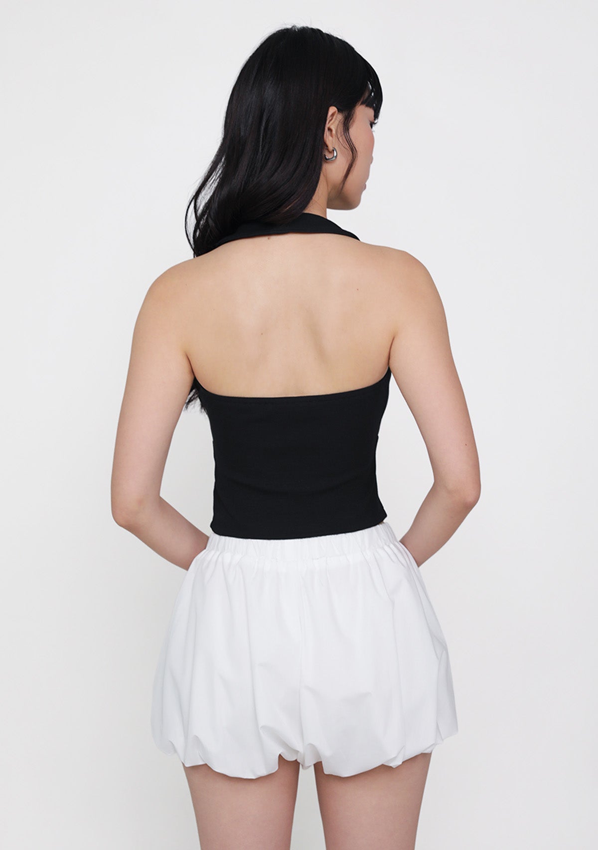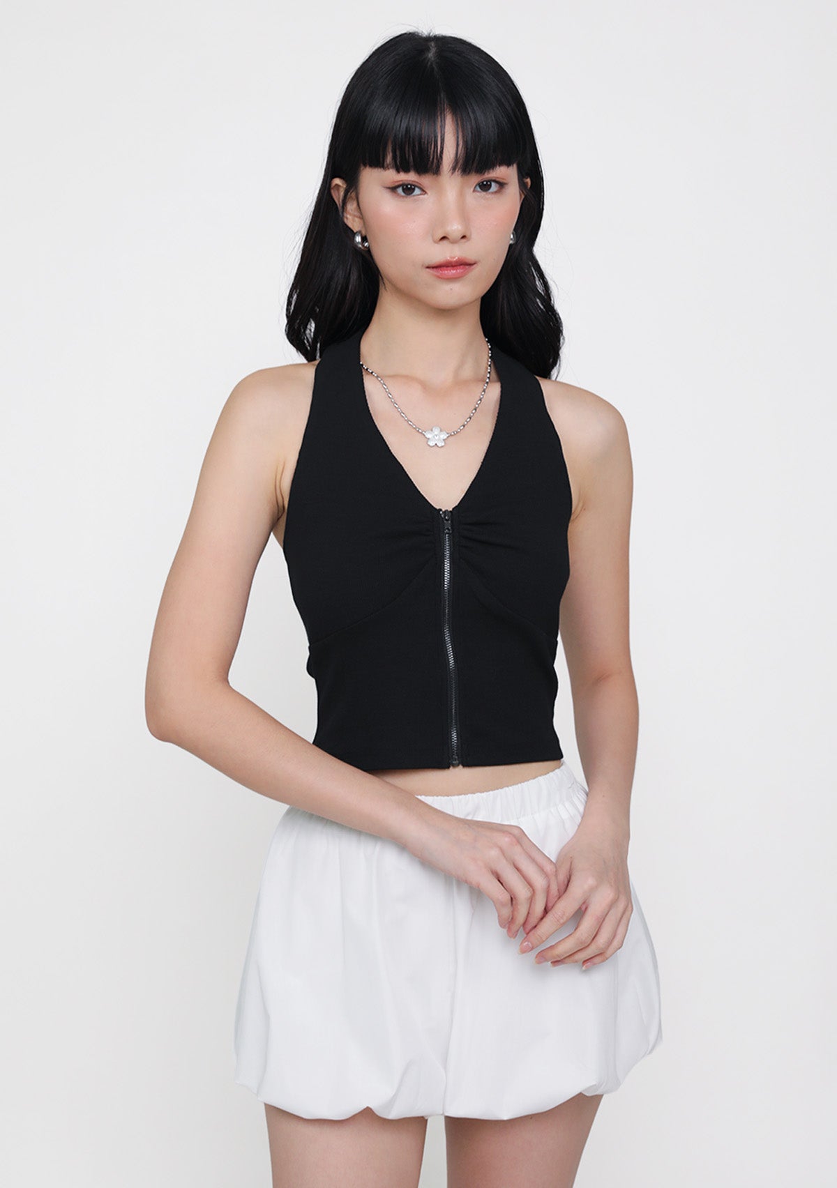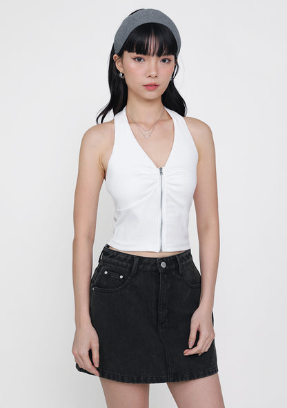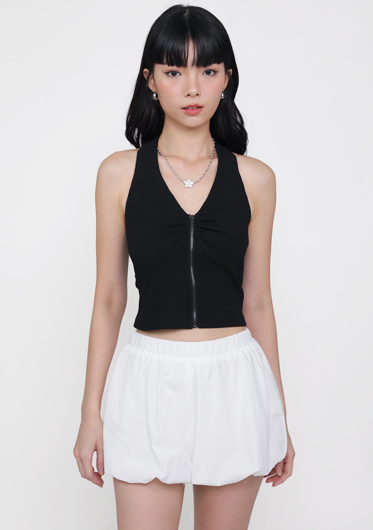 Marielle Zip Up Padded Halter Top features a sporty halter design, removable padding, and front zip—stretchy, comfortable, and effortlessly flattering.