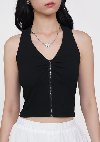 This Zip Up Padded Halter Top is style with ease in mind. Designed with a functional exposed front zip and removable paddings, it offers a secure, flattering fit while highlighting the shoulders and neckline. Made with soft, stretchy fabric, it’s perfect for both casual and active styling.