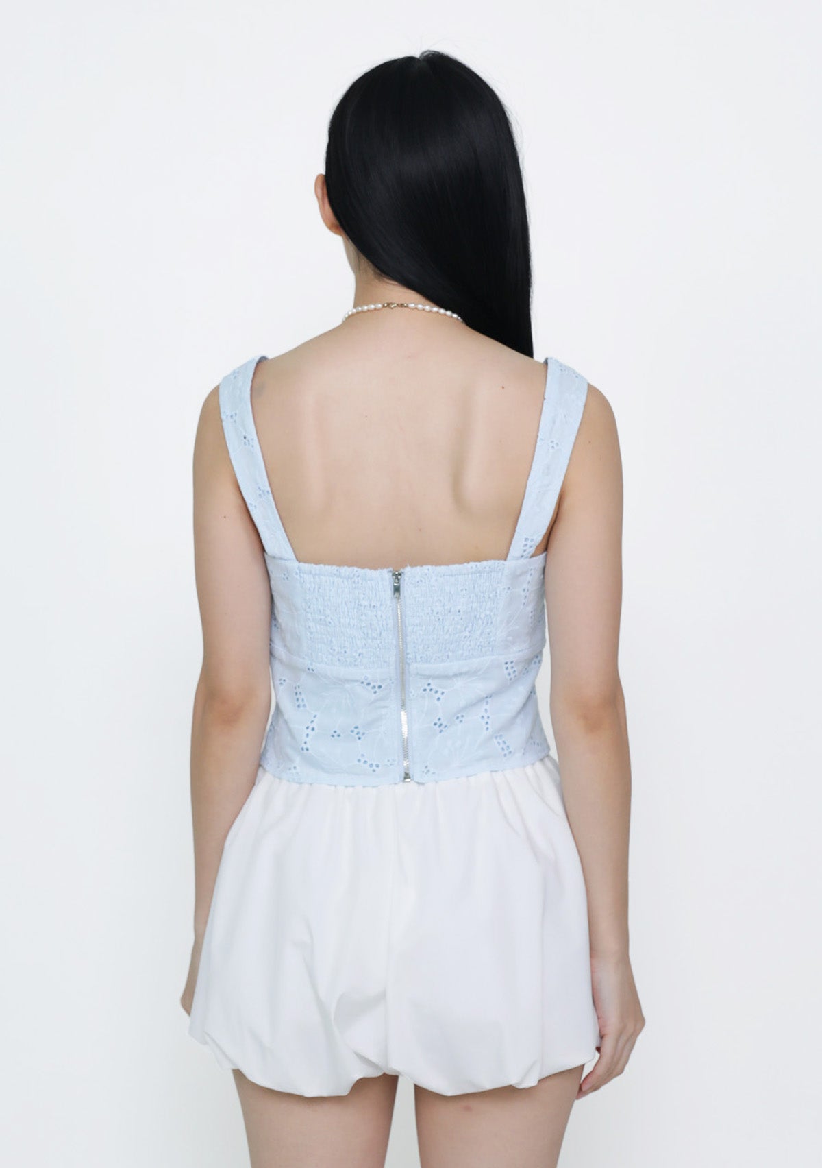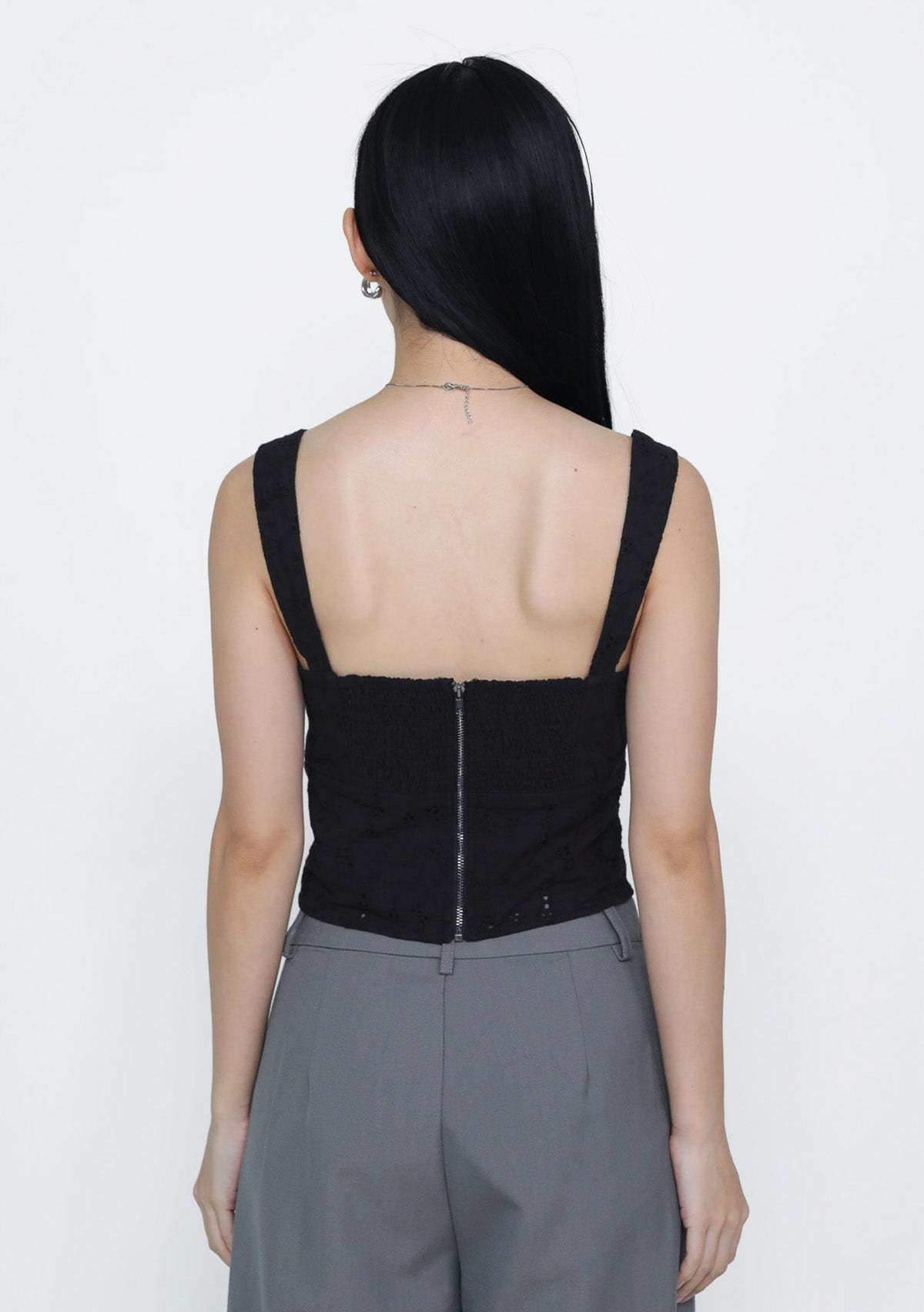 Caity Eyelet Top has straight neckline and ruched bust creating that flattering shape, while the cropped cut pairs perfectly with high-waisted bottoms. Smocked at the back with an exposed zip for a clean, secure fit.