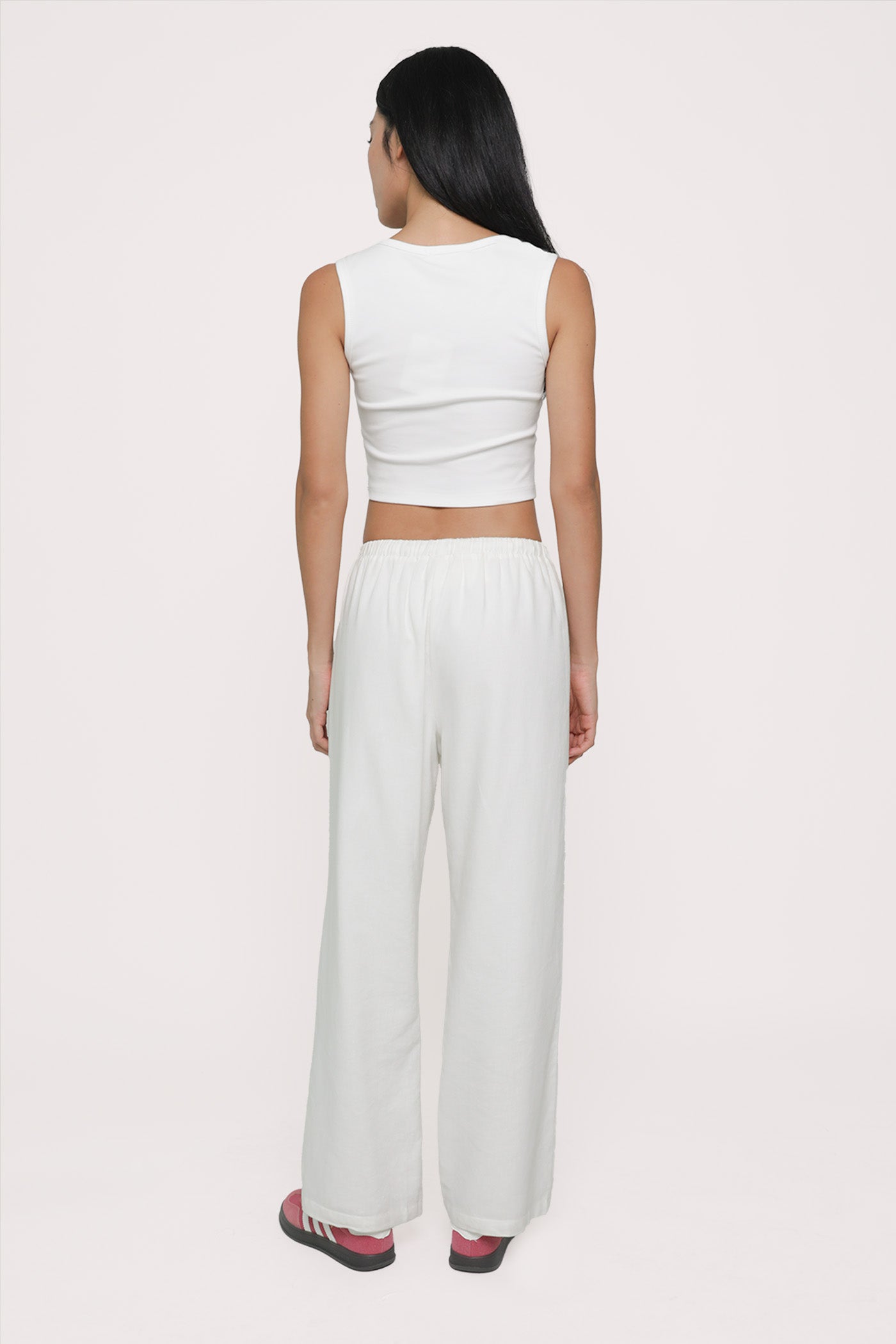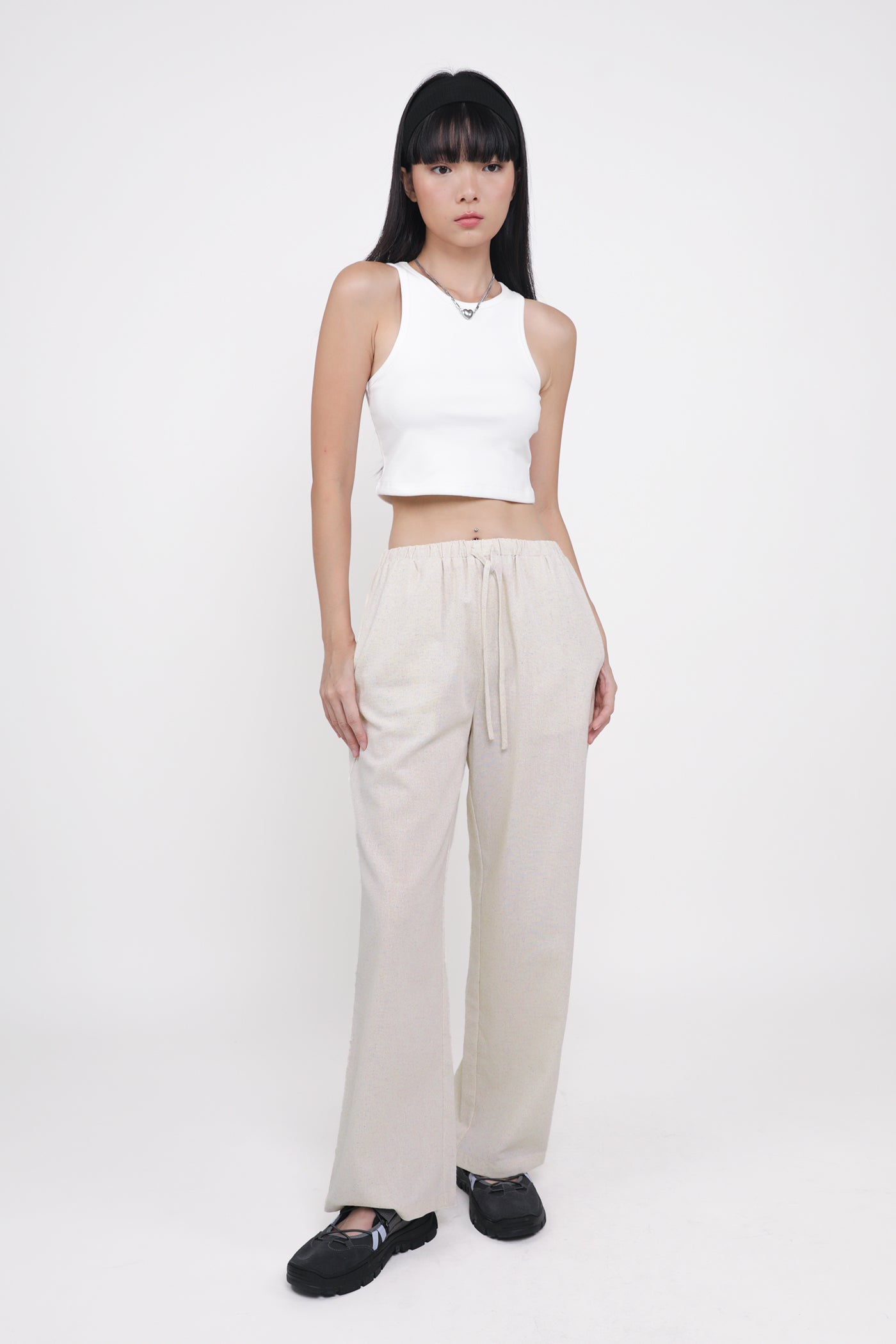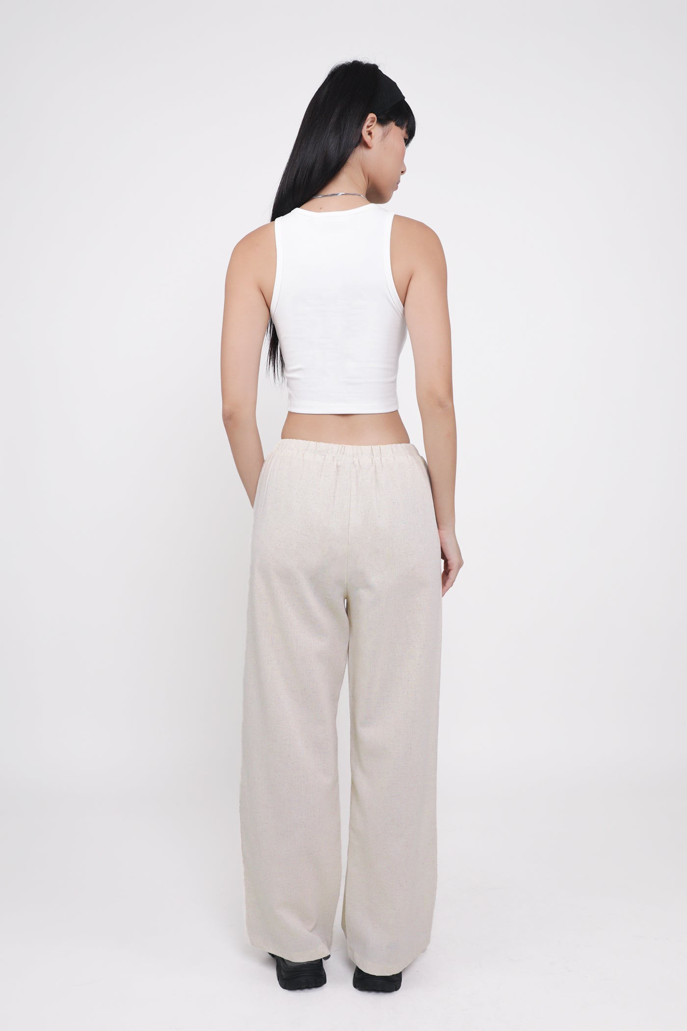 These pants are made of non lined linen material for a light and breathable fit. It is complete with functional side pockets (except White) and a drawstring at the waist.