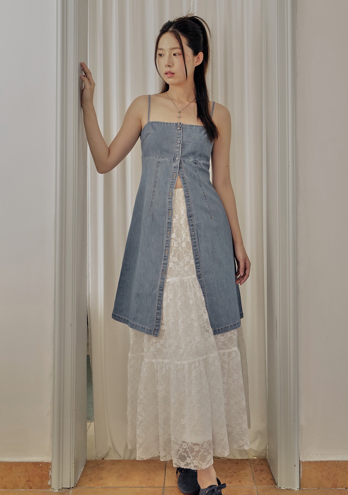 This top is made of cotton denim. It is non-lined and features functional front buttons with adjustable straps.