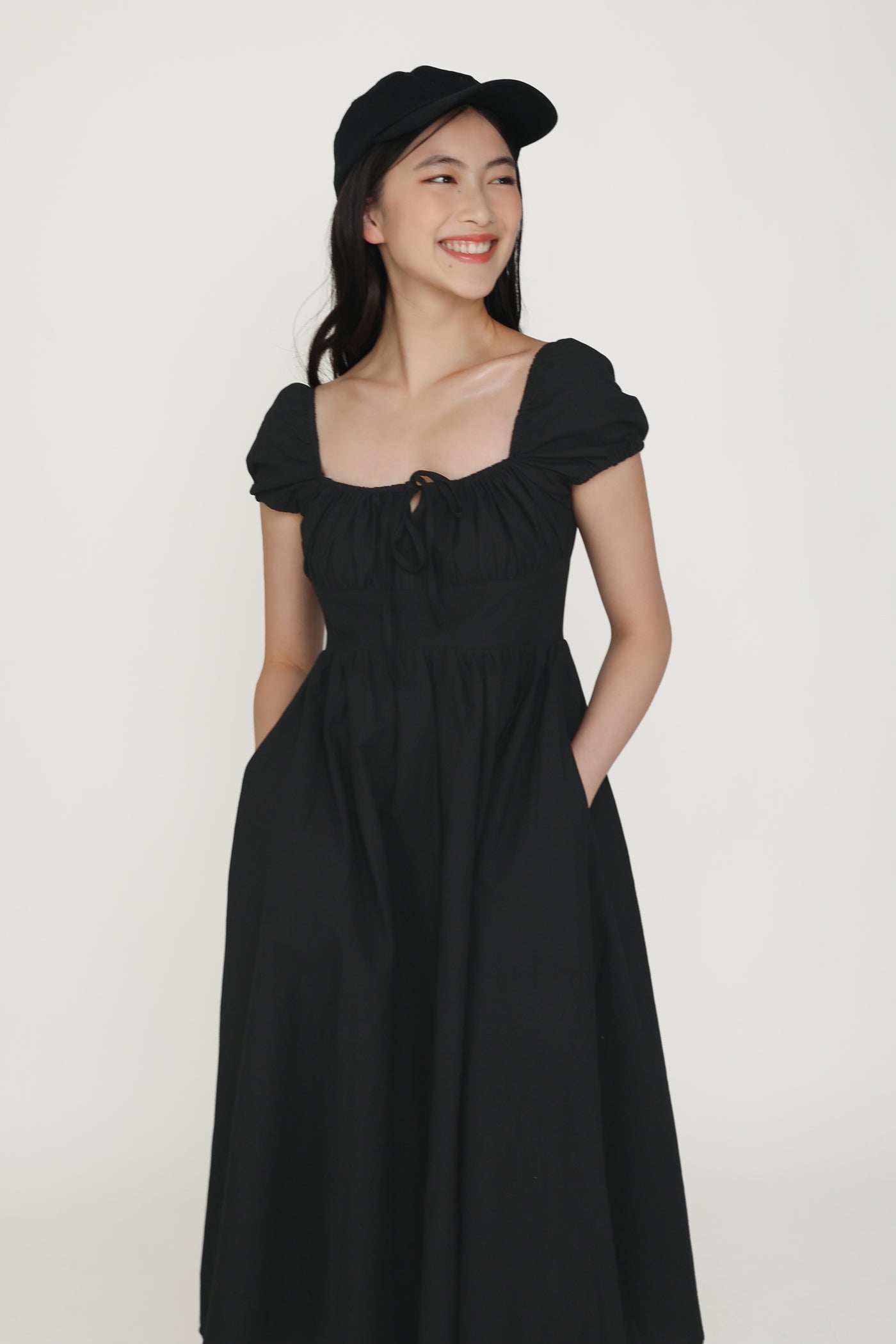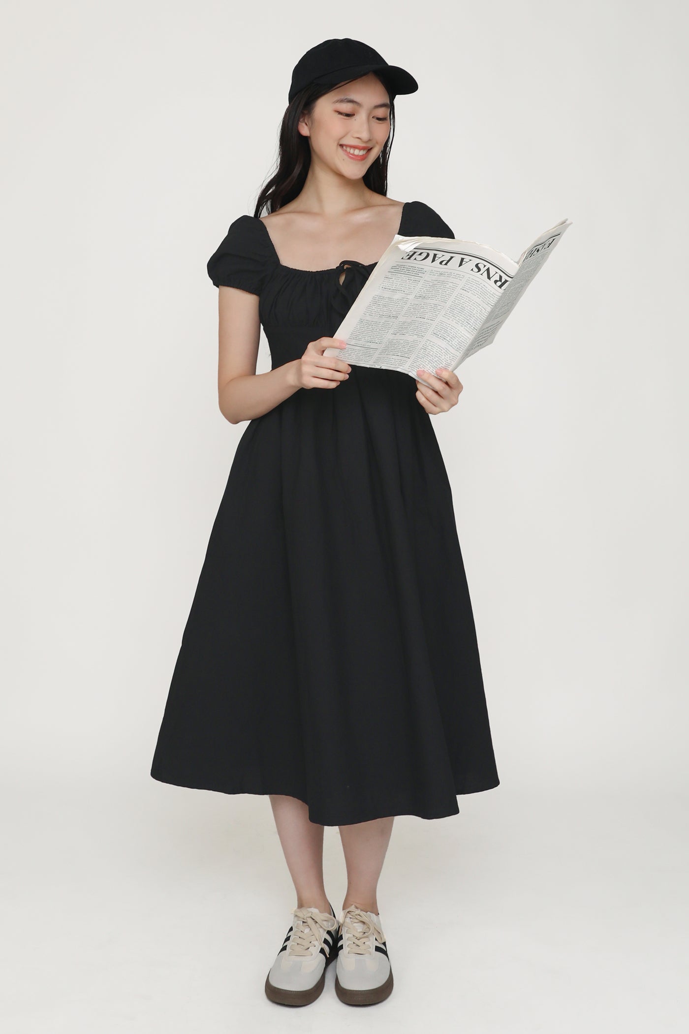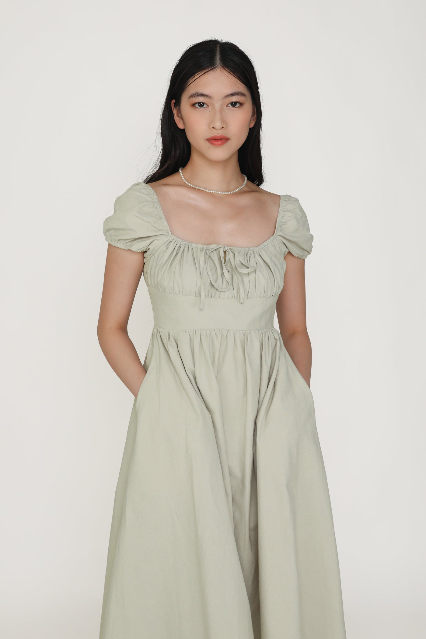This dress is made of inner lined cotton linen material for a light and breathable fit. It is complete with functional side pockets, a concealed back zip, elasticised sleeves, and a elasticised neckline.