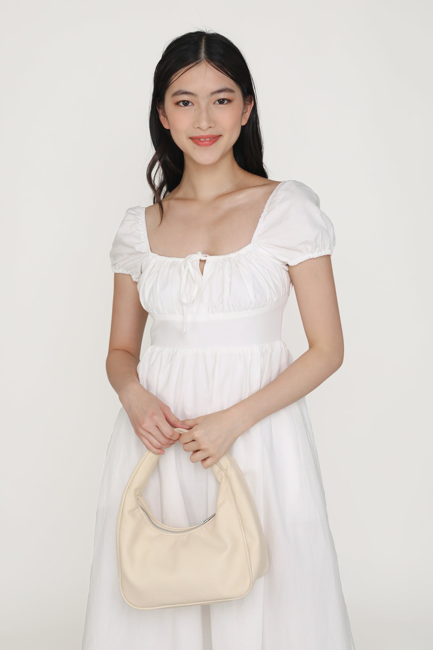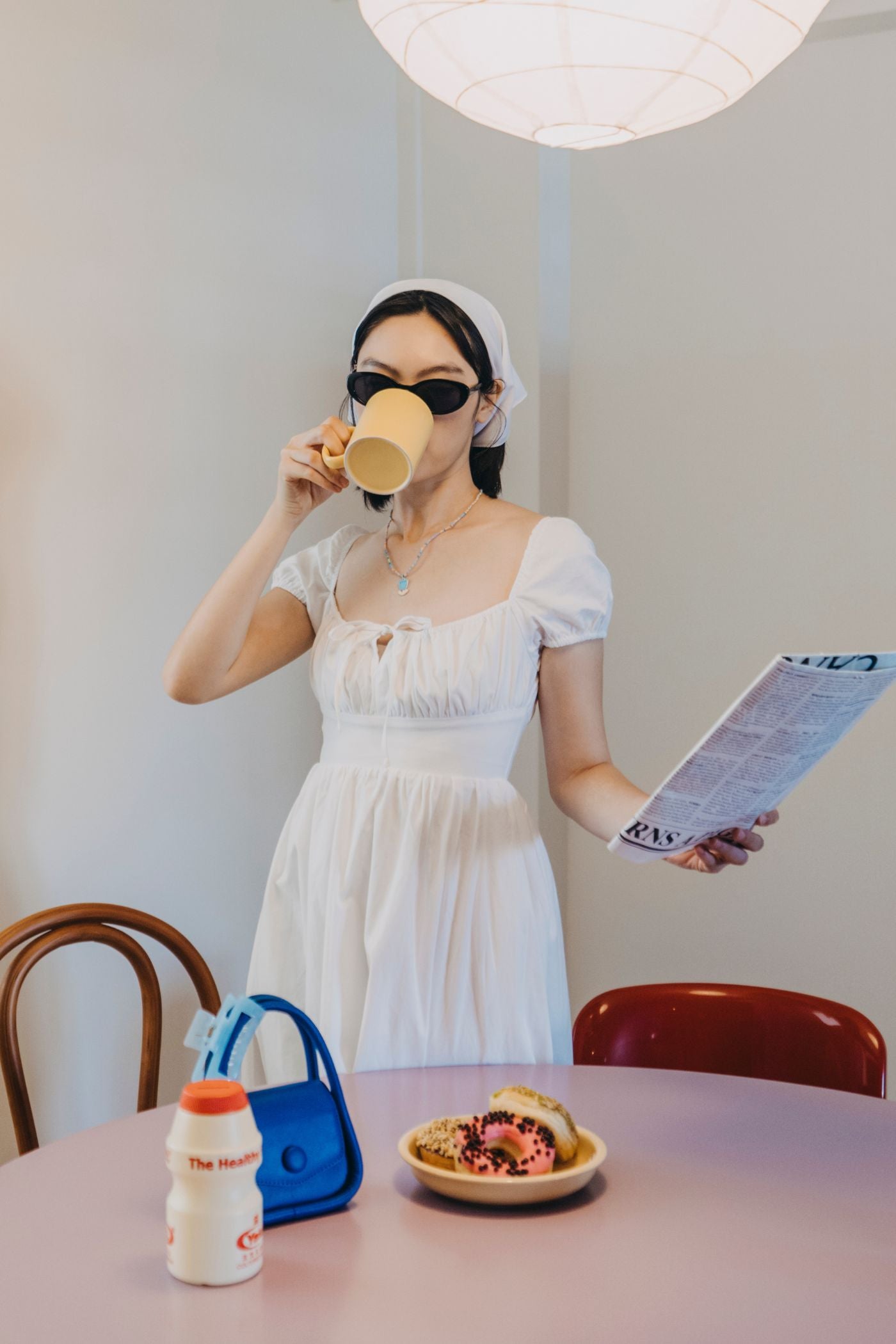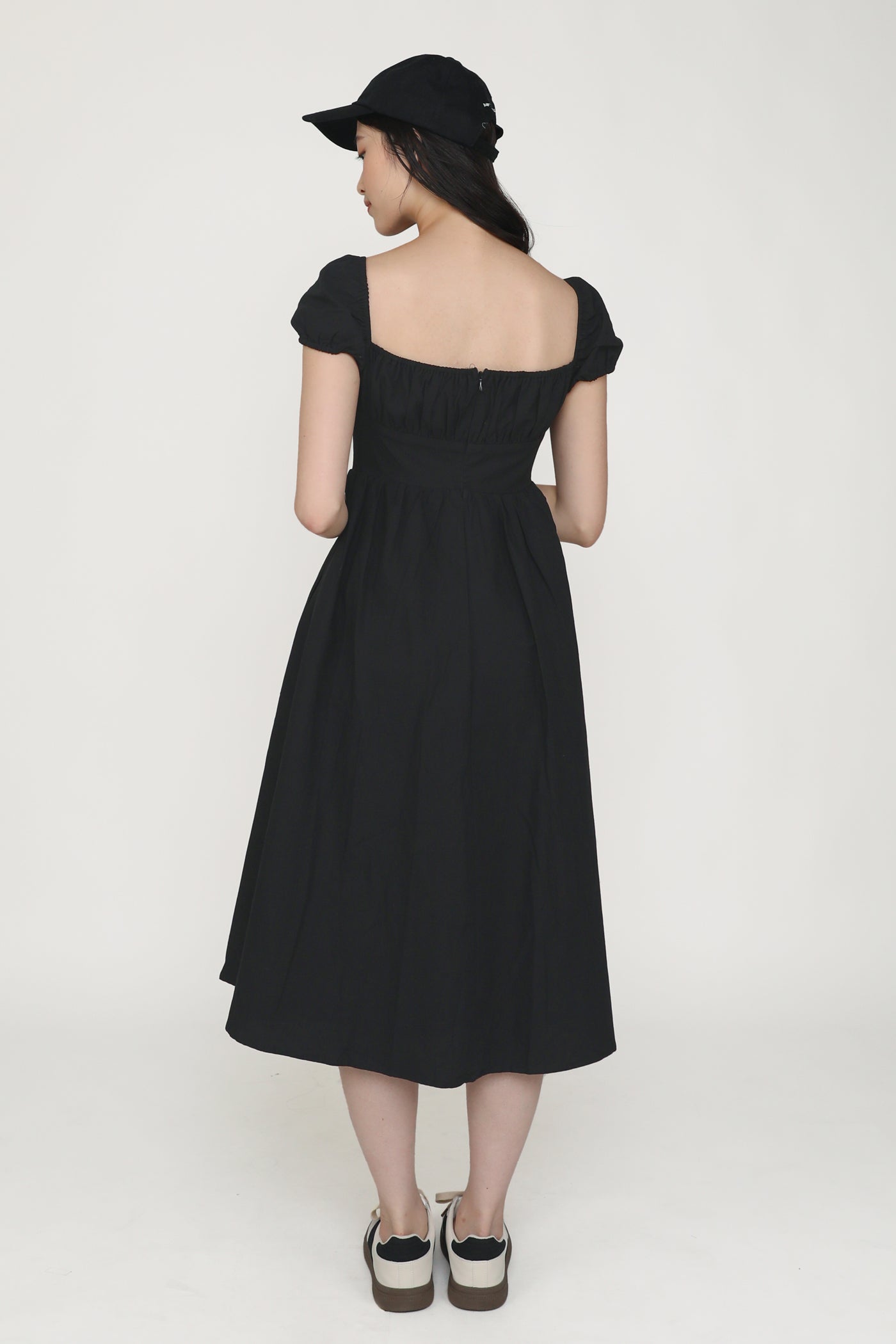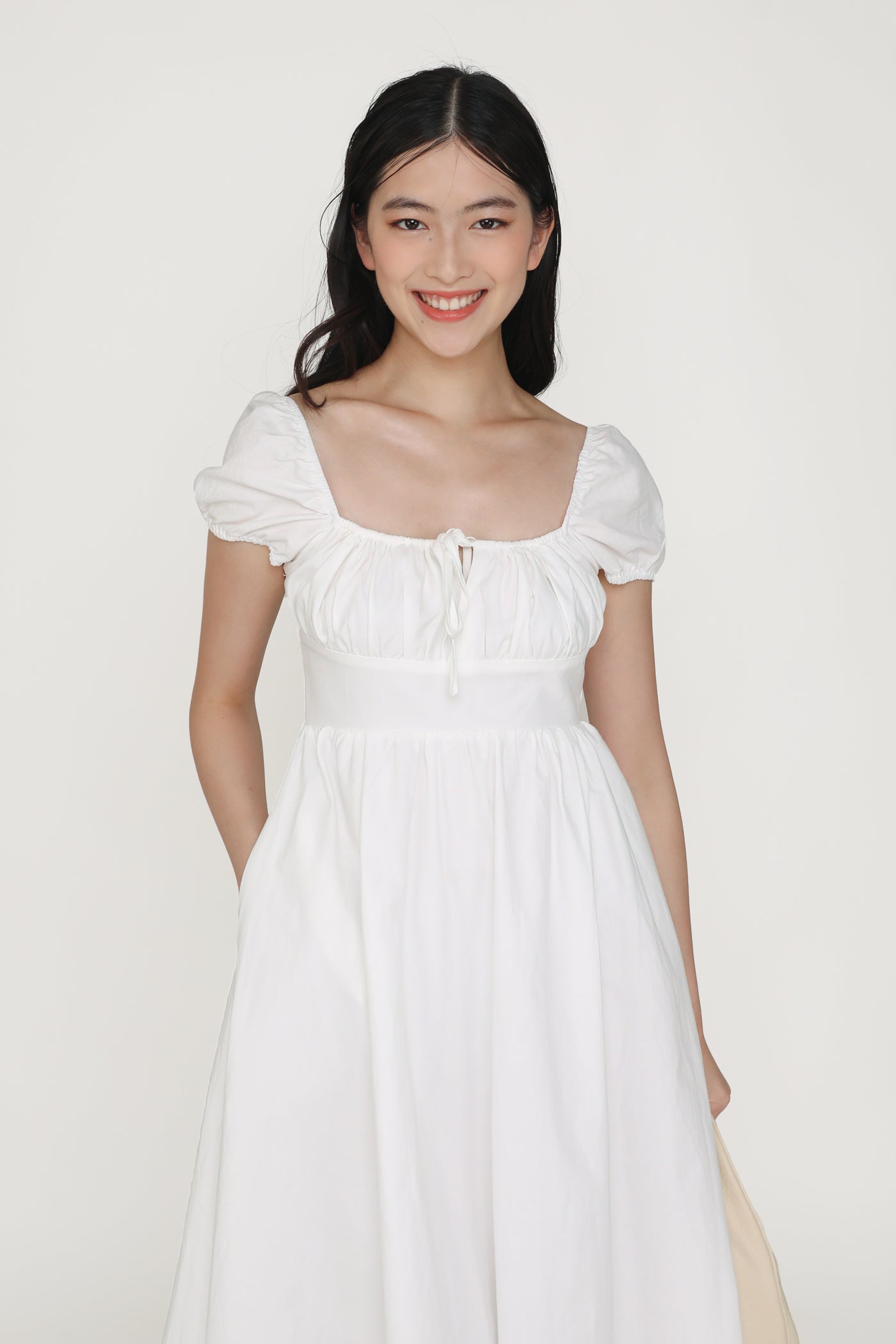 This dress is made of inner lined cotton linen material for a light and breathable fit. It is complete with functional side pockets, a concealed back zip, elasticised sleeves, and a elasticised neckline.
