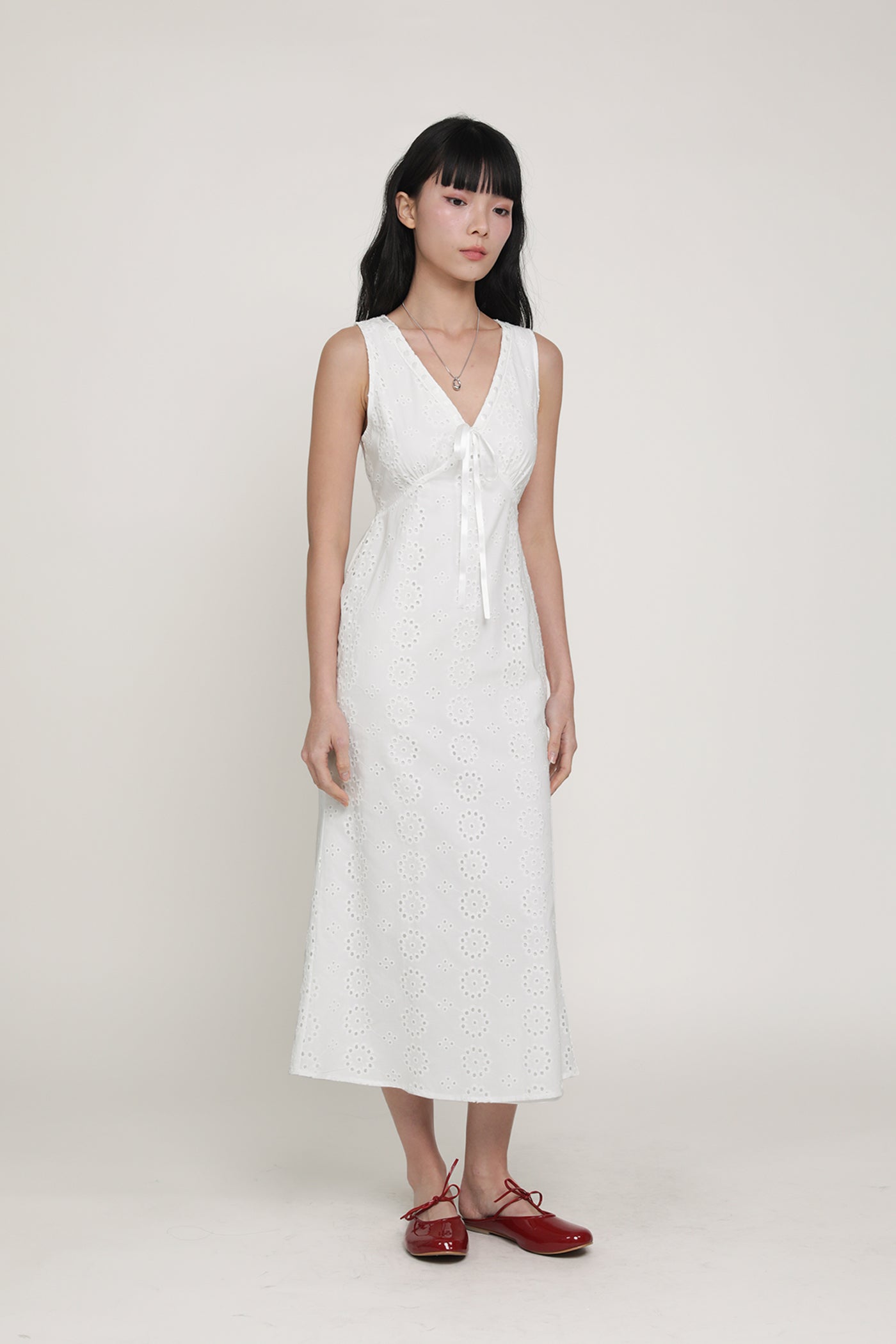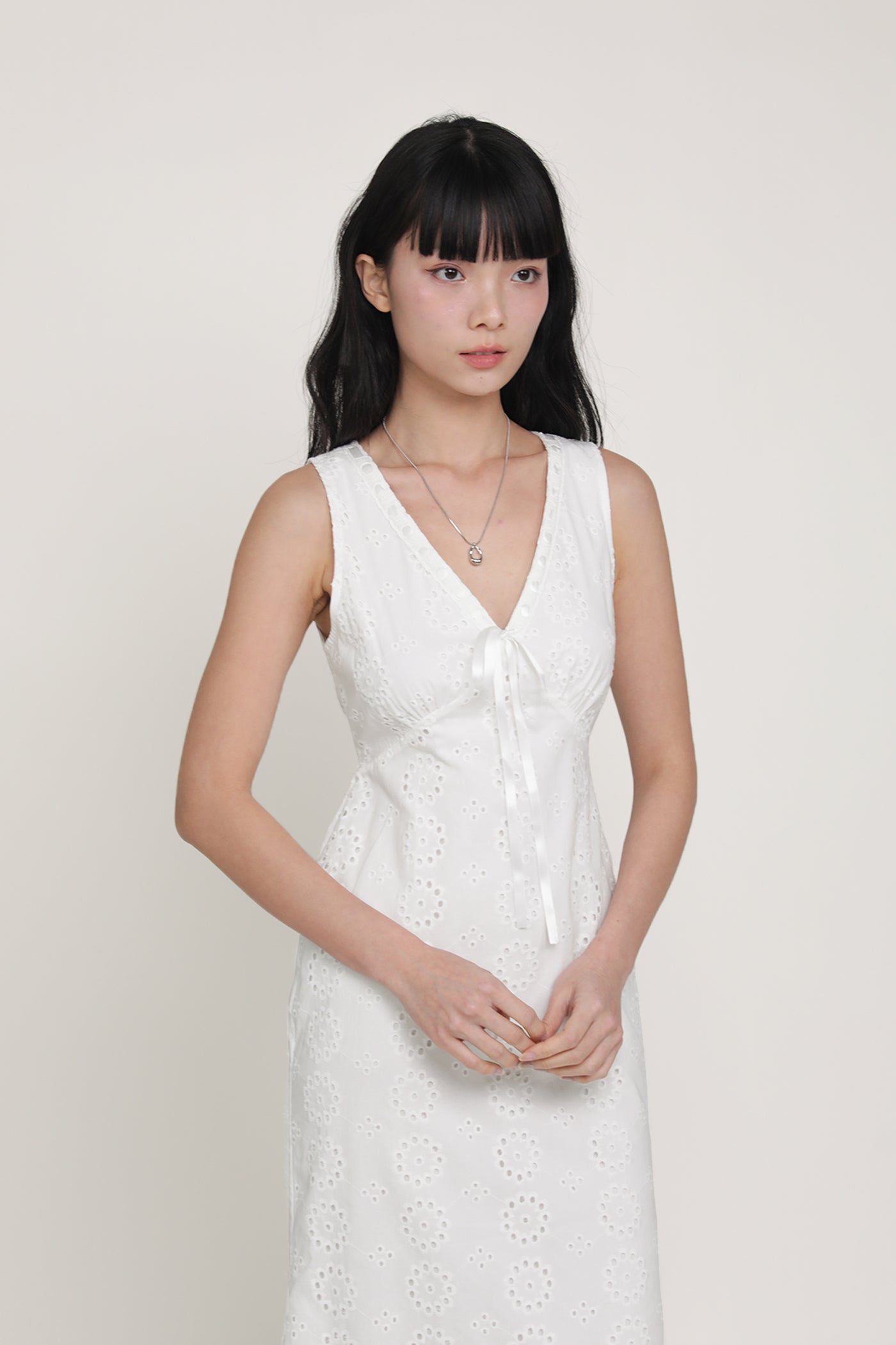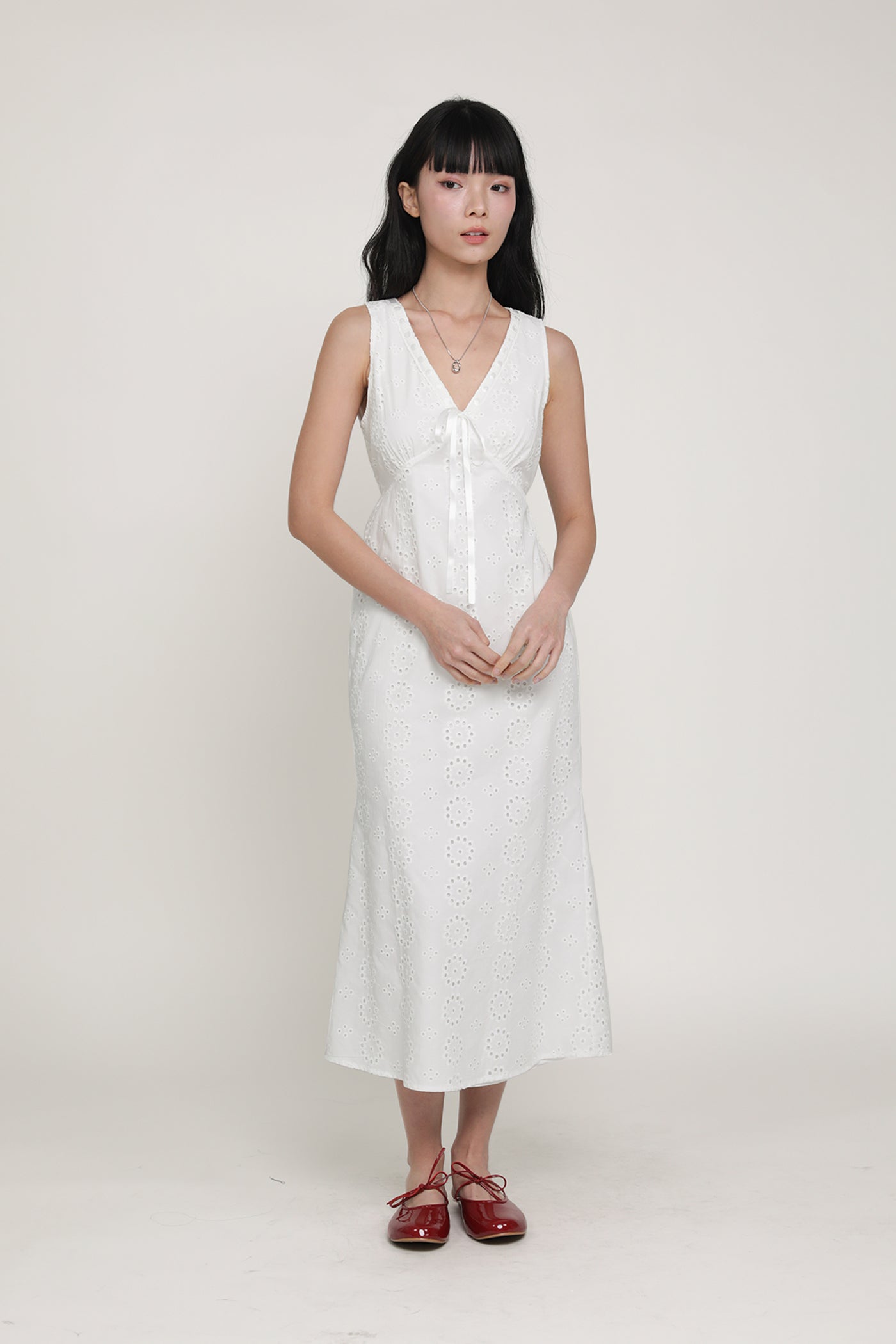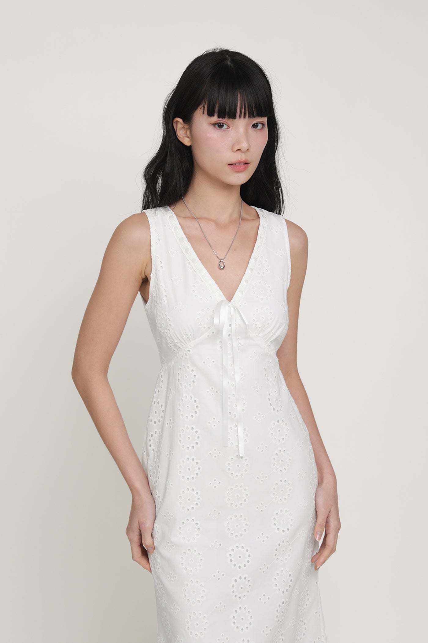 Step into sunshine with the Janice Eyelet Midi Dress. With its light, airy eyelet fabric, this dress is as breezy as it is beautiful. The flattering V-neckline enhances the feminine silhouette, while the self-tie ribbon adds a delicate accent to the dress. Let Janice be your ticket to a minimal yet elevated style.