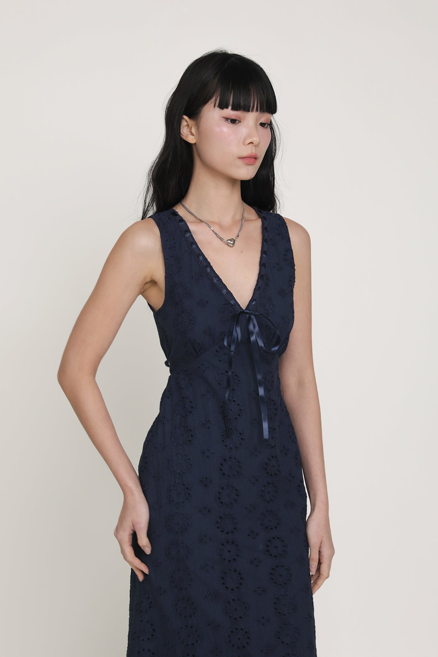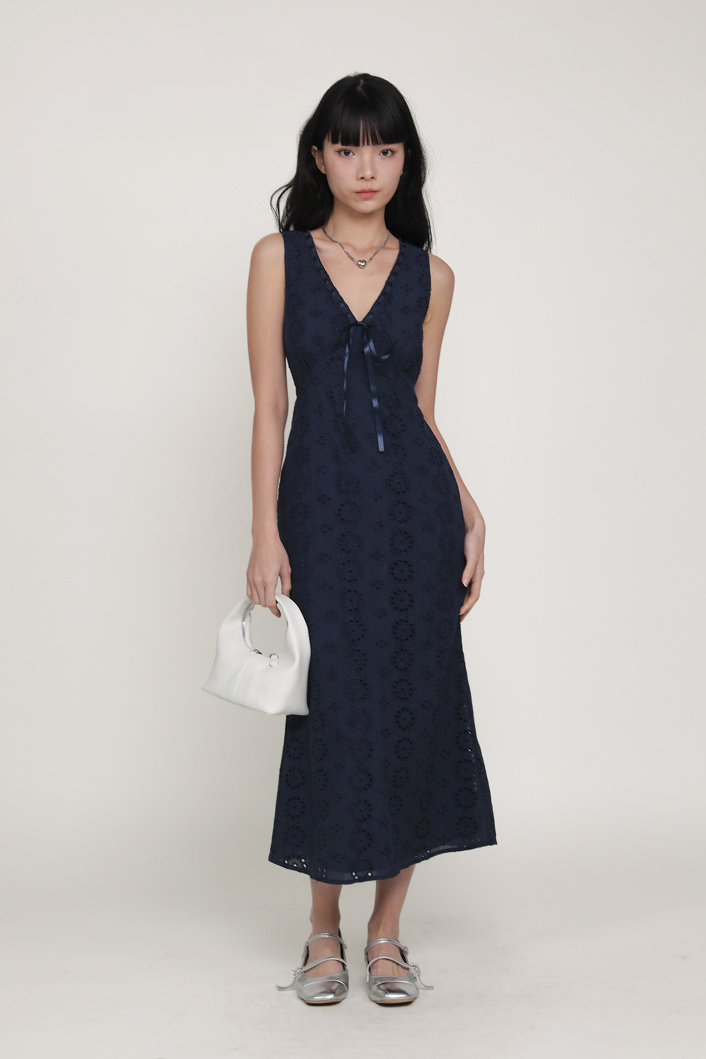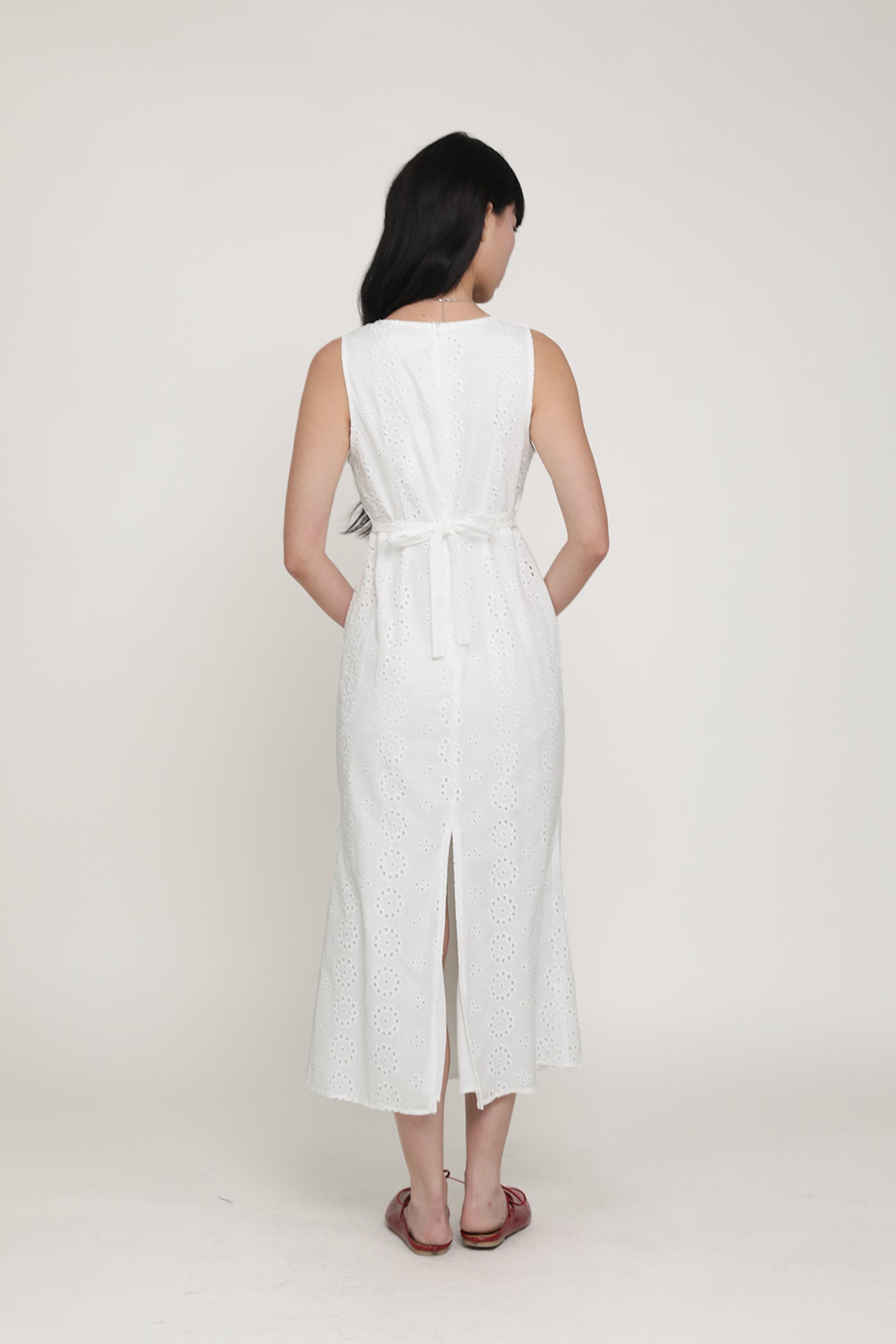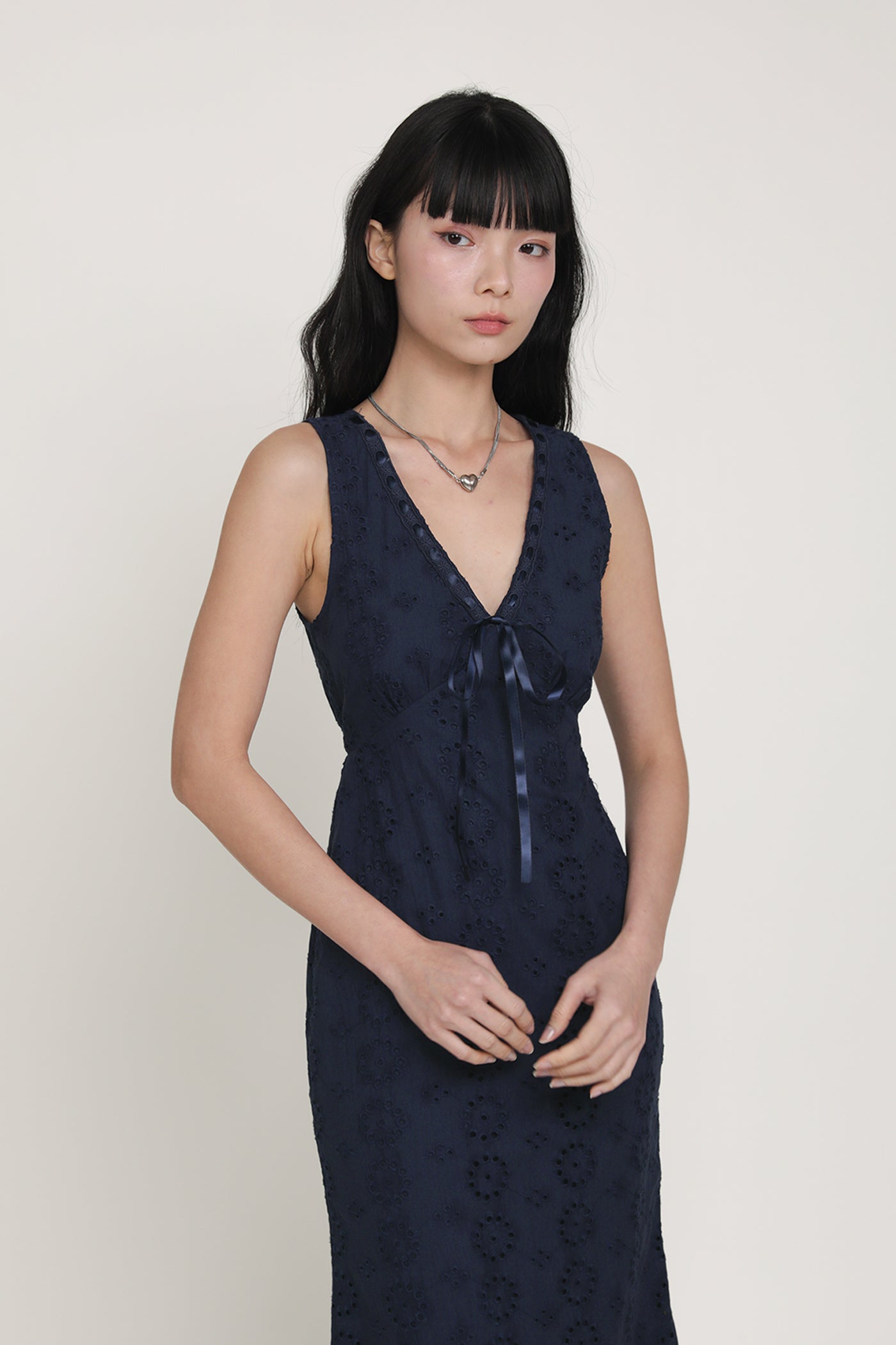 Step into sunshine with the Janice Eyelet Midi Dress. With its light, airy eyelet fabric, this dress is as breezy as it is beautiful. The flattering V-neckline enhances the feminine silhouette, while the self-tie ribbon adds a delicate accent to the dress. Let Janice be your ticket to a minimal yet elevated style.