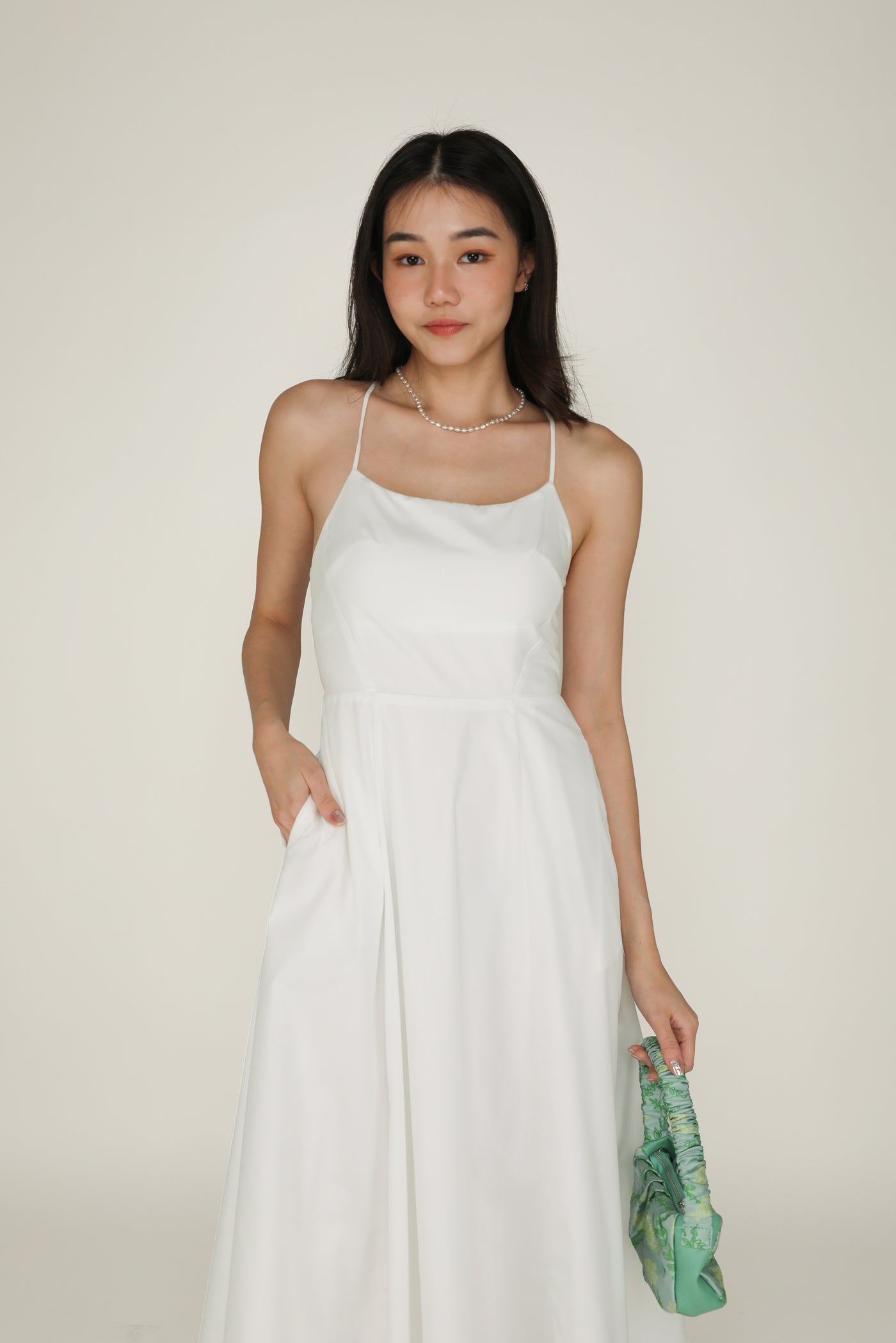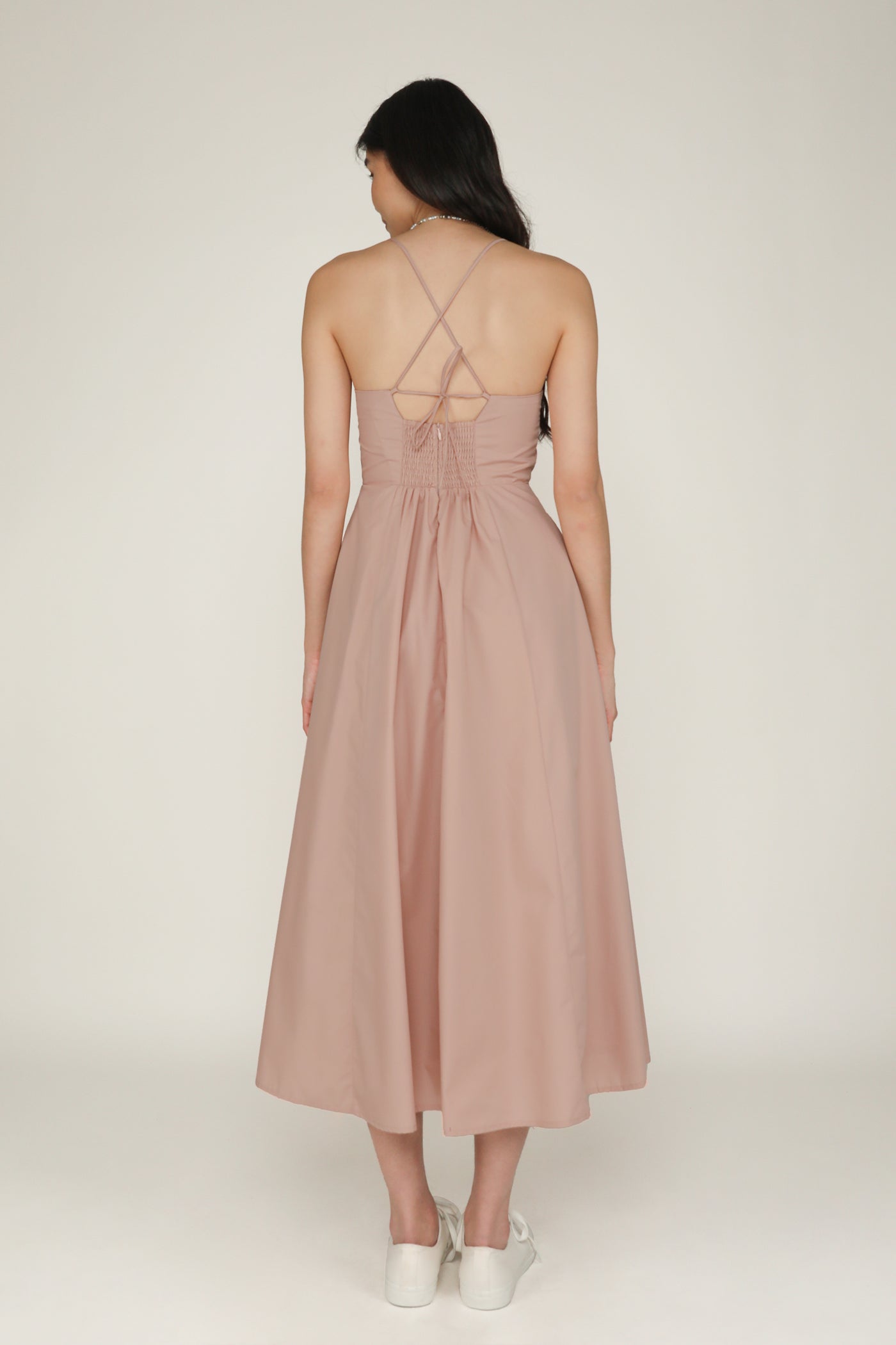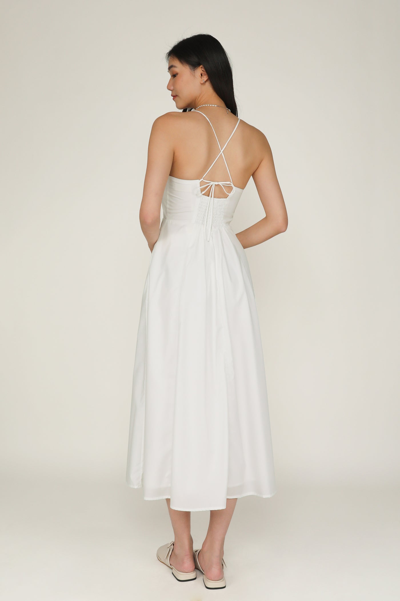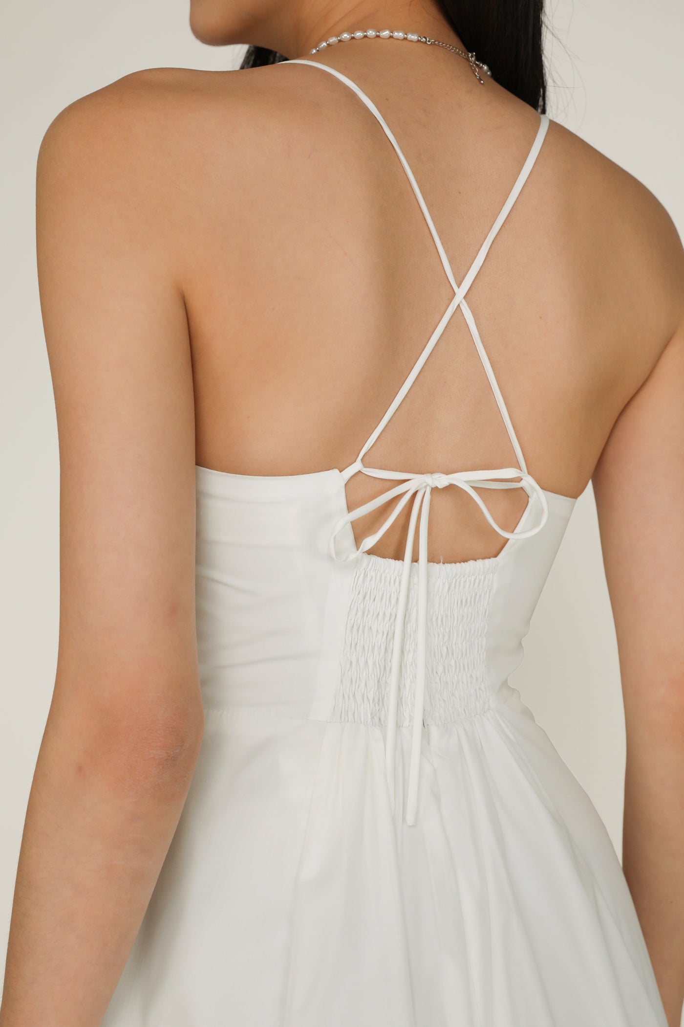 This dress is made of inner lined polyester cotton for a light and breathable fit. It is complete with removable paddings, self tie straps, smocked details at the back, and functional side pockets.