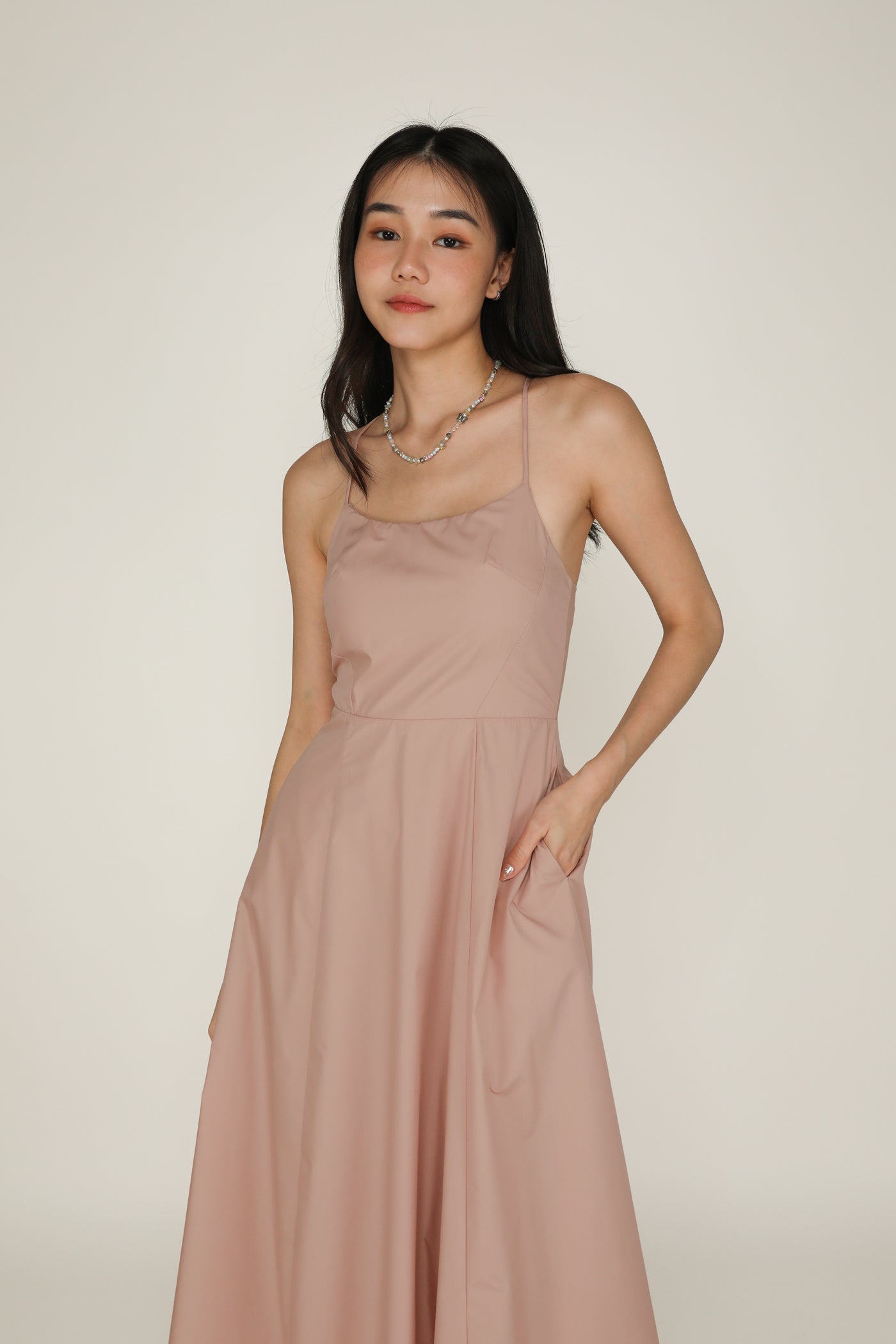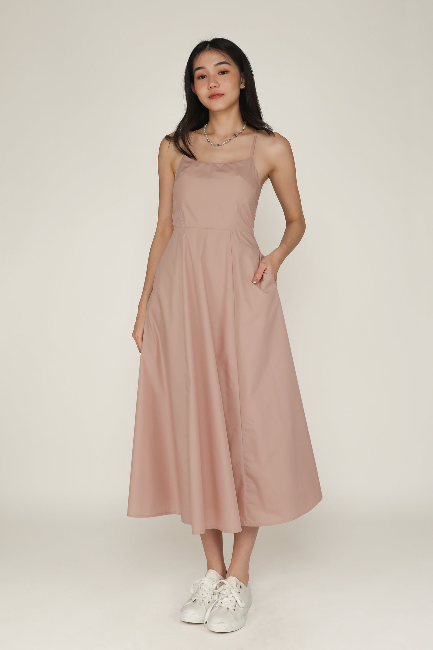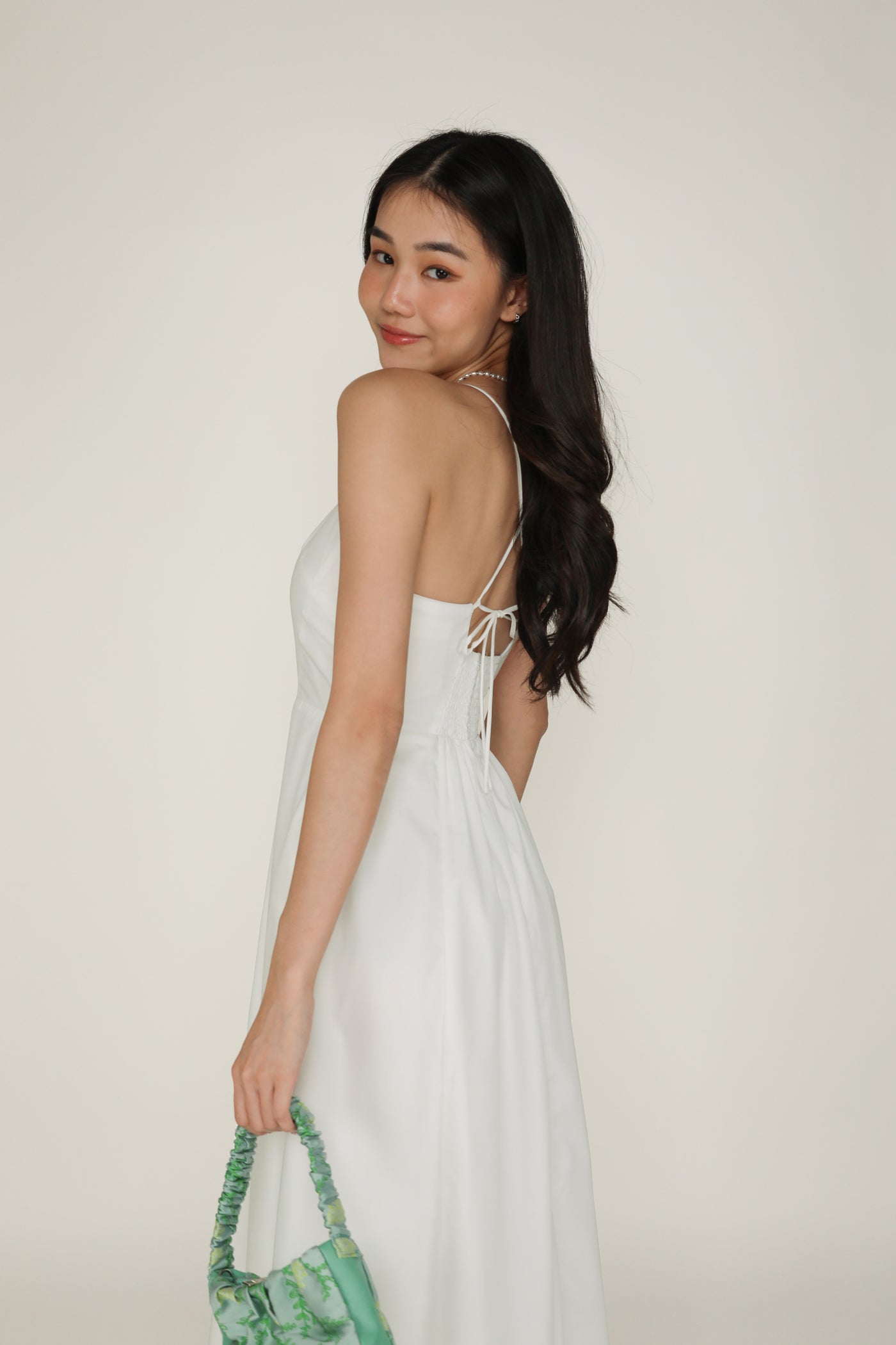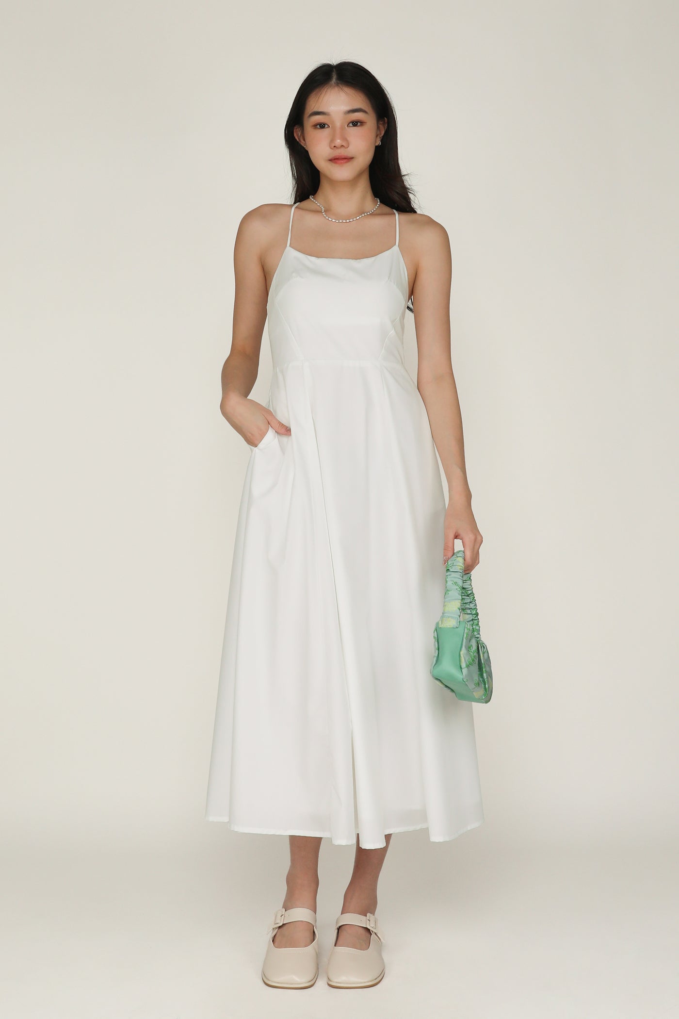 This dress is made of inner lined polyester cotton for a light and breathable fit. It is complete with removable paddings, self tie straps, smocked details at the back, and functional side pockets.
