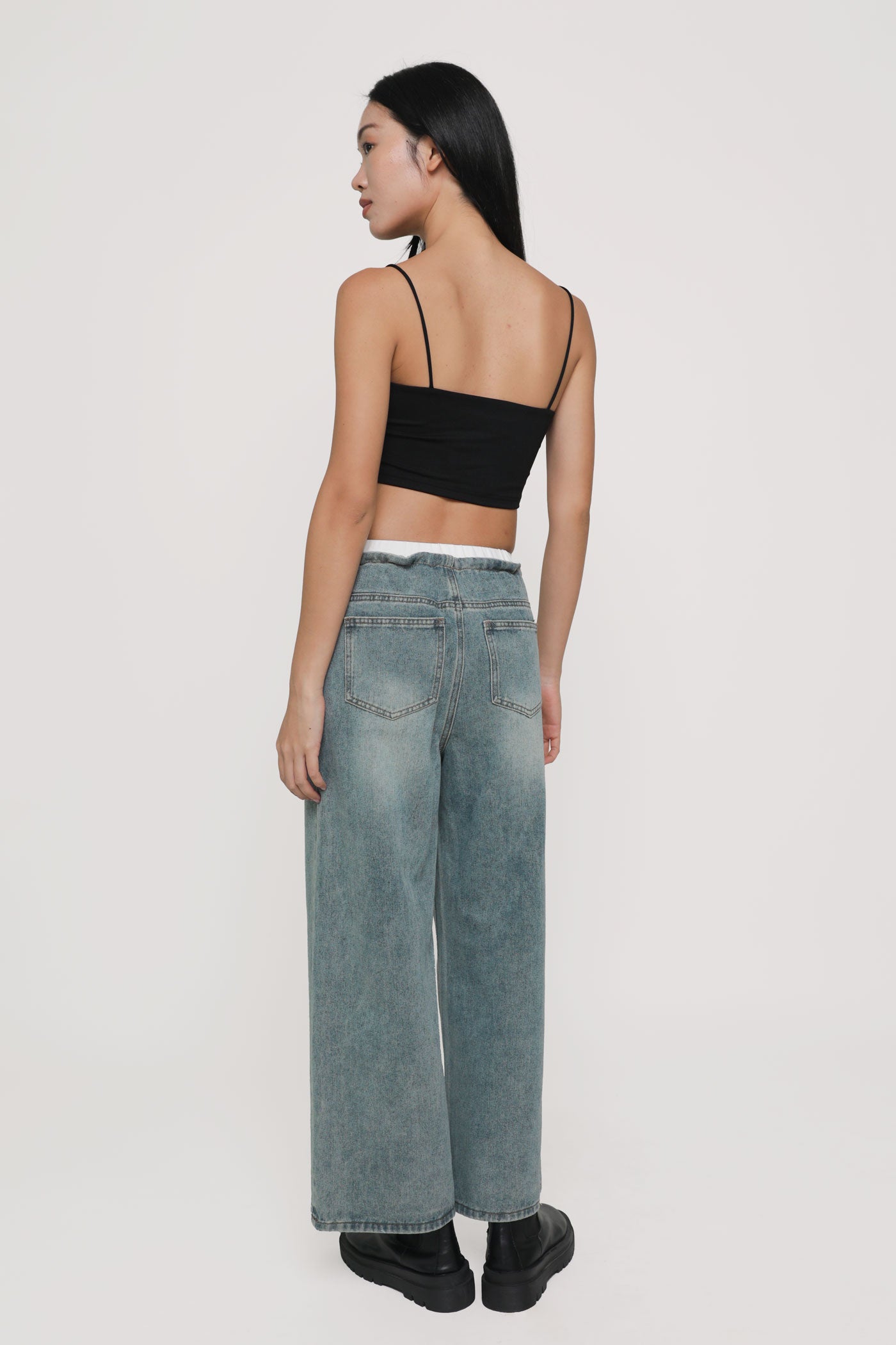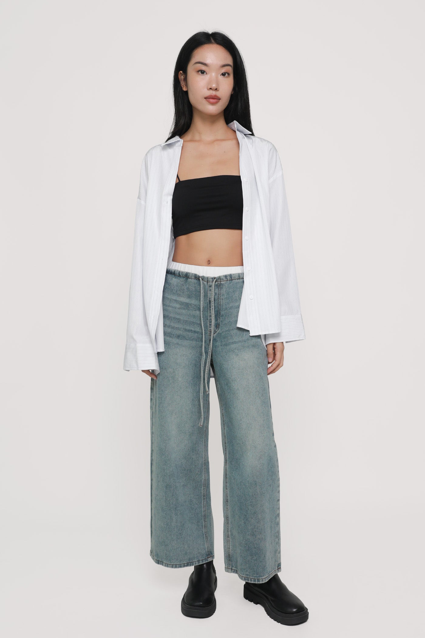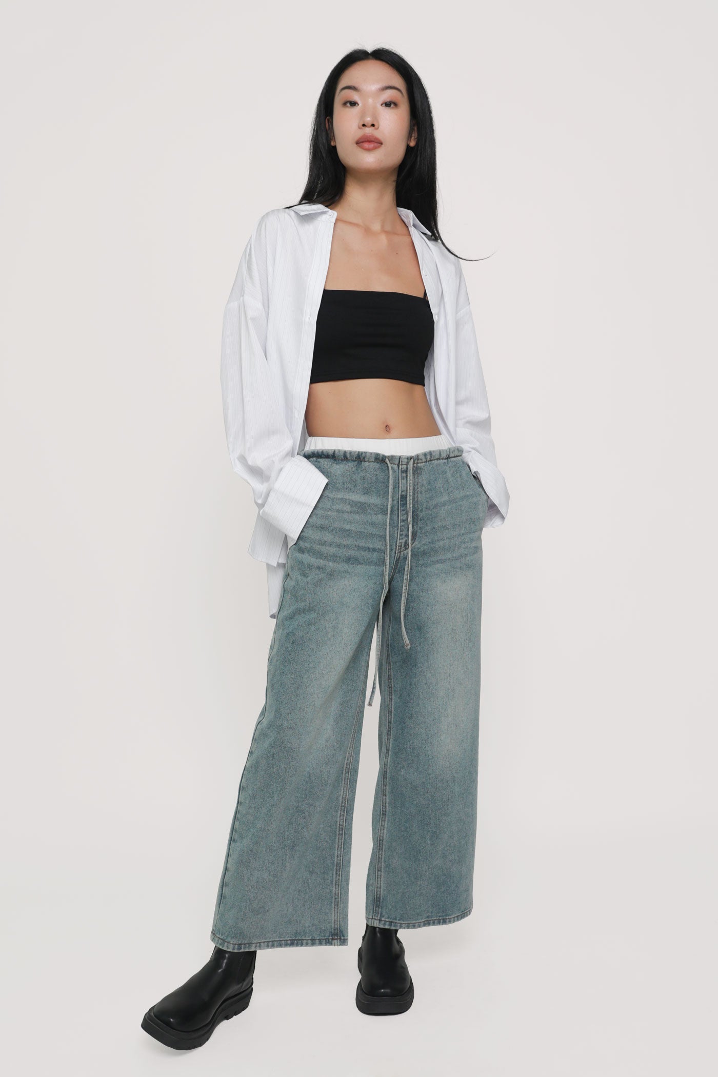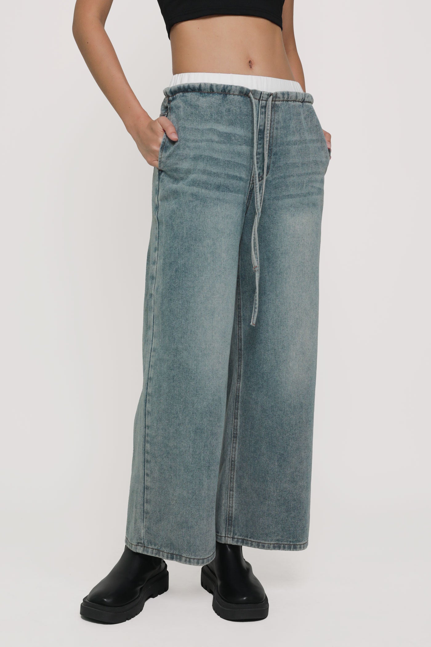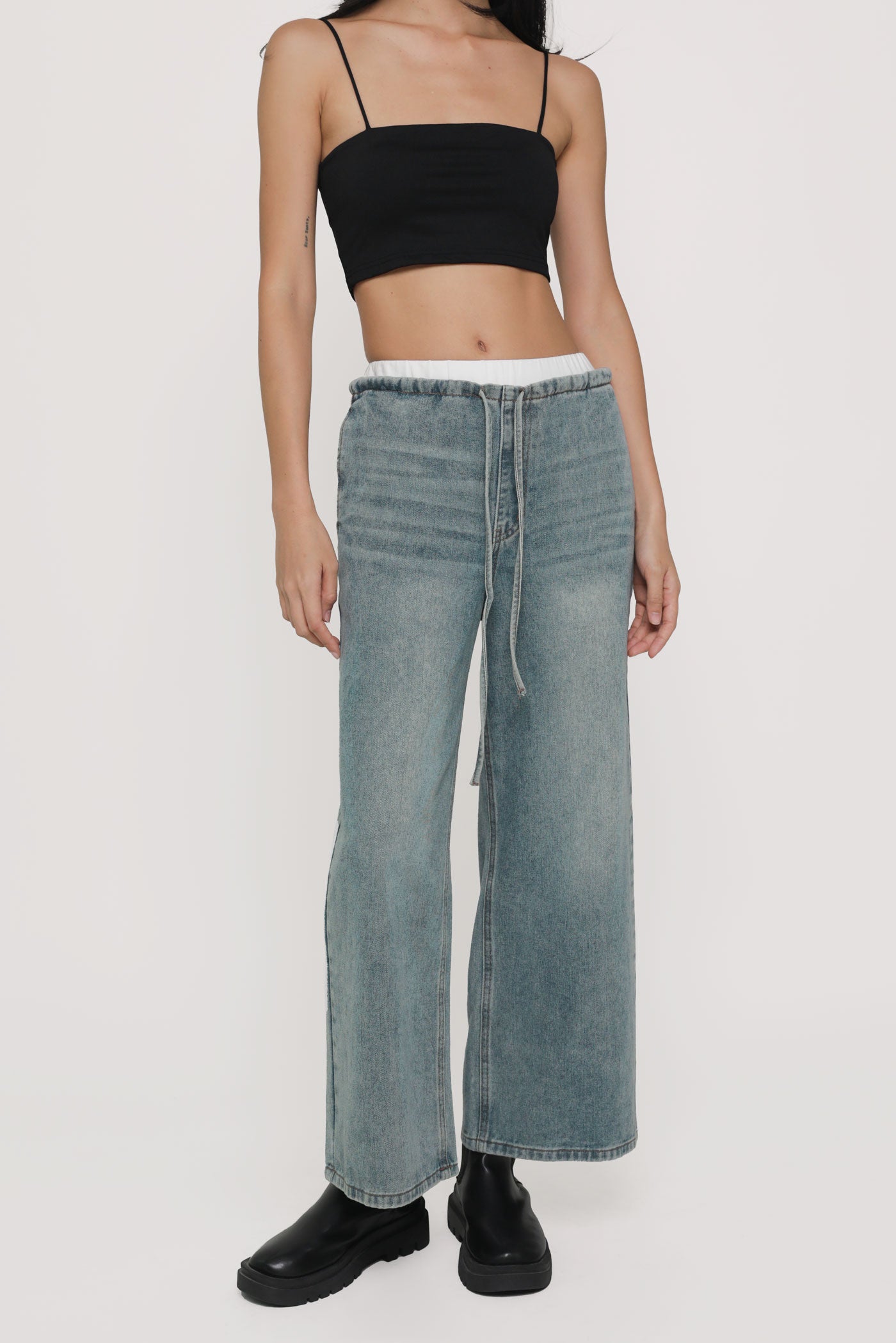These jeans are made of cotton denim material for a comfortable and breathable fit. They are complete with functional drawstring details on the waist, functional side pockets and back pockets.