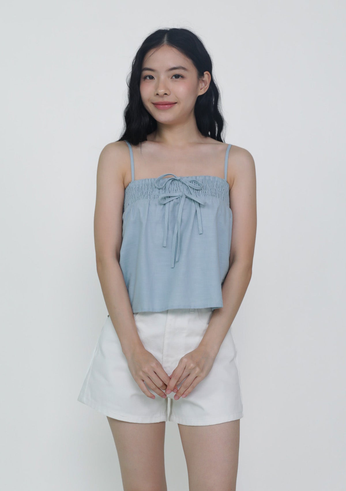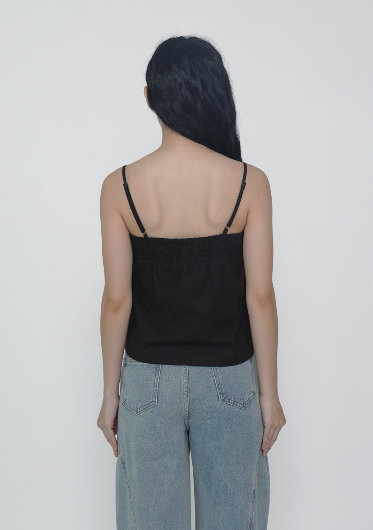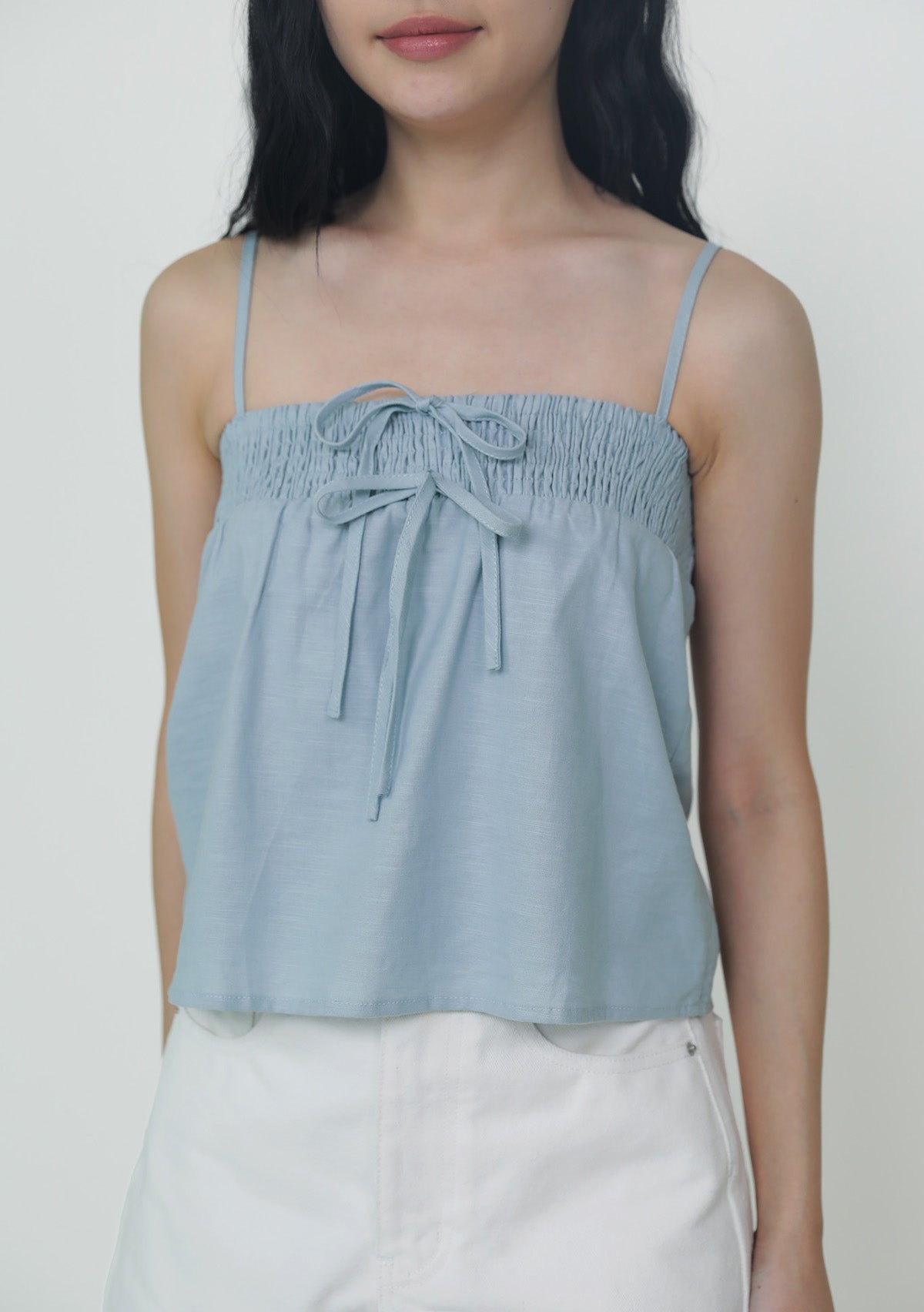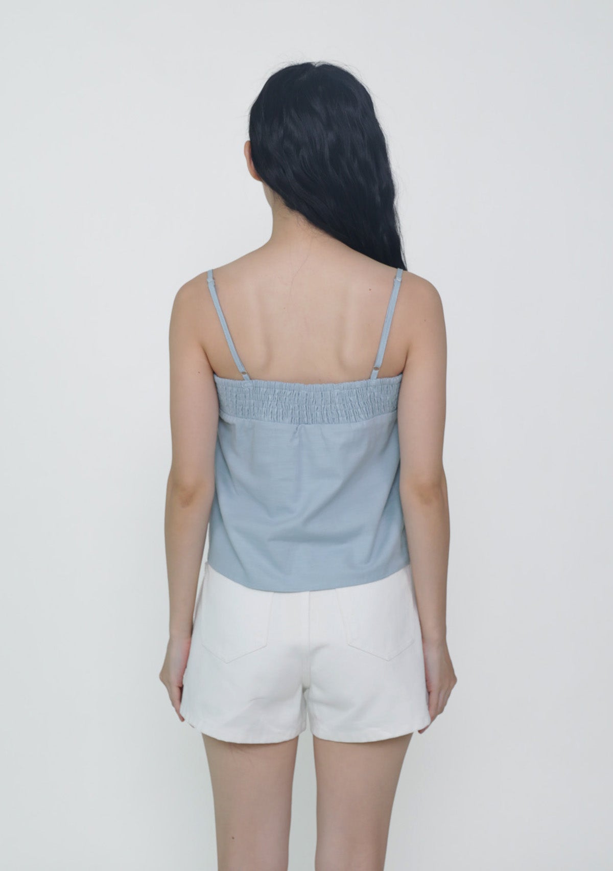 This top is made of cotton linen for a light and breathable fit. It has inner lining and complete with smocked details at the bust and adjustable straps.
