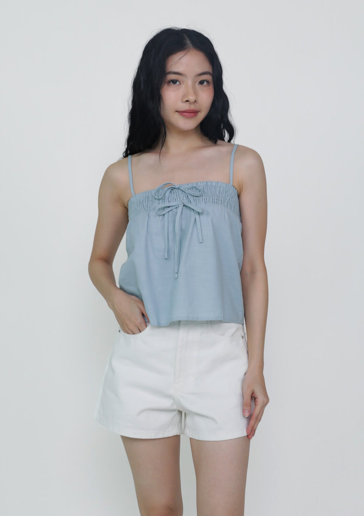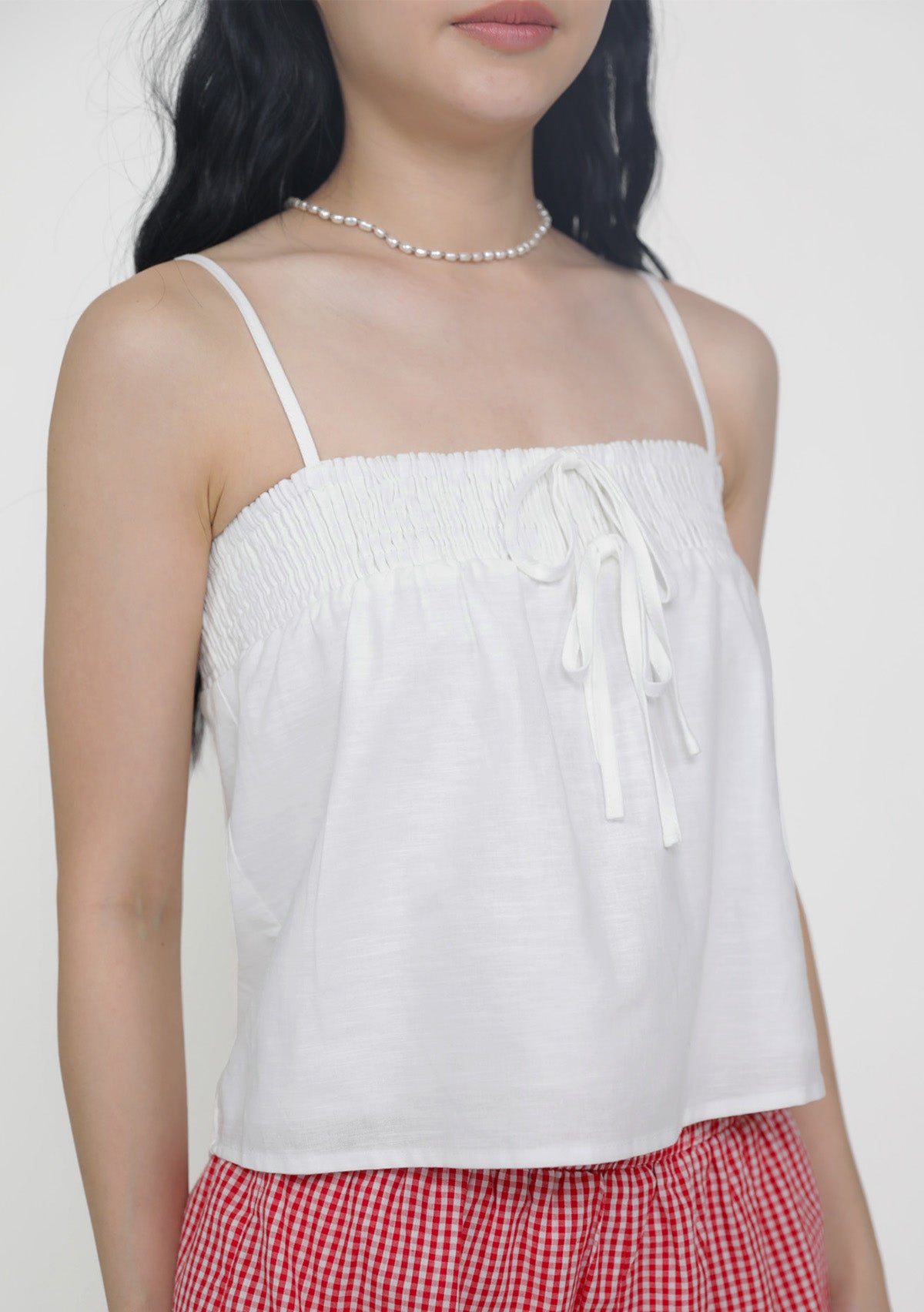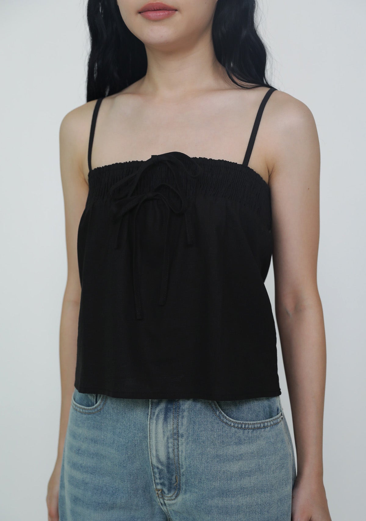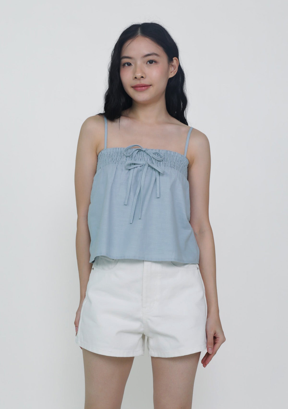 This top is made of cotton linen for a light and breathable fit. It has inner lining and complete with smocked details at the bust and adjustable straps.