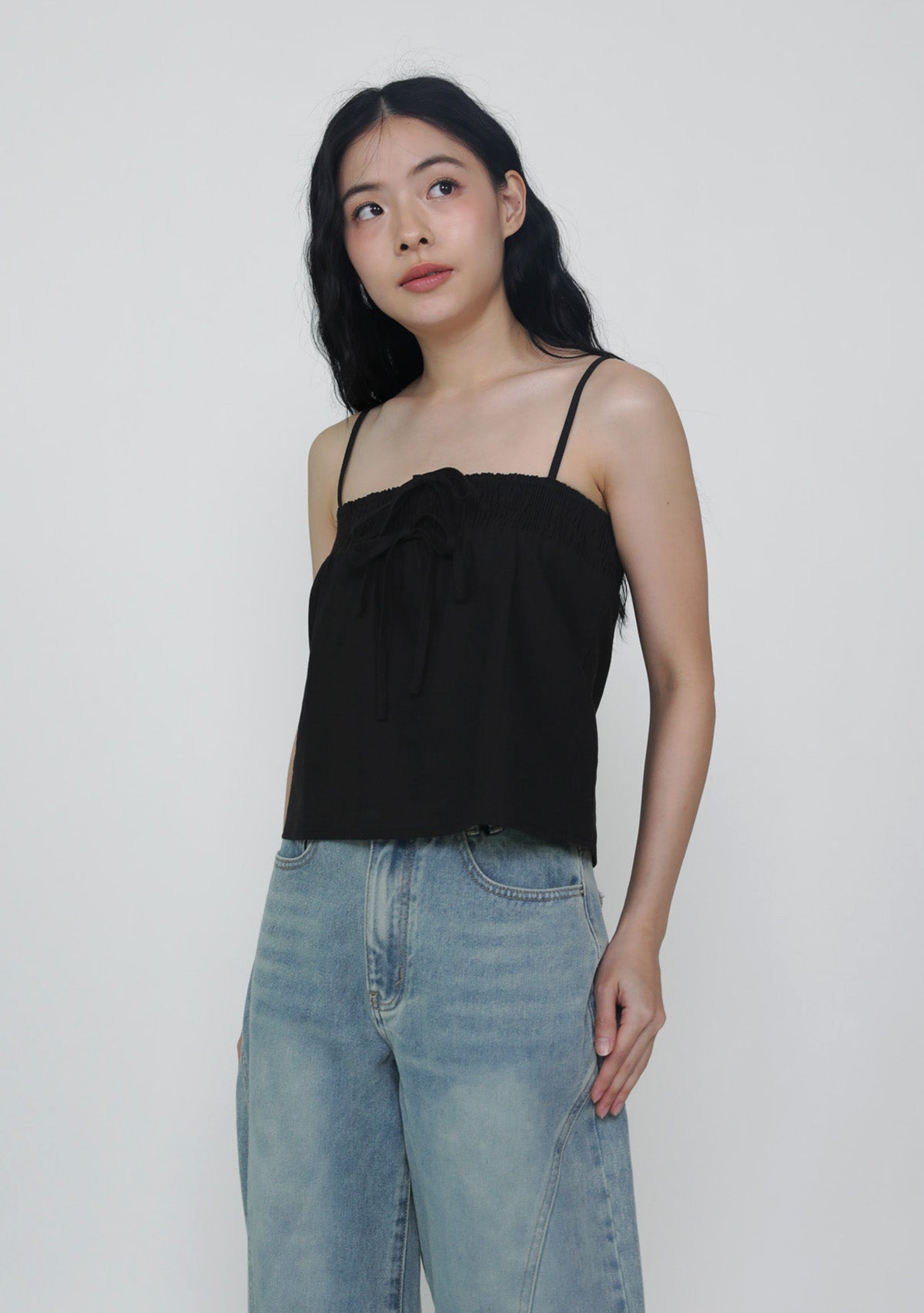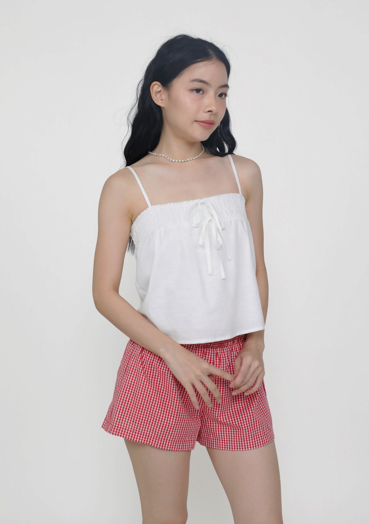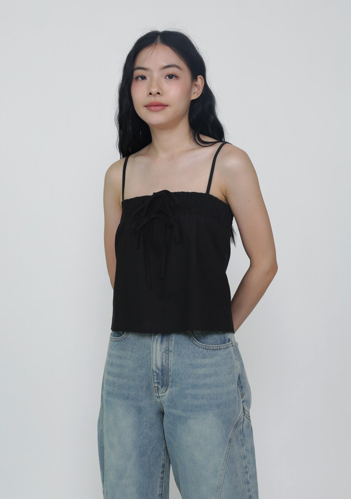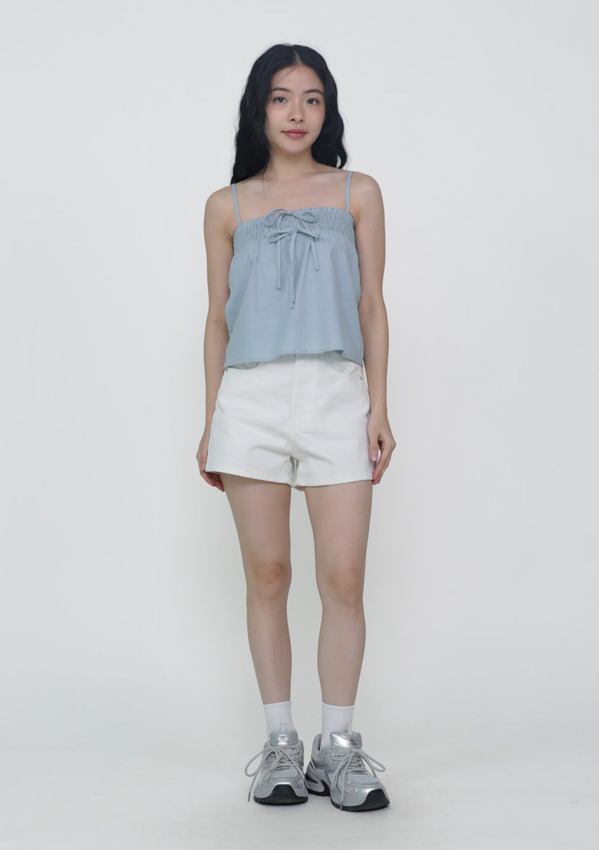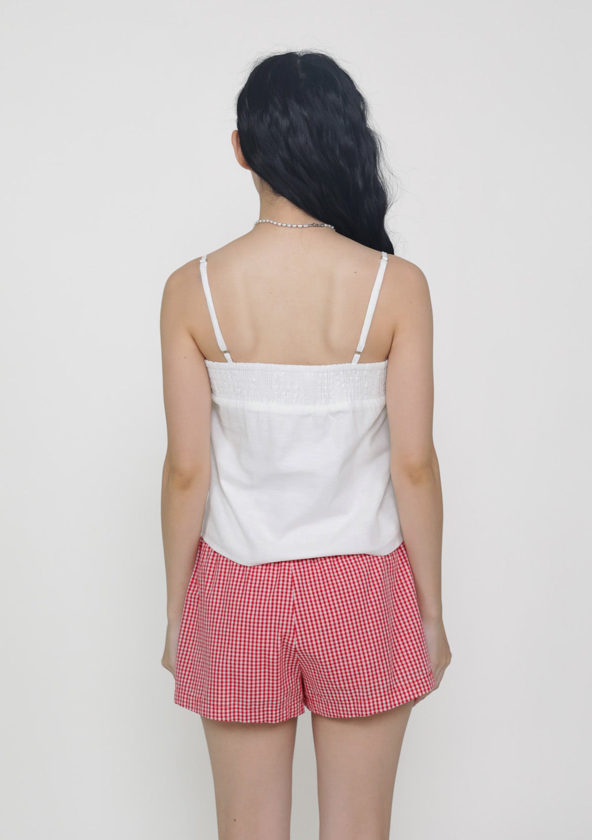 This top is made of cotton linen for a light and breathable fit. It has inner lining and complete with smocked details at the bust and adjustable straps.