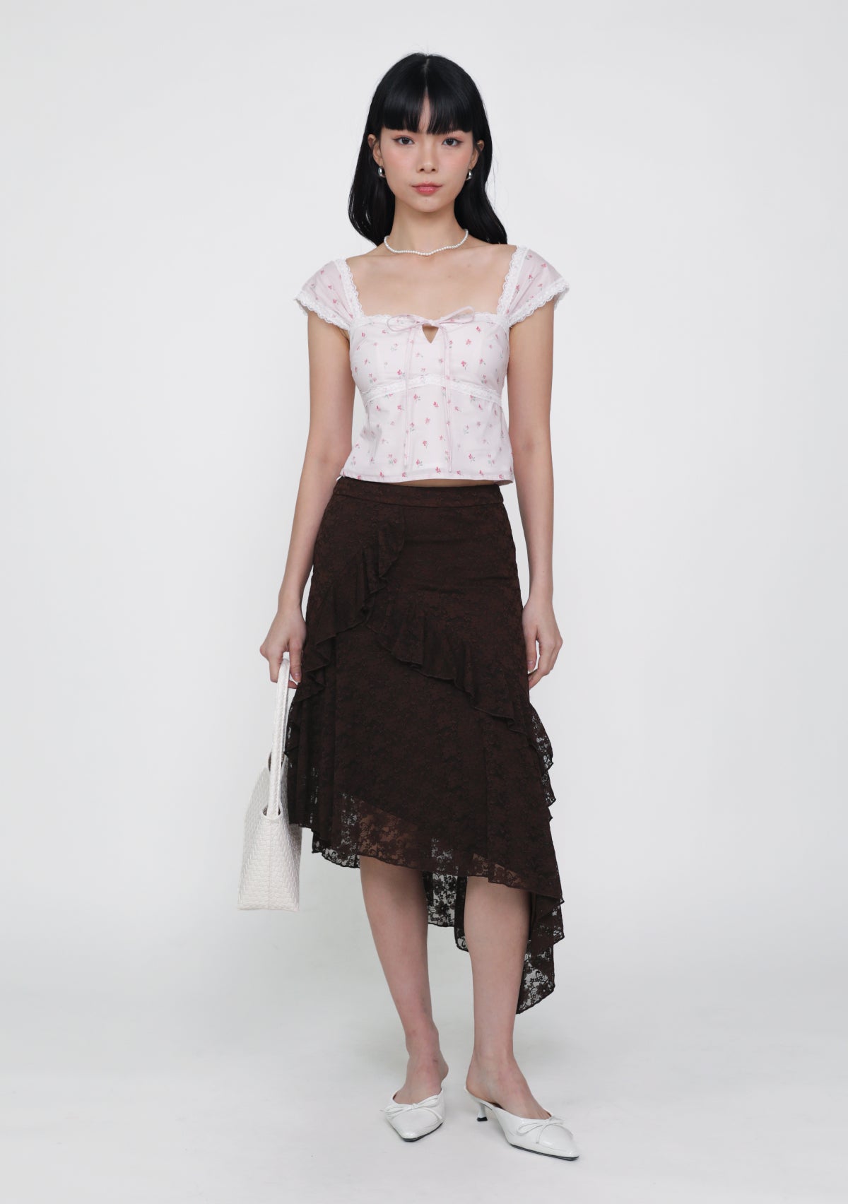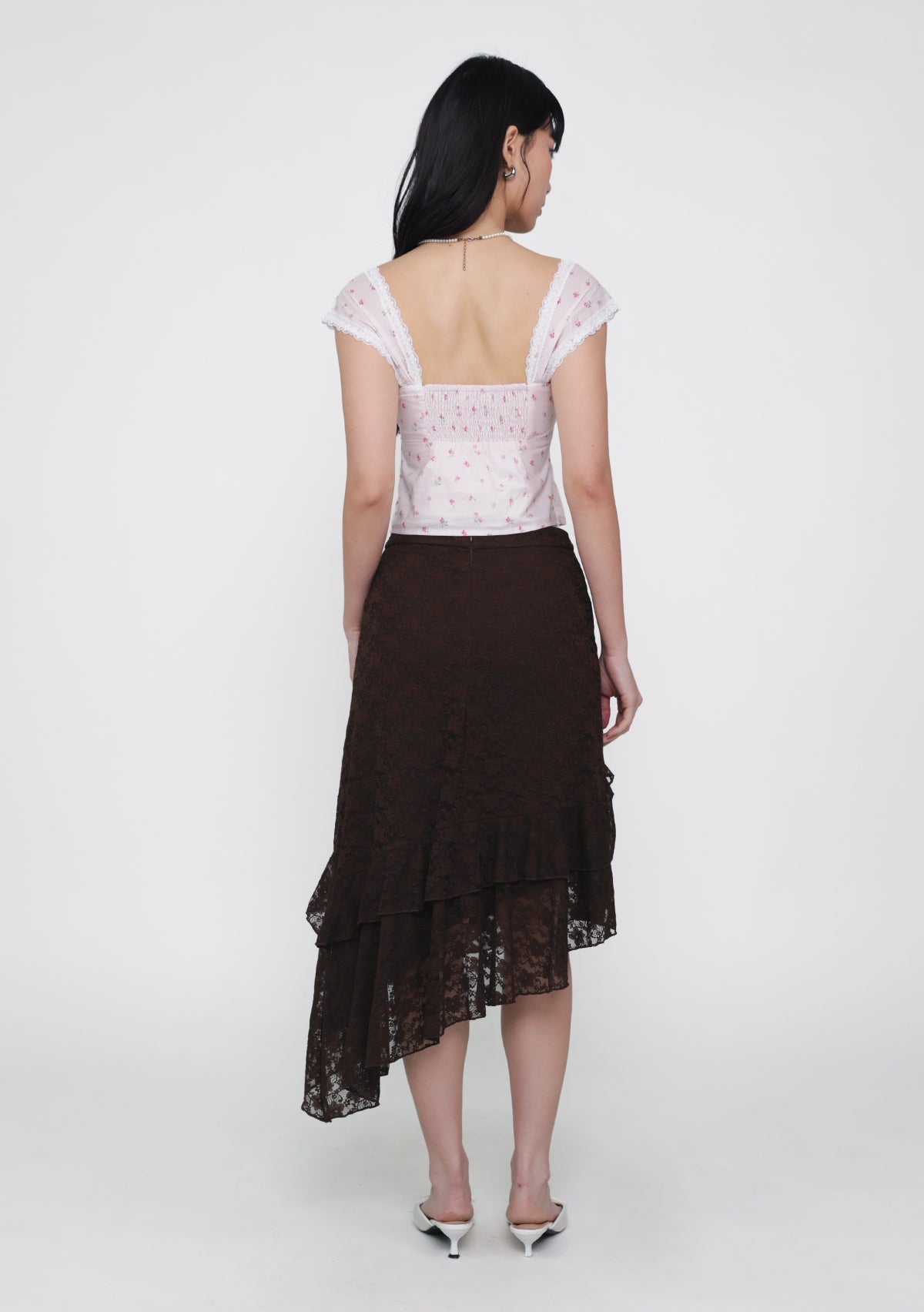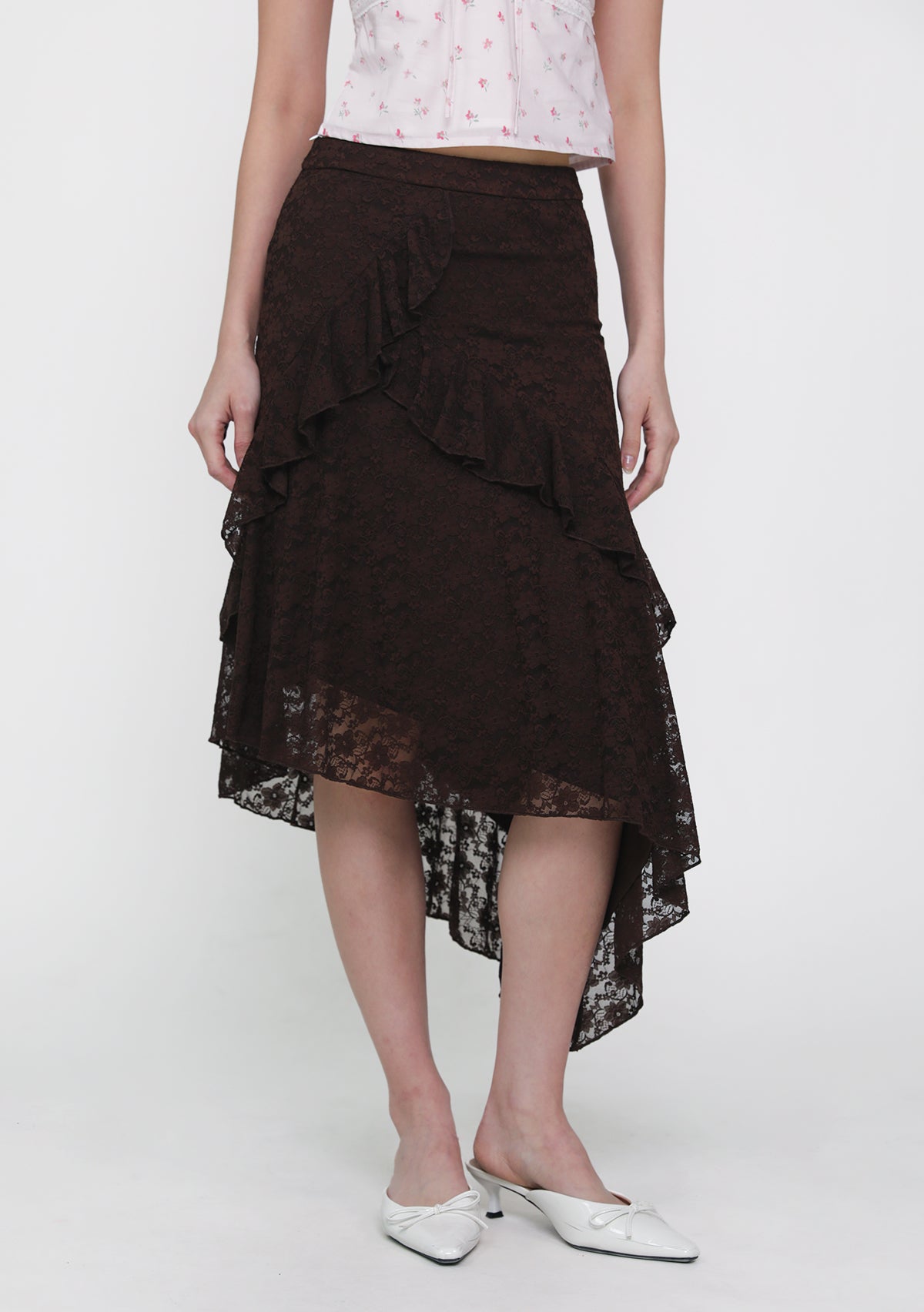 Solène Lace Frills Midi Skirt features delicate lace details, a flattering midi silhouette, and a concealed back zip—feminine, elegant, and versatile.