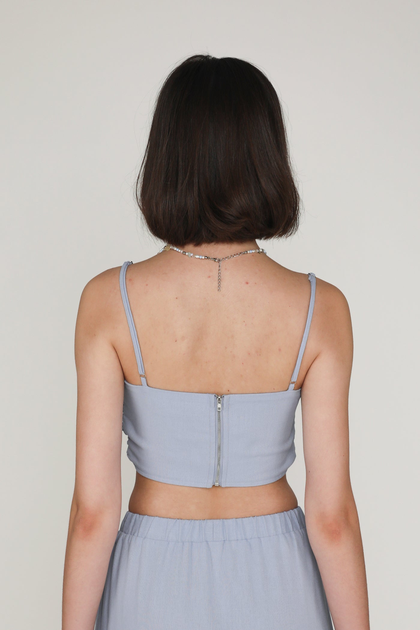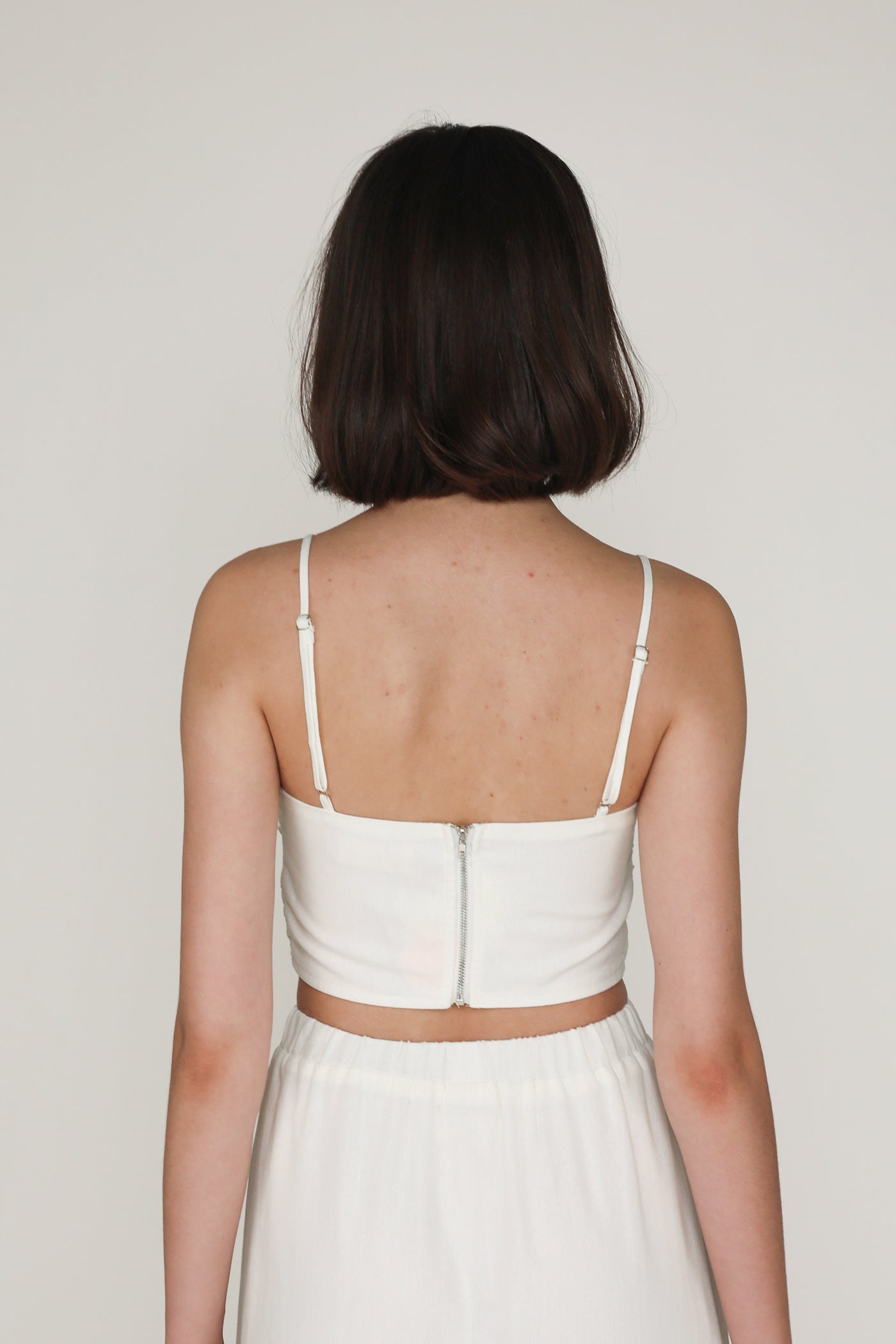 This top is made of double lined linen material for a light and breathable fit. It is complete with adjustable straps, removable paddings and an exposed back zip.