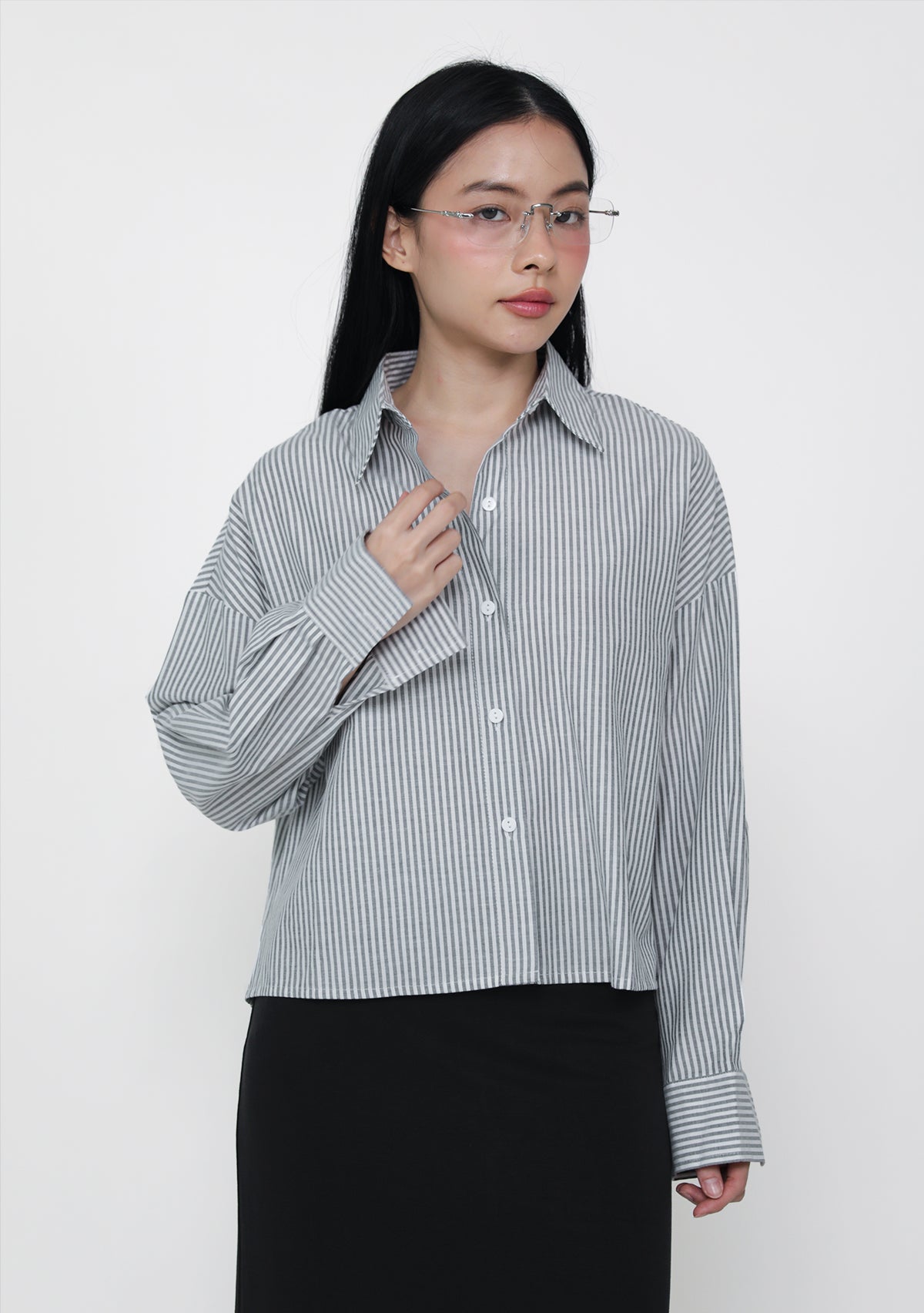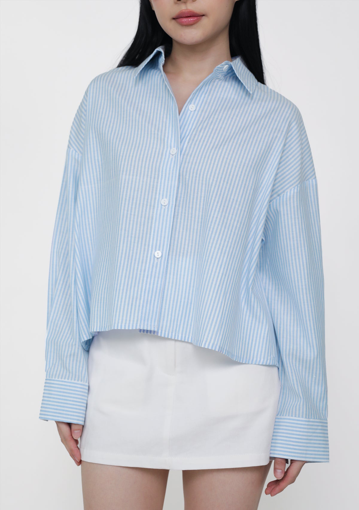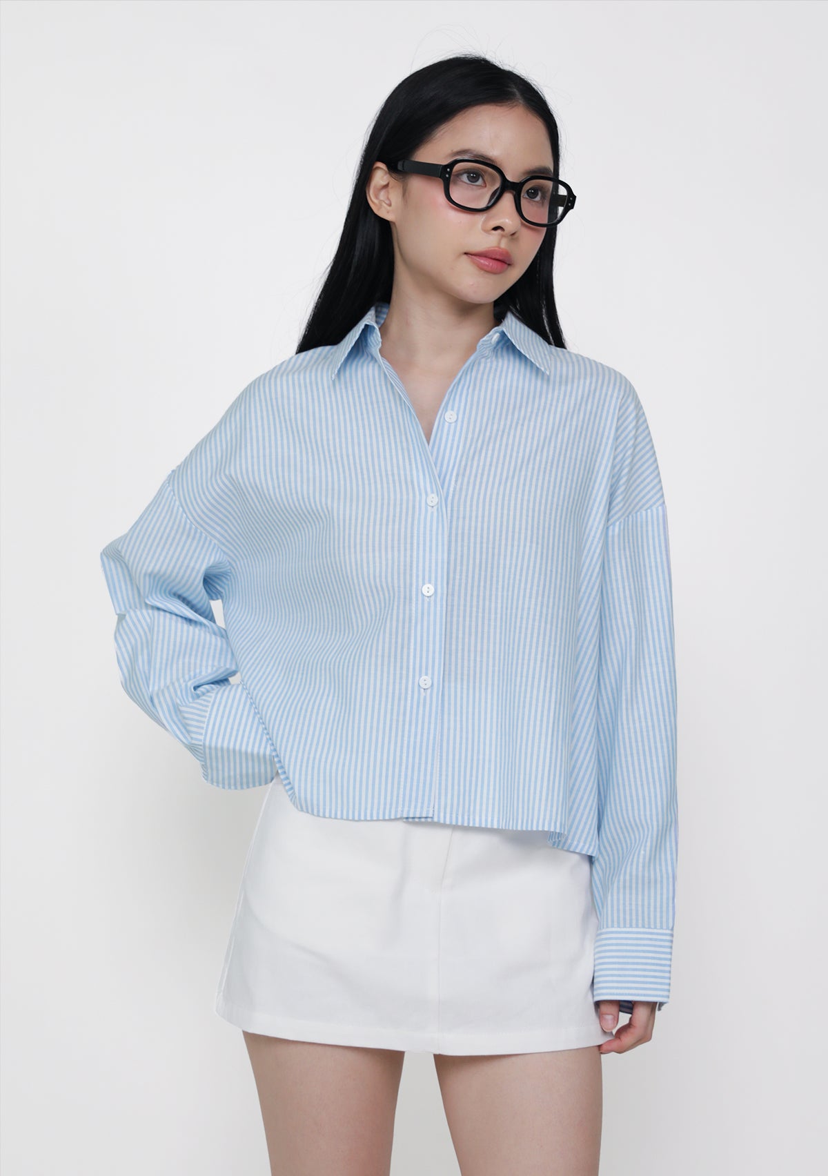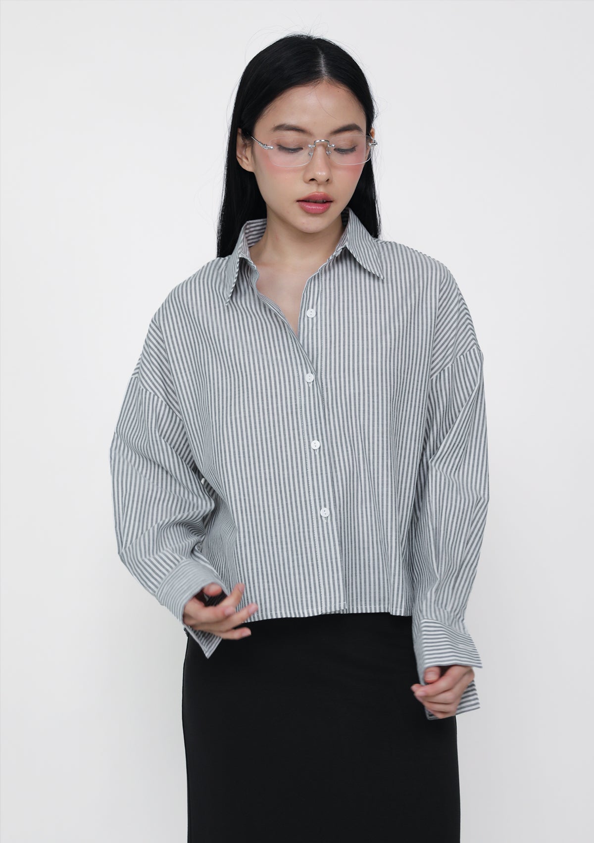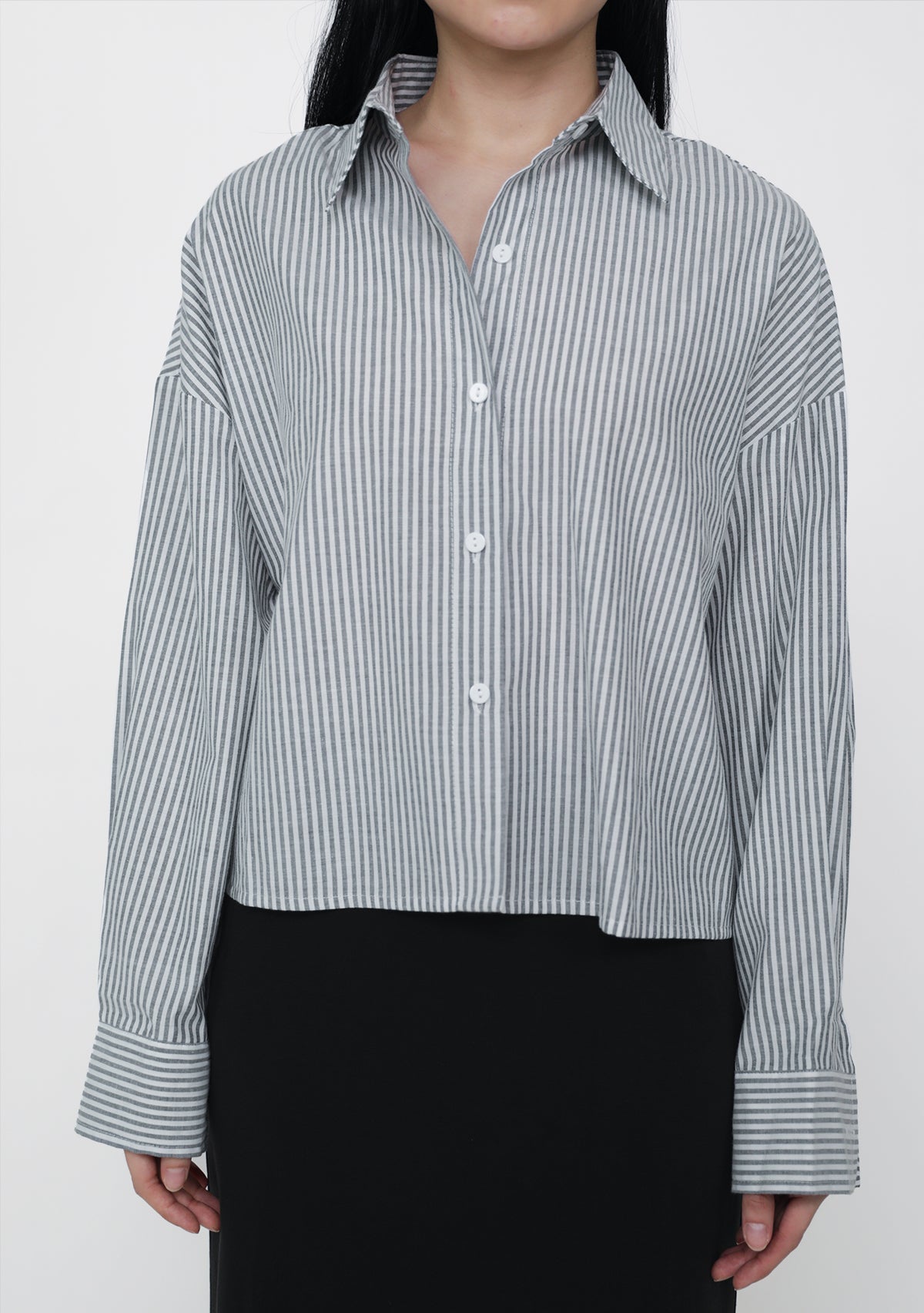 Ally Boxy Shirt (Striped) is a cropped button-down shirt made from a breathable cotton blend with subtle fine stripes.