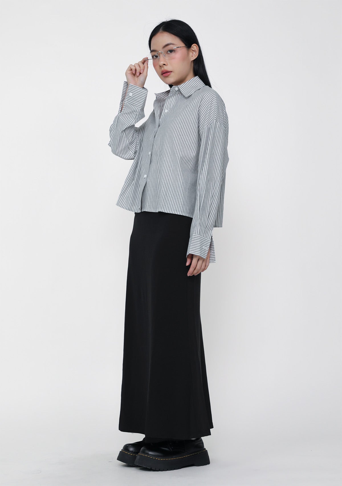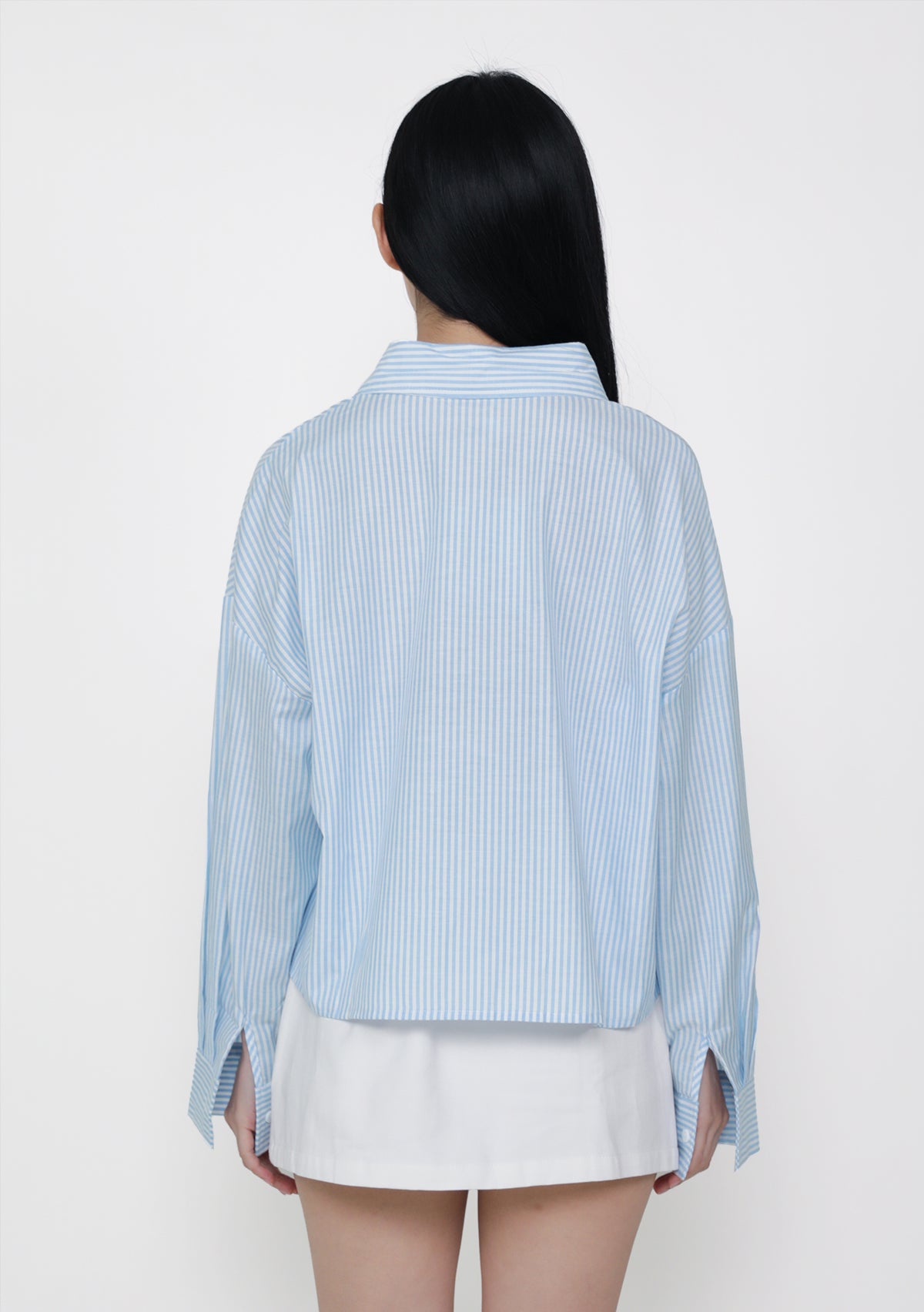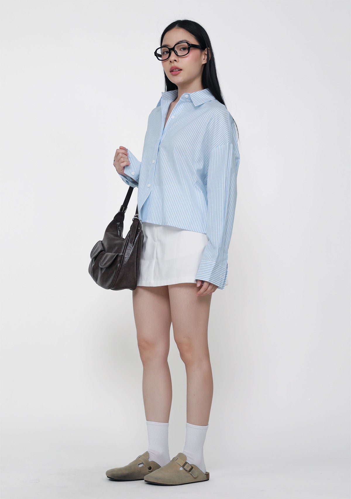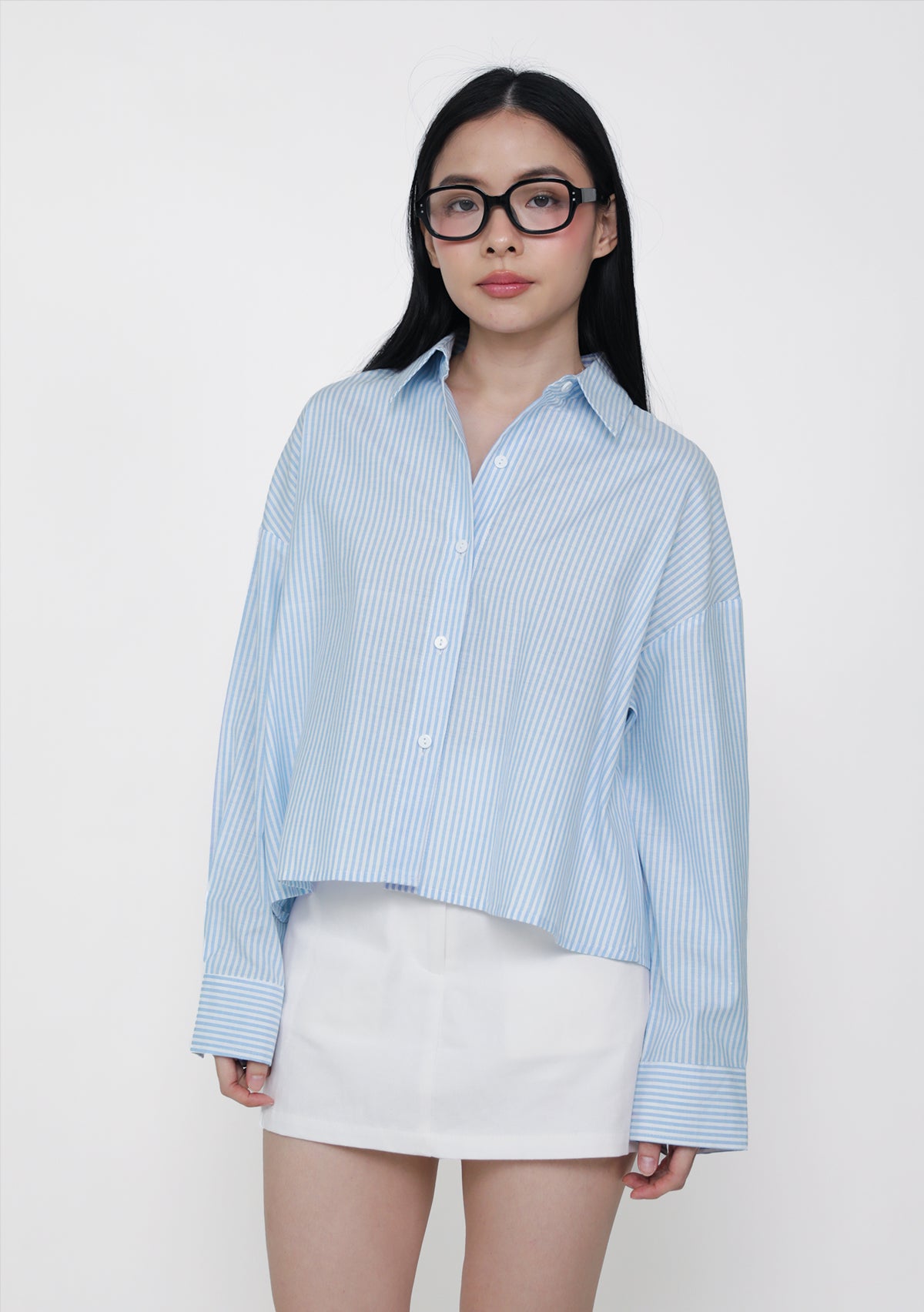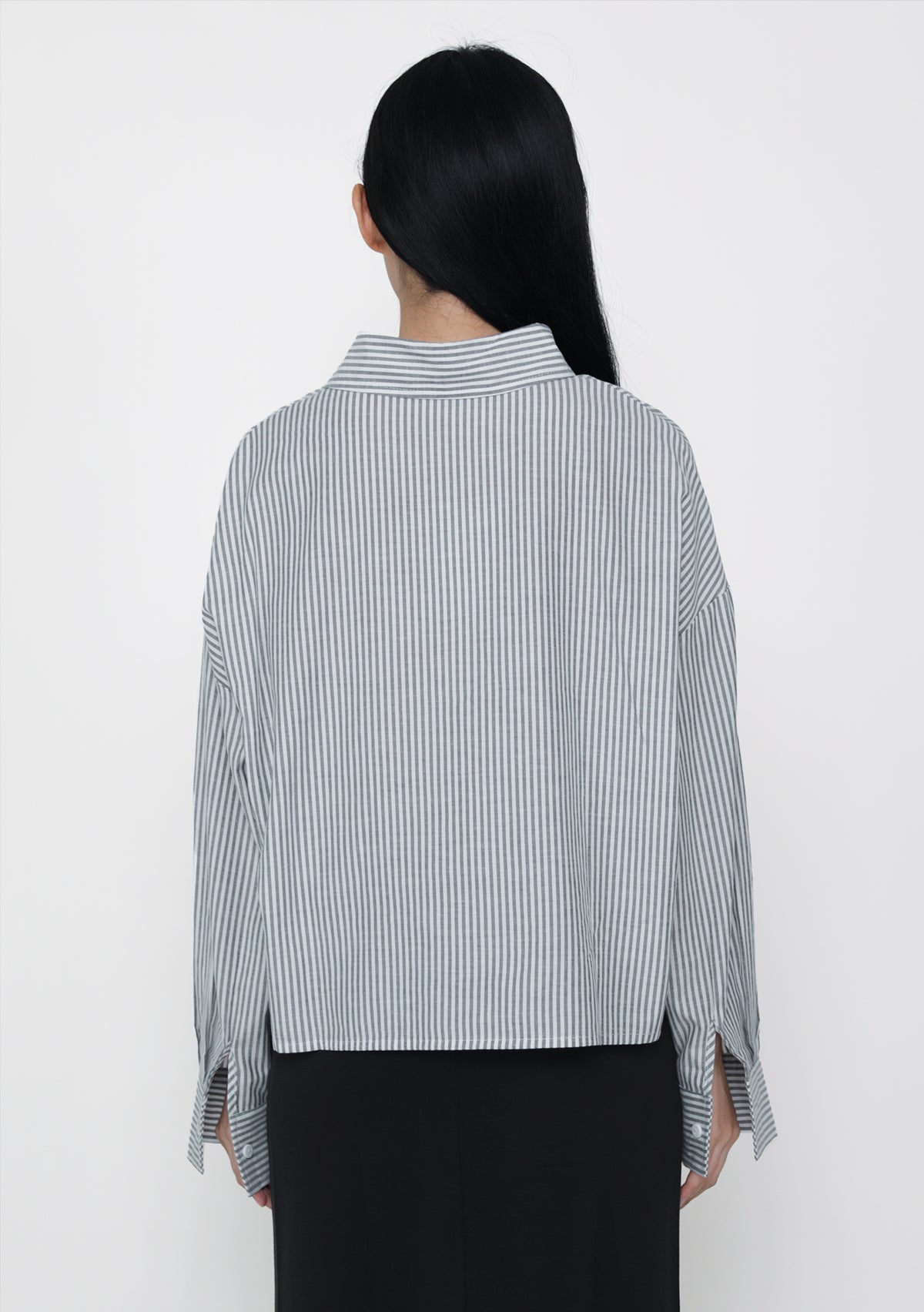 Ally Boxy Shirt (Striped) is a cropped button-down shirt made from a breathable cotton blend with subtle fine stripes.