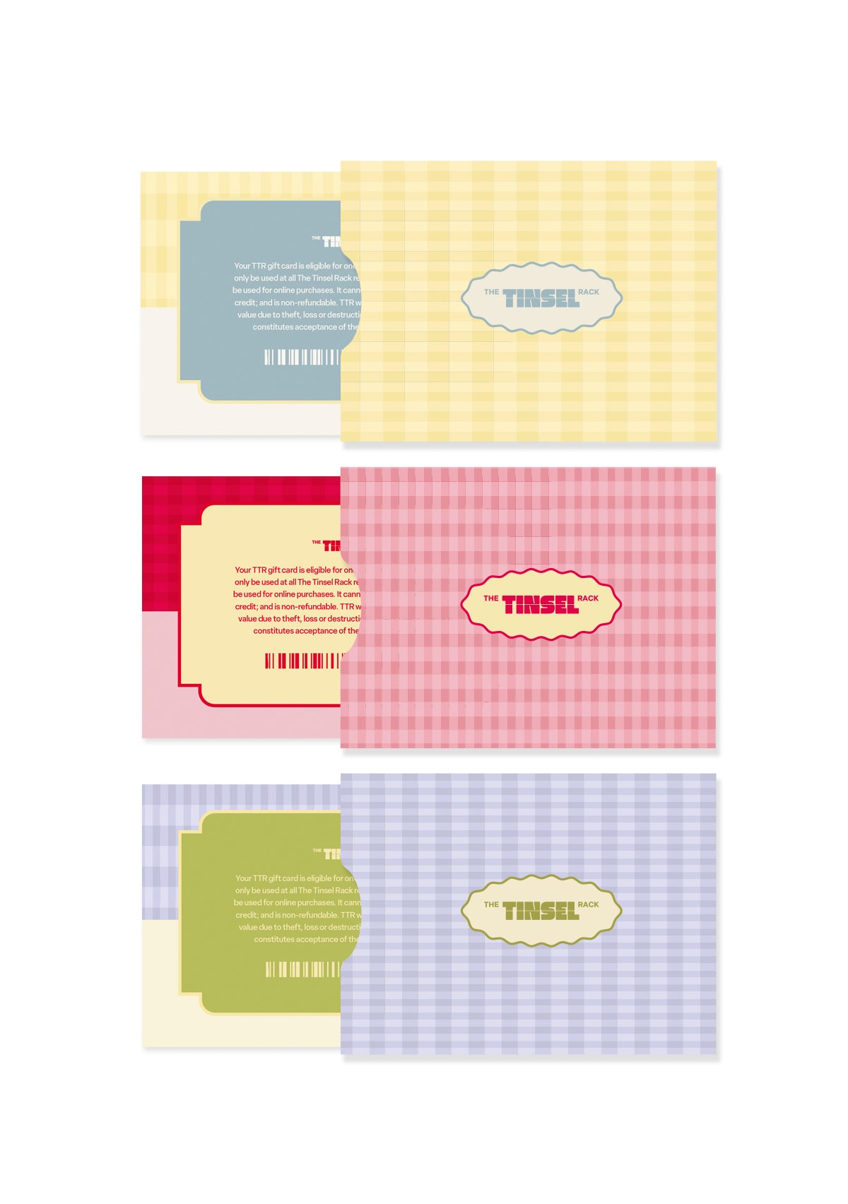 For instant e-gift cards, click here. E-gift cards can be utilised in stores & online on thetinselrack.com.