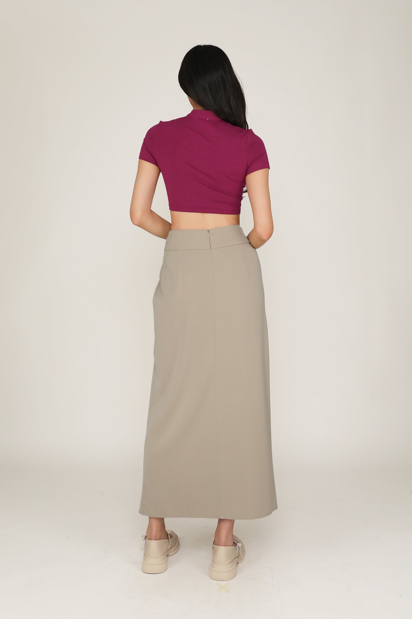 This skirt is made of inner lined polyester spandex for a light and comfortable fit. It is complete with a concealed back zip and front slit.