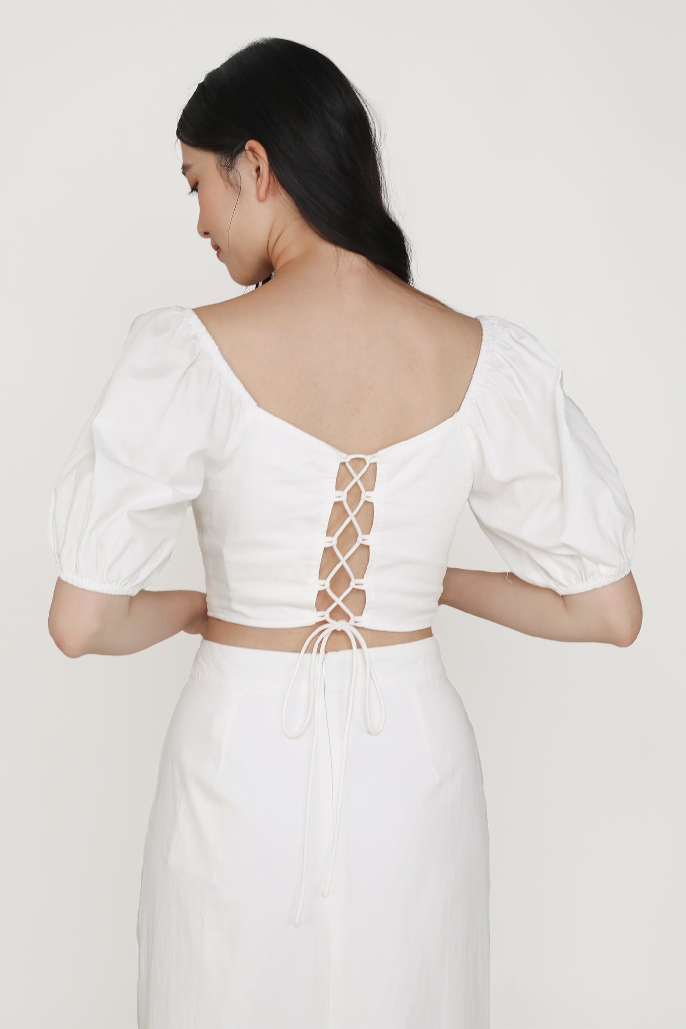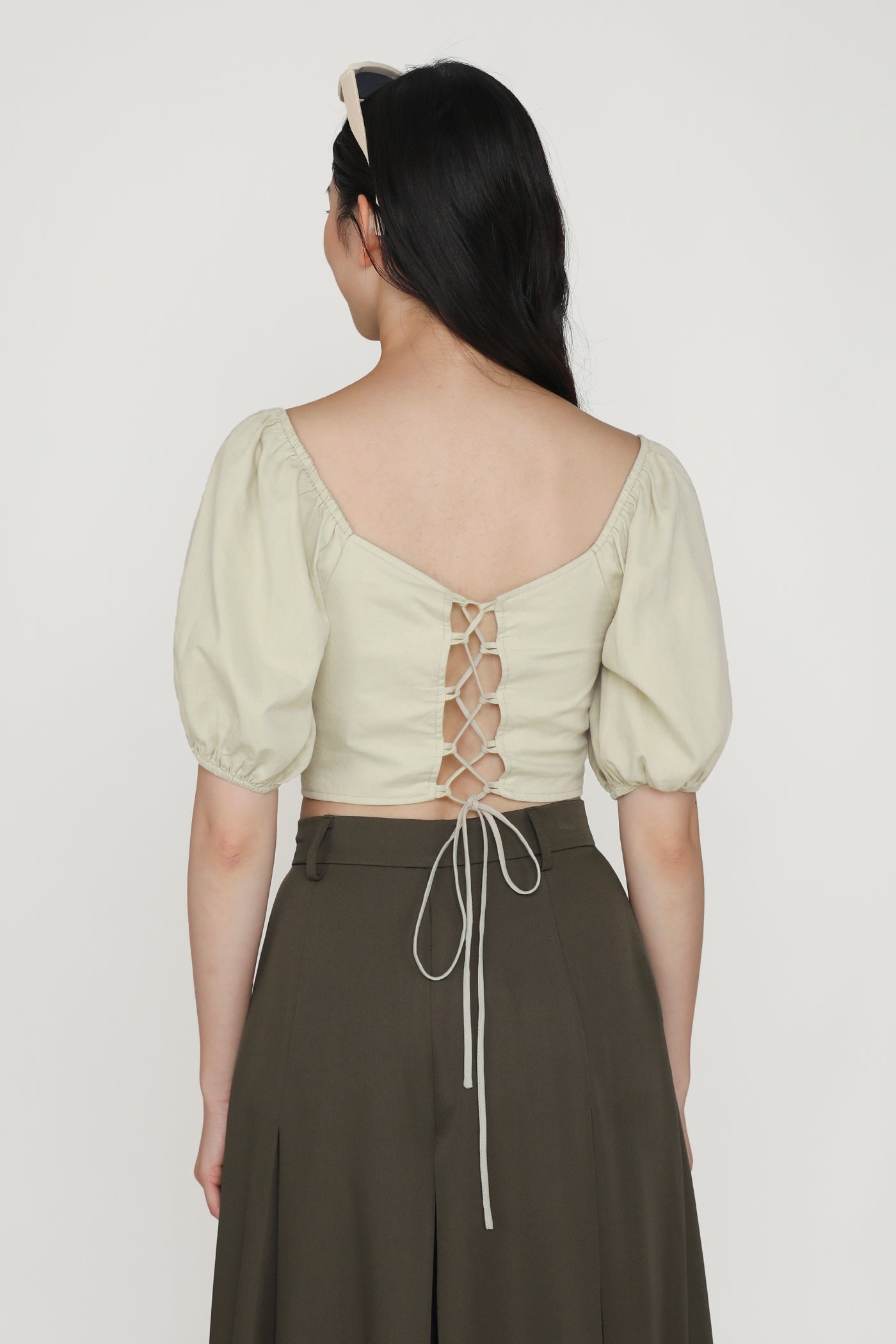 This top is made of inner lined cotton linen material for a light and comfortable fit. It is complete with self tie back details, removable paddings, elasticised sleeves, and an elasticised neckline.