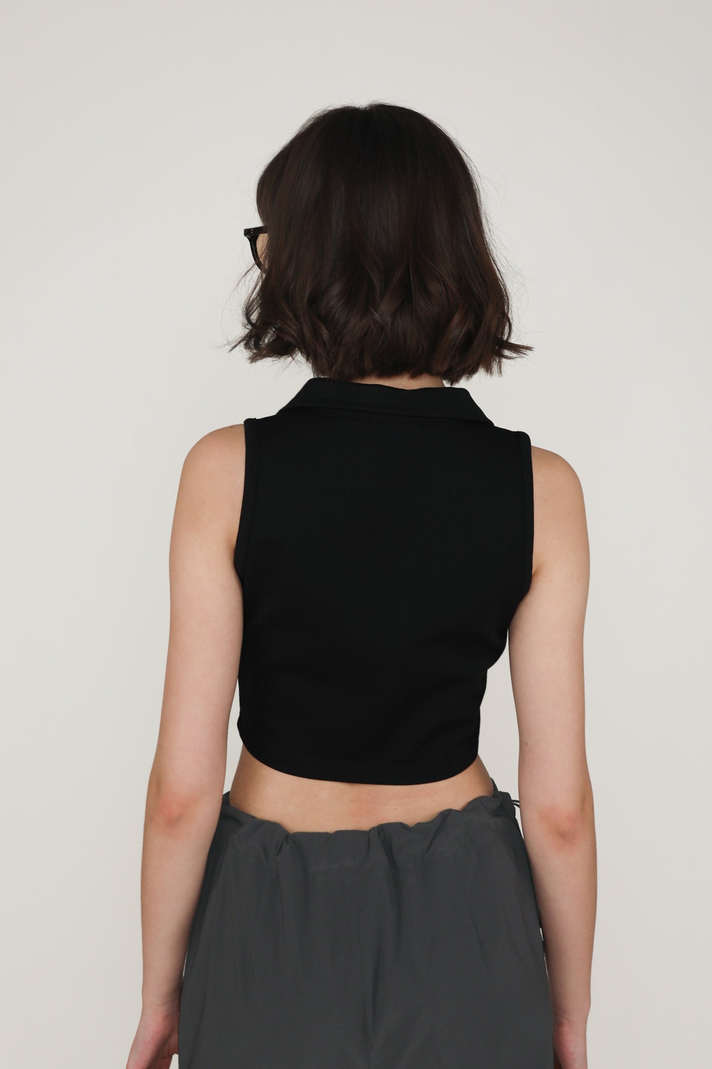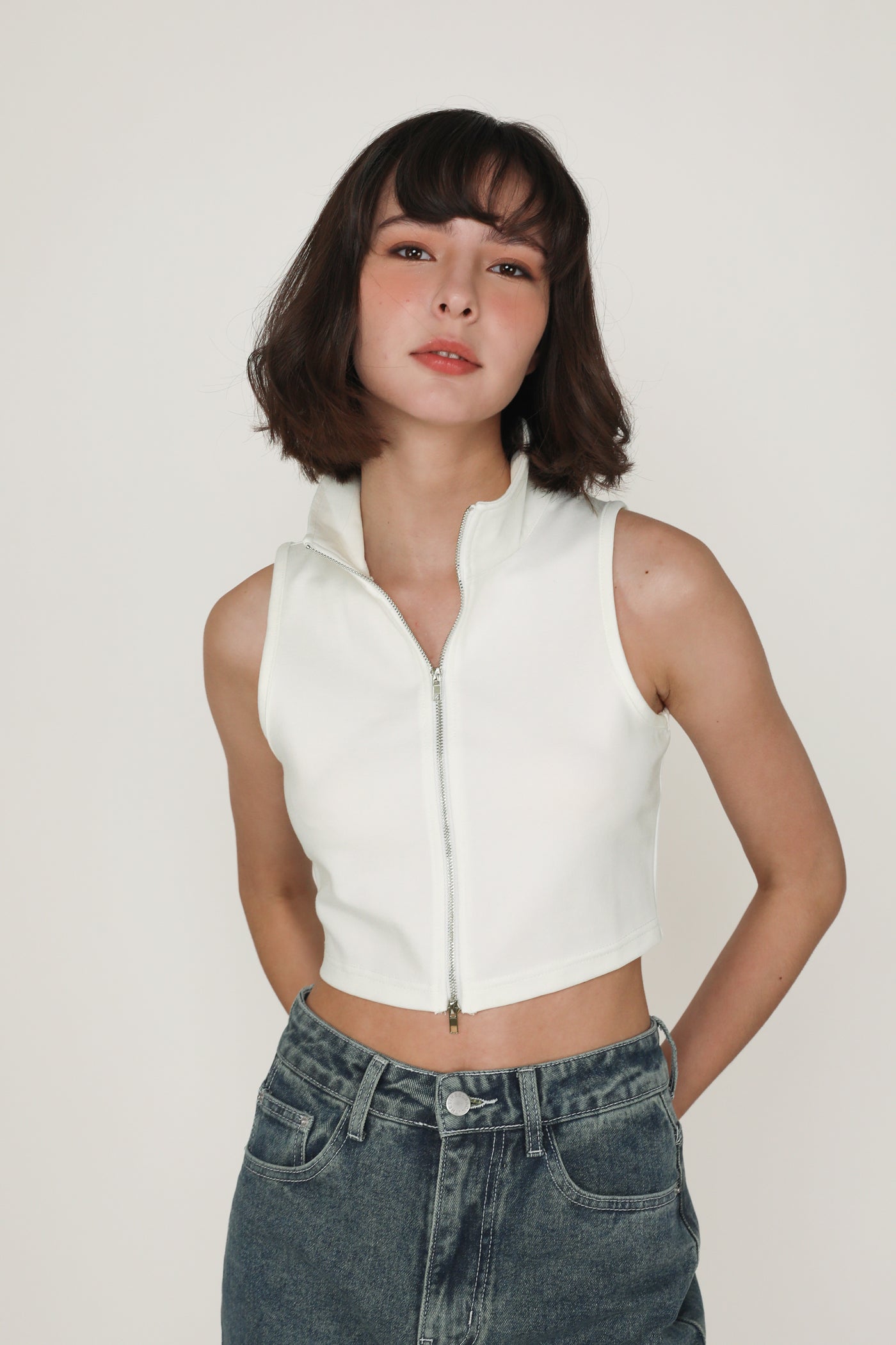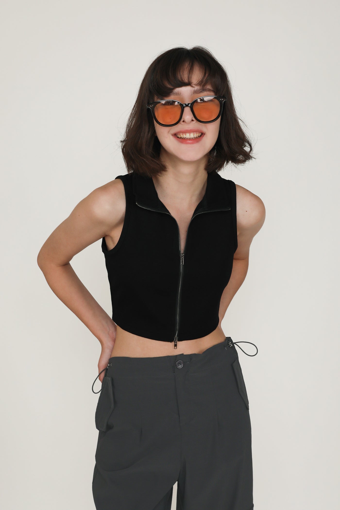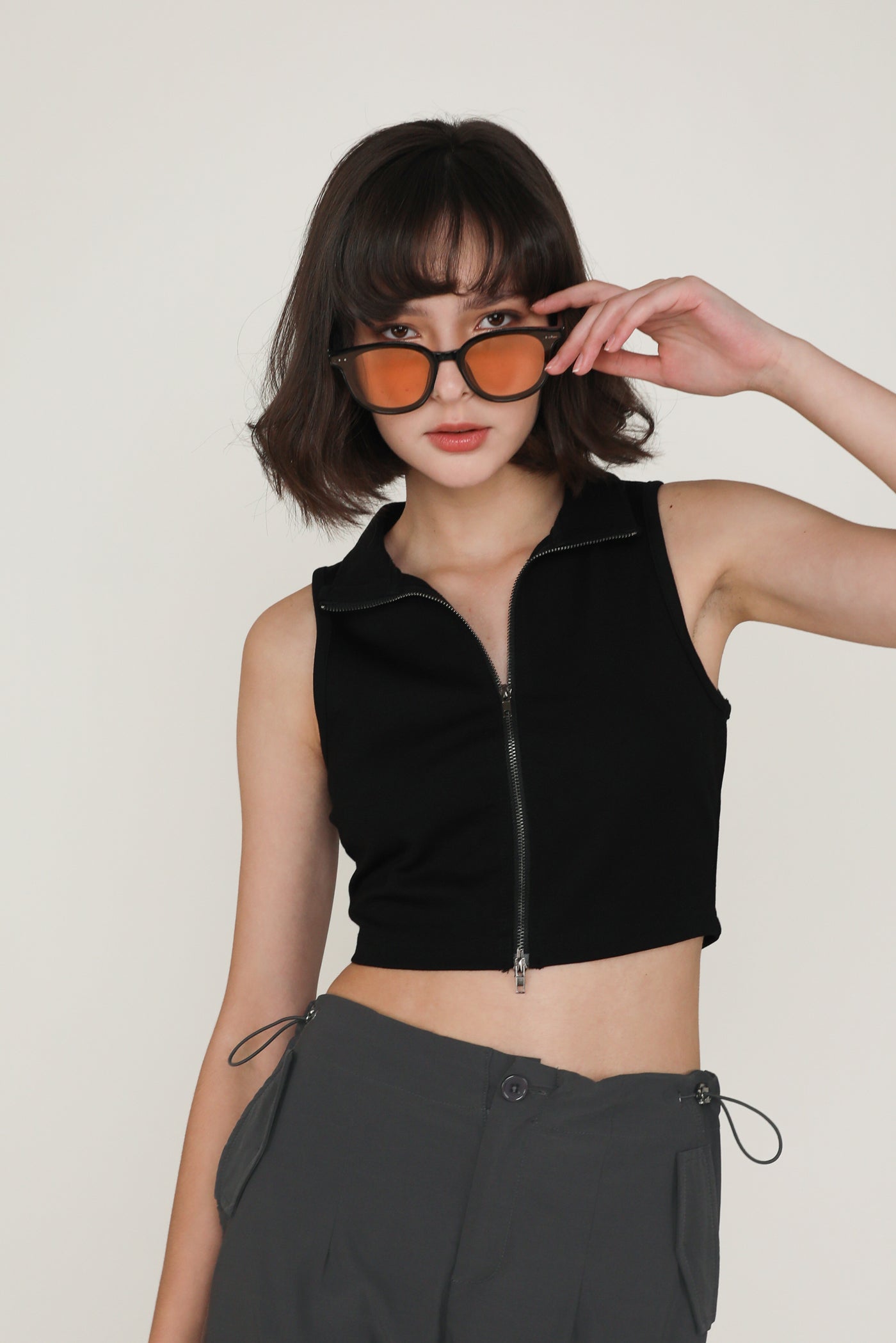 Spice up your weekend looks with Evon. This edgy crop top flaunts a simple collar and statement zip up detail on the front. It is a versatile yet cool top to elevate your casual wardrobe. Complete the outfit with a pair of denim shorts or parachute pants before you head out the door.