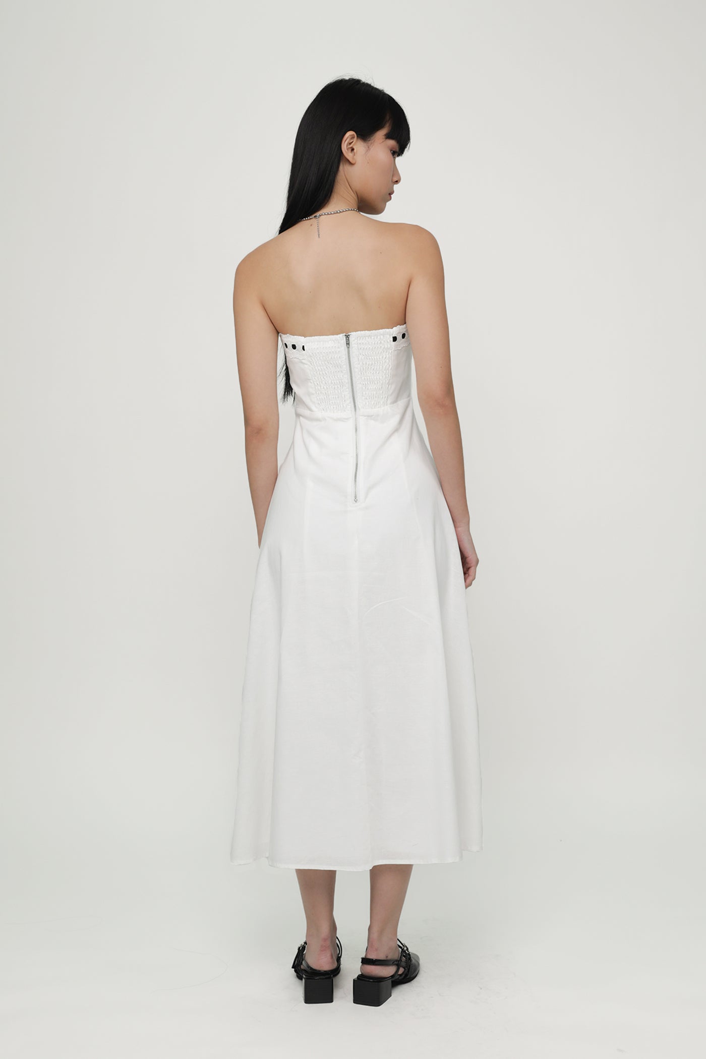 This dress is made of cotton linen for a light and comfortable fit. It has inner lining. It is complete with smocked back, exposed back zip and non functional tie front details.