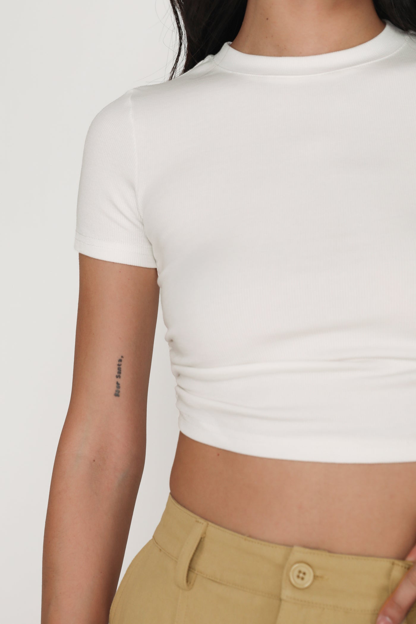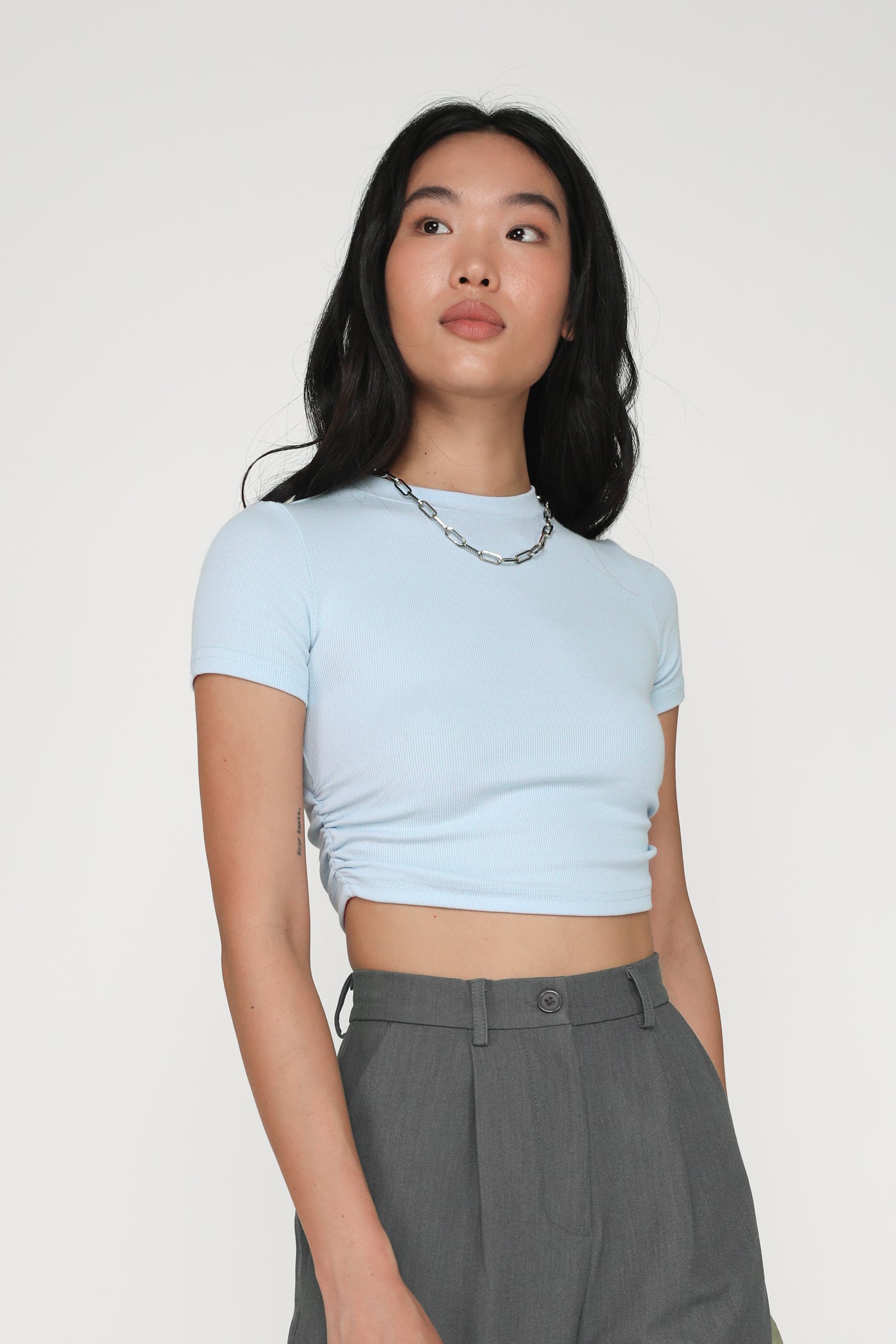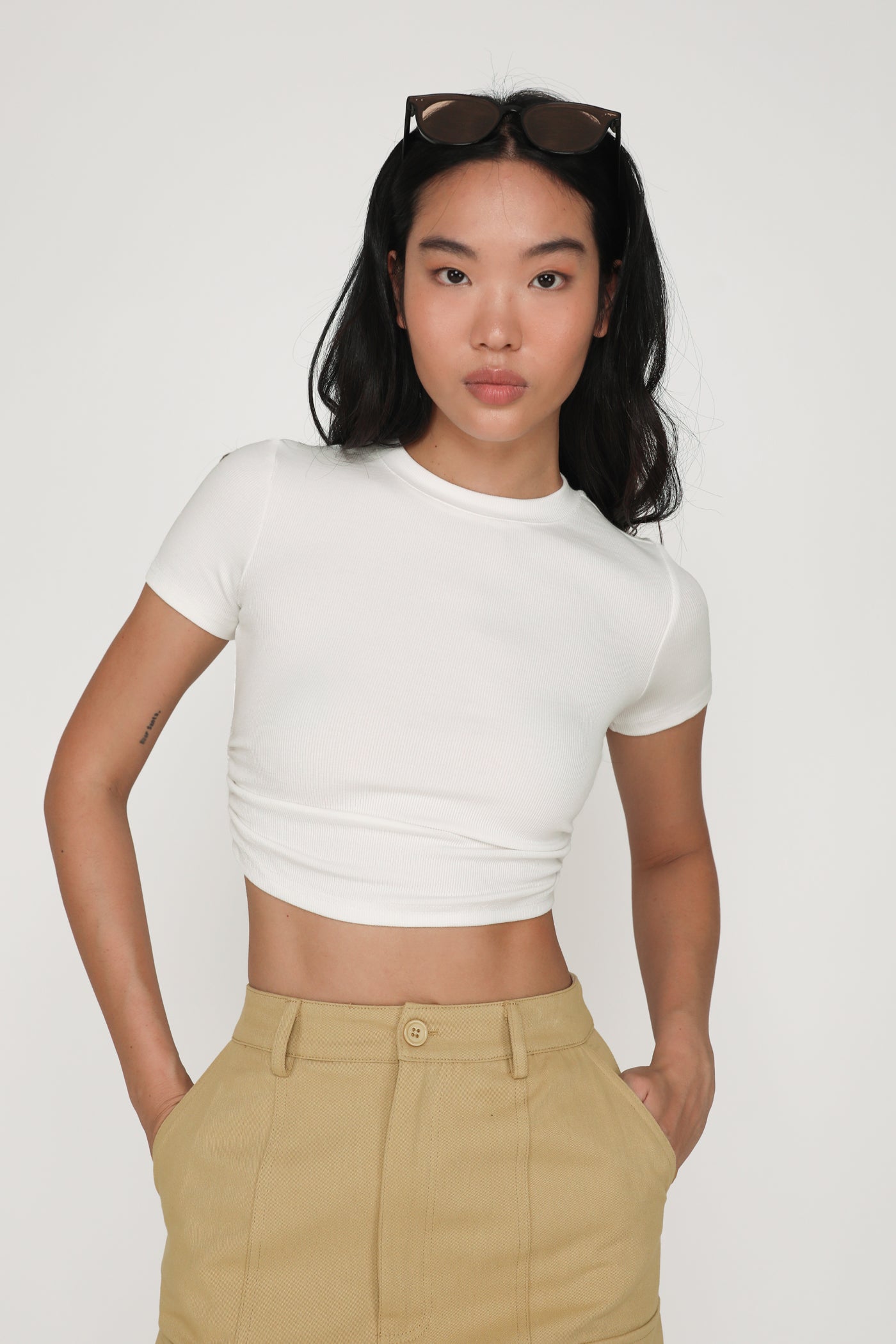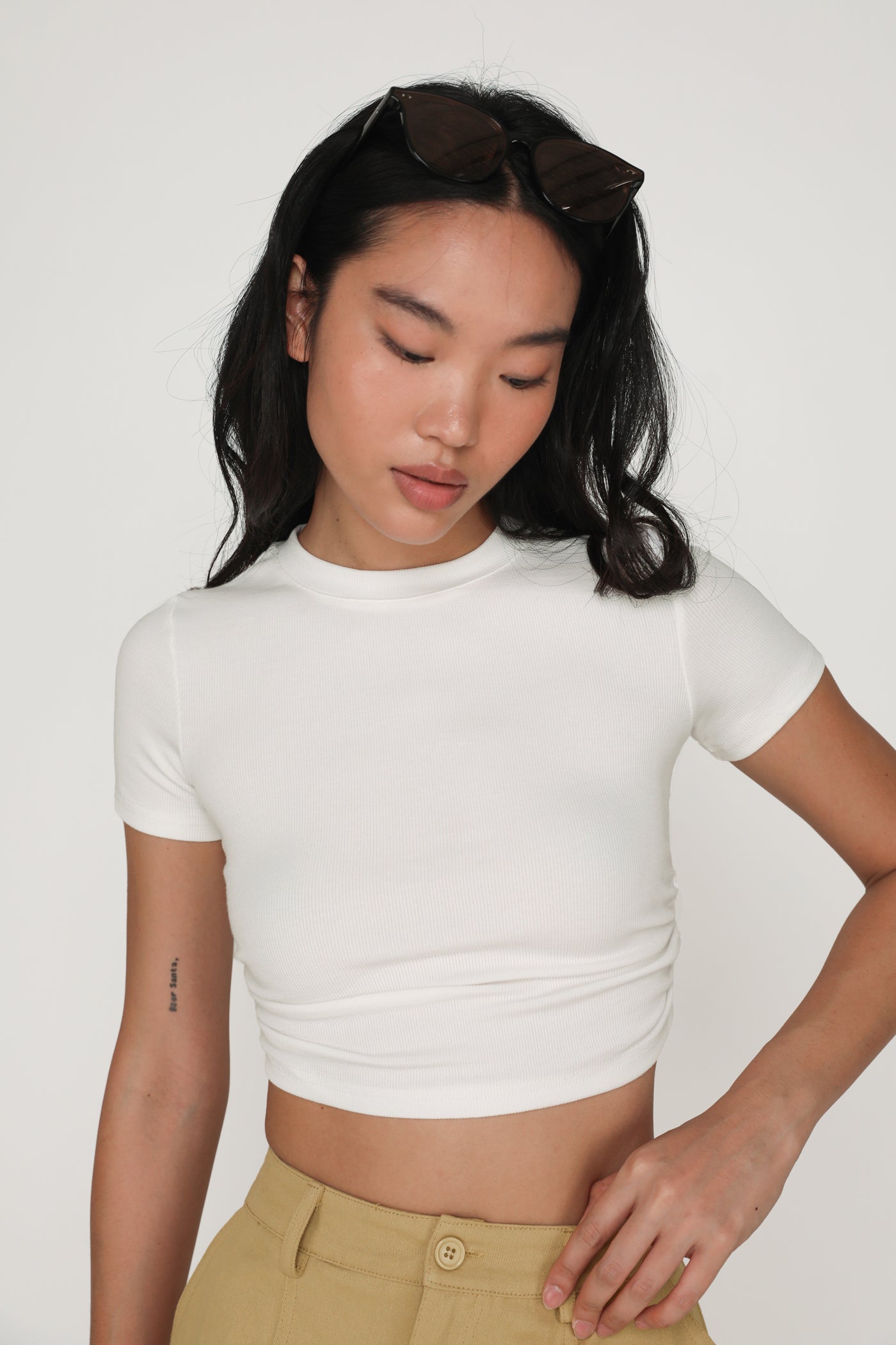 Level up your basics with Marcelo. Marcelo Side Ruched Basic Tee flaunts a classic baby tee silhouette that is simple and versatile. Peek the ruched details along the sides that give the piece a fresh and cool flair. Toss this on with your favourite pair of bottoms and you're ready to slay the day!