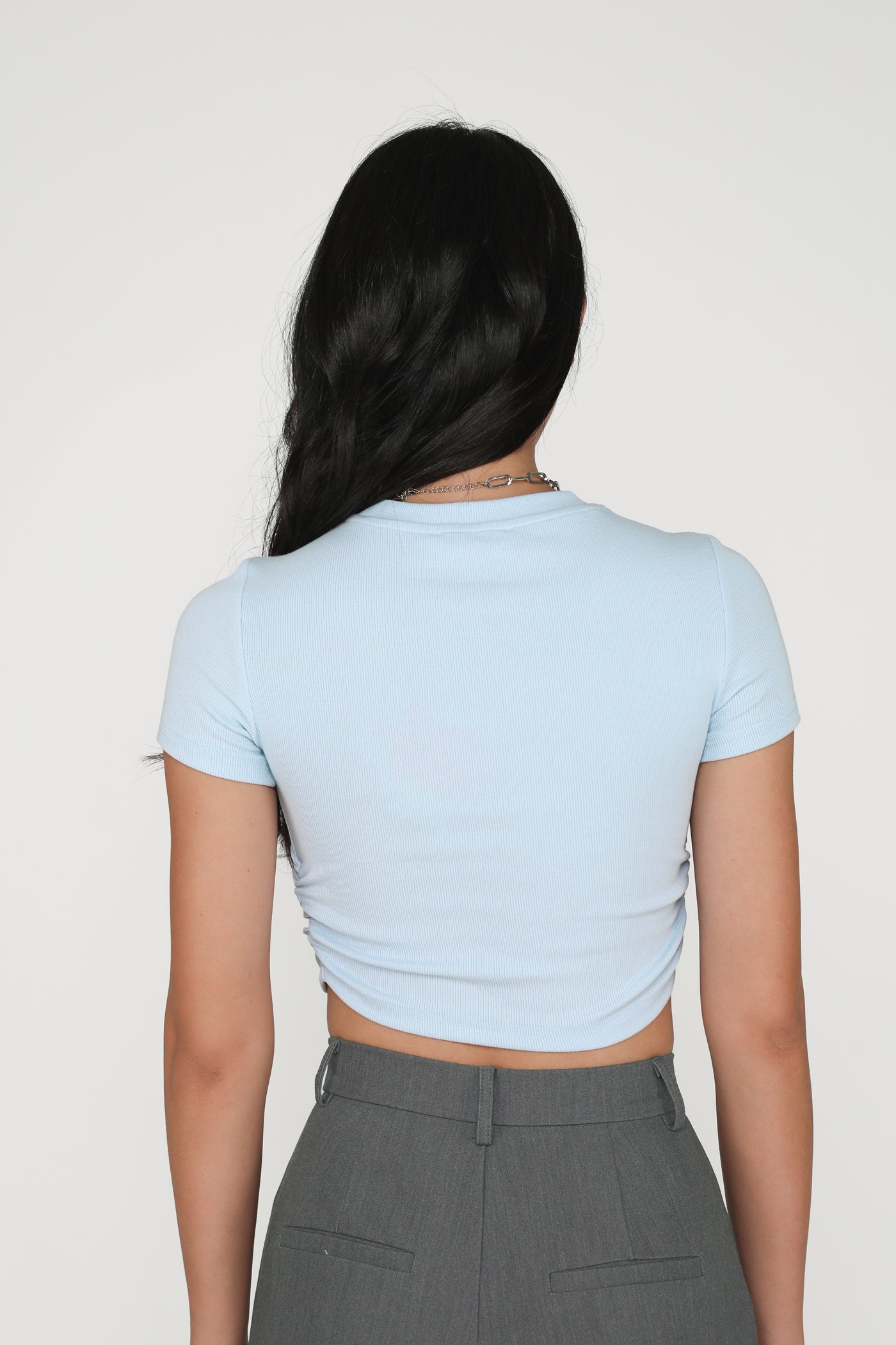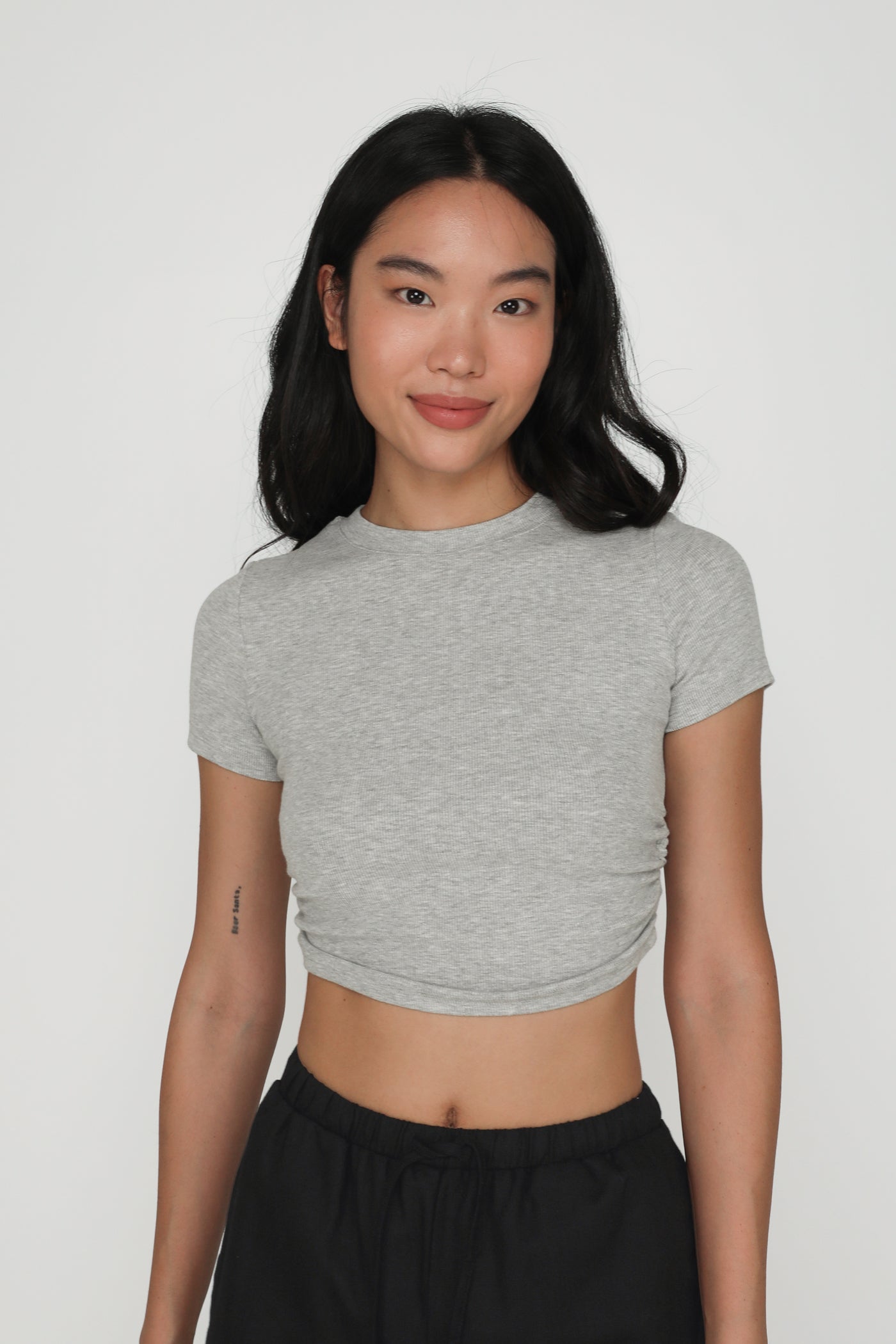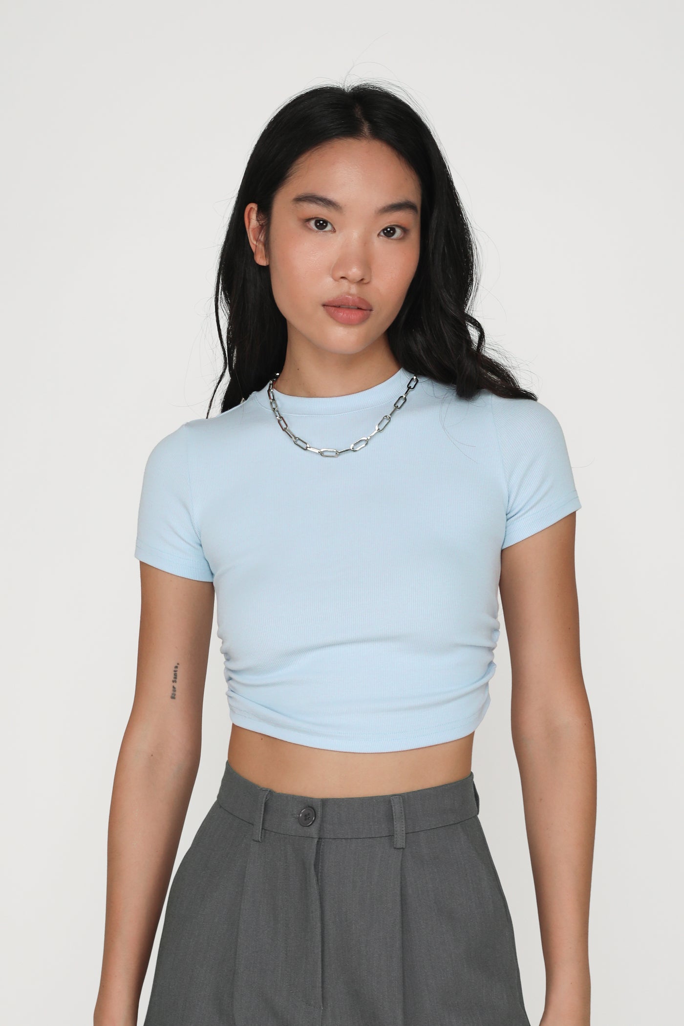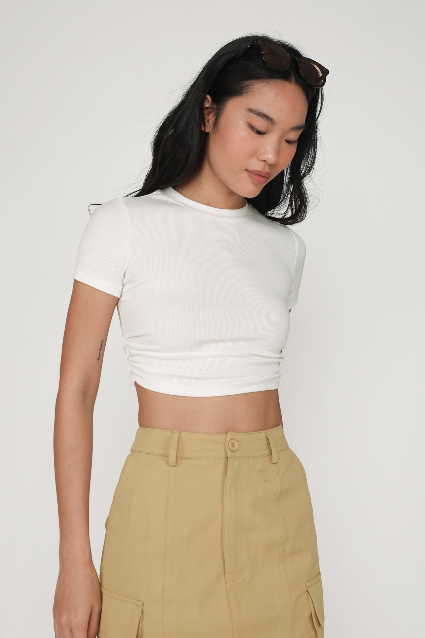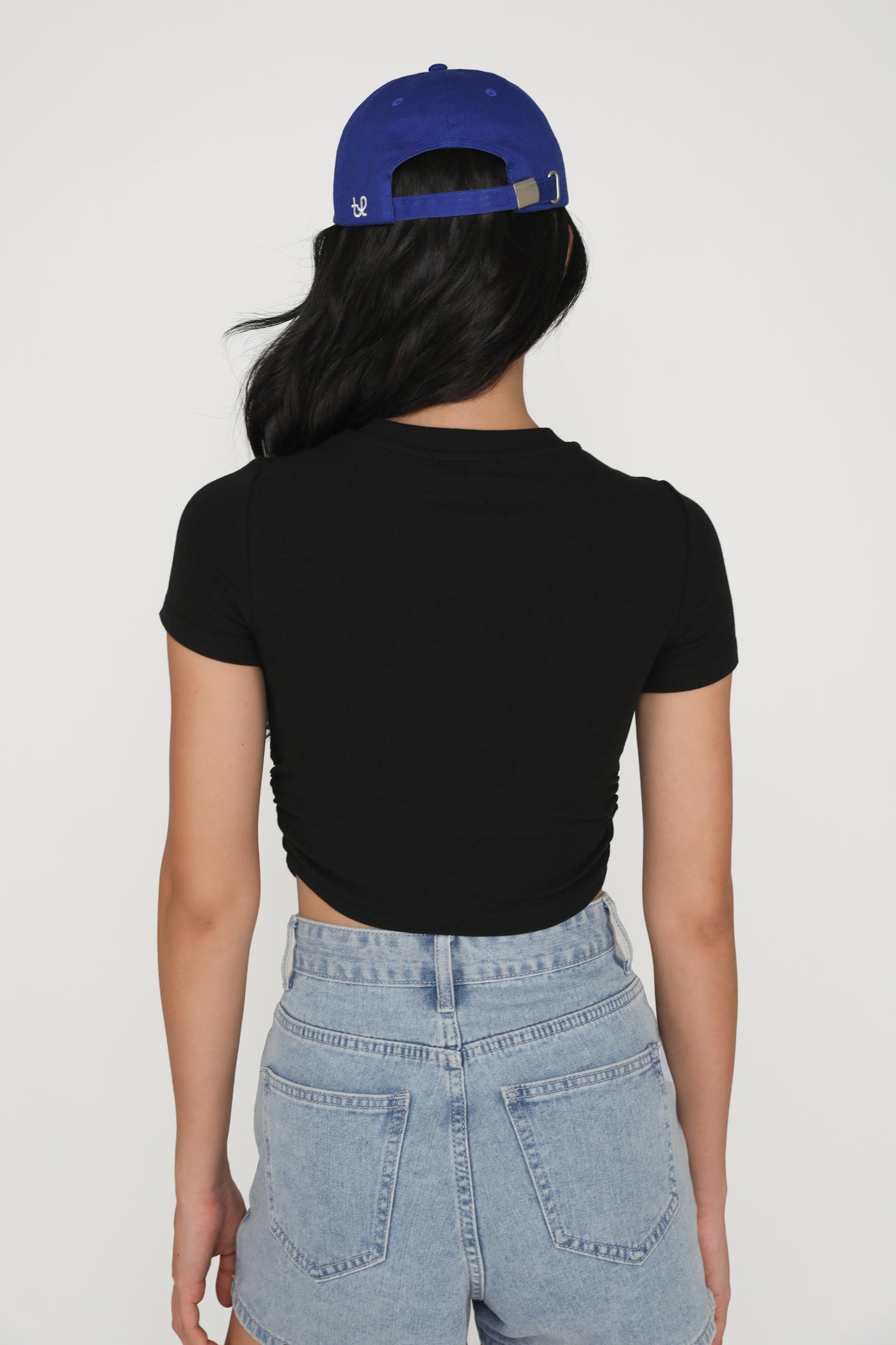 Level up your basics with Marcelo. Marcelo Side Ruched Basic Tee flaunts a classic baby tee silhouette that is simple and versatile. Peek the ruched details along the sides that give the piece a fresh and cool flair. Toss this on with your favourite pair of bottoms and you're ready to slay the day!