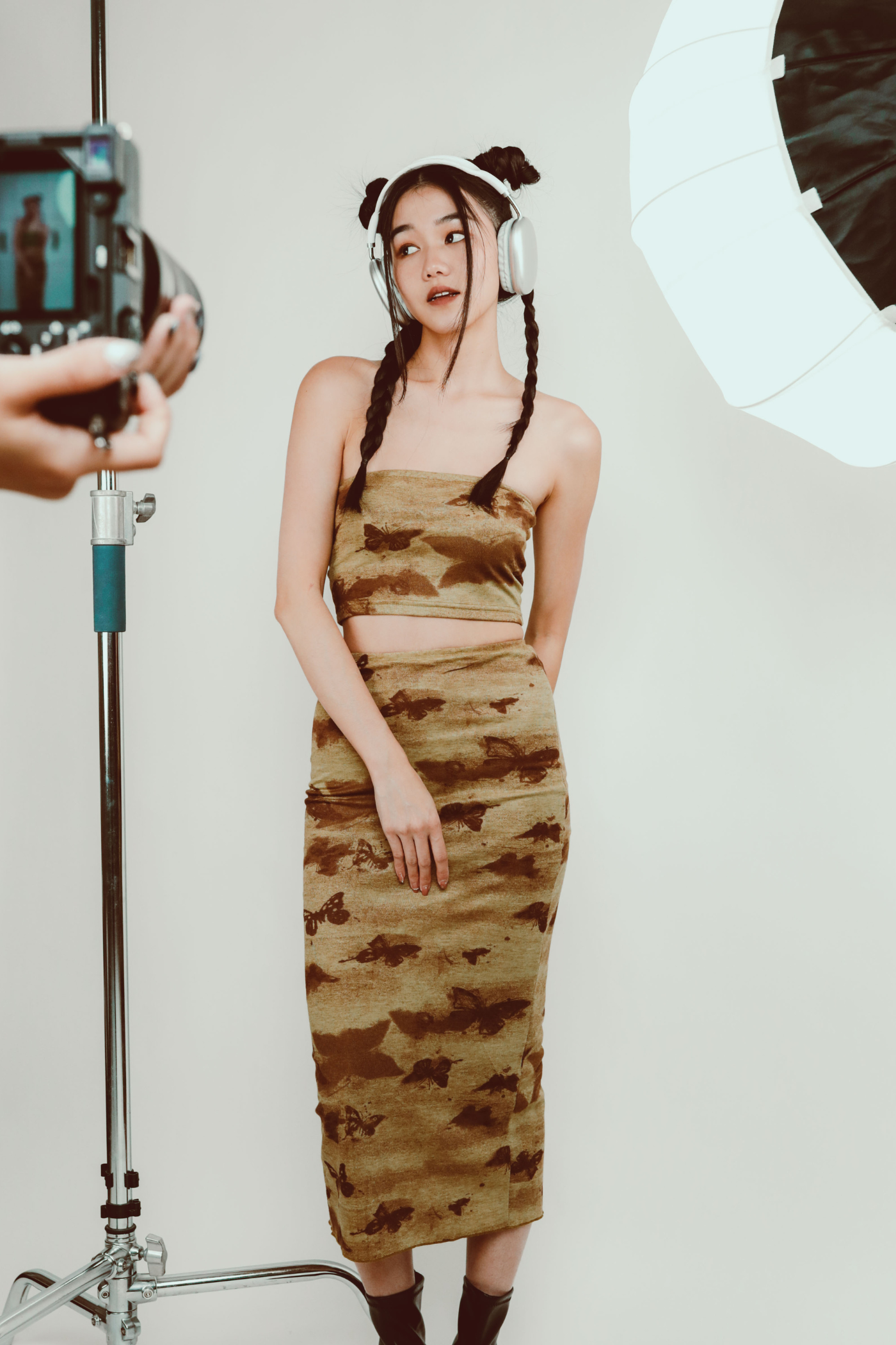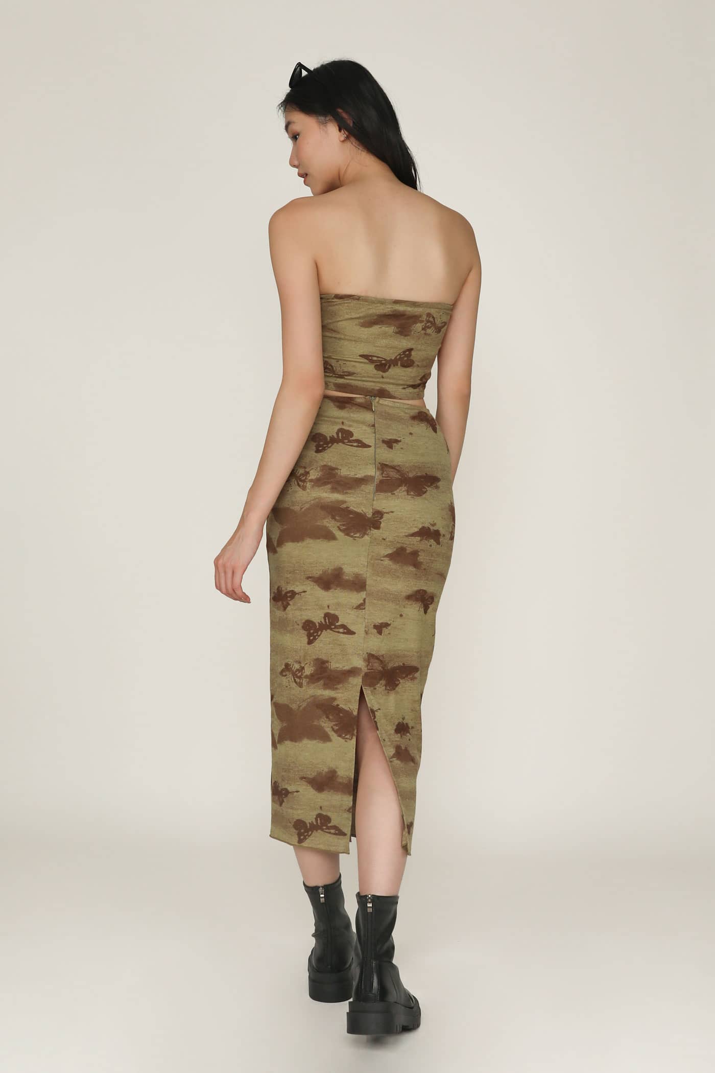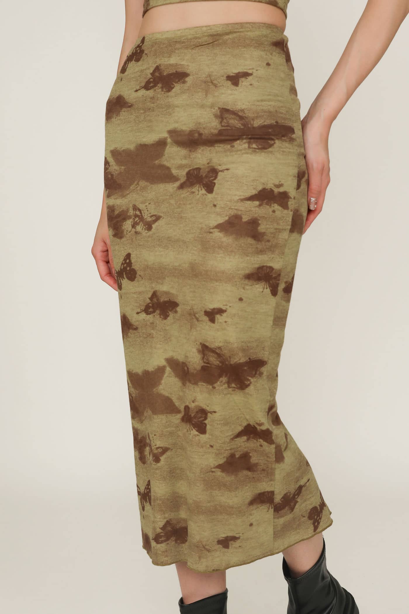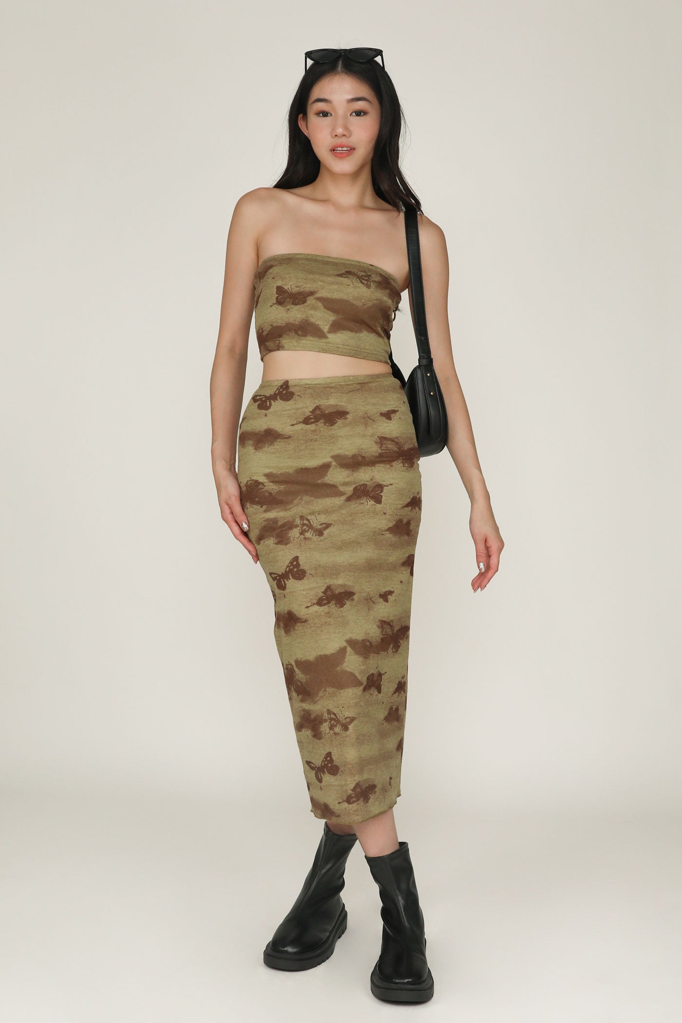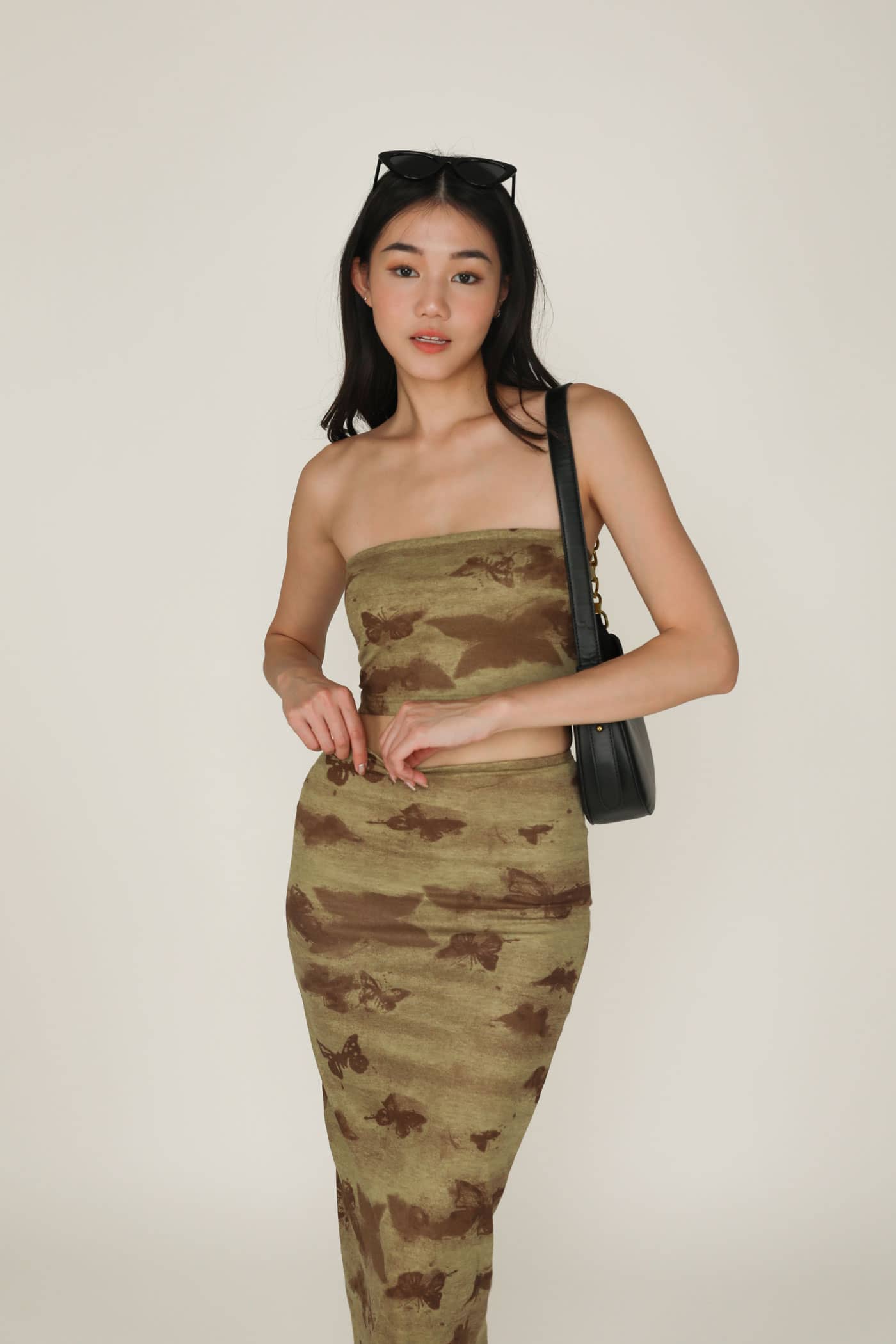 Flaunt your Y2K style with Alayna. Alayna Midi Skirt is a simple figure-hugging skirt decorated with a playful vintage butterfly print for a splash of trendy edge. It is a unique and refreshing piece to give your weekends a touch of youthful spice. Style it with your favourite tops or as a co-ord with our Lila Tube Top.
