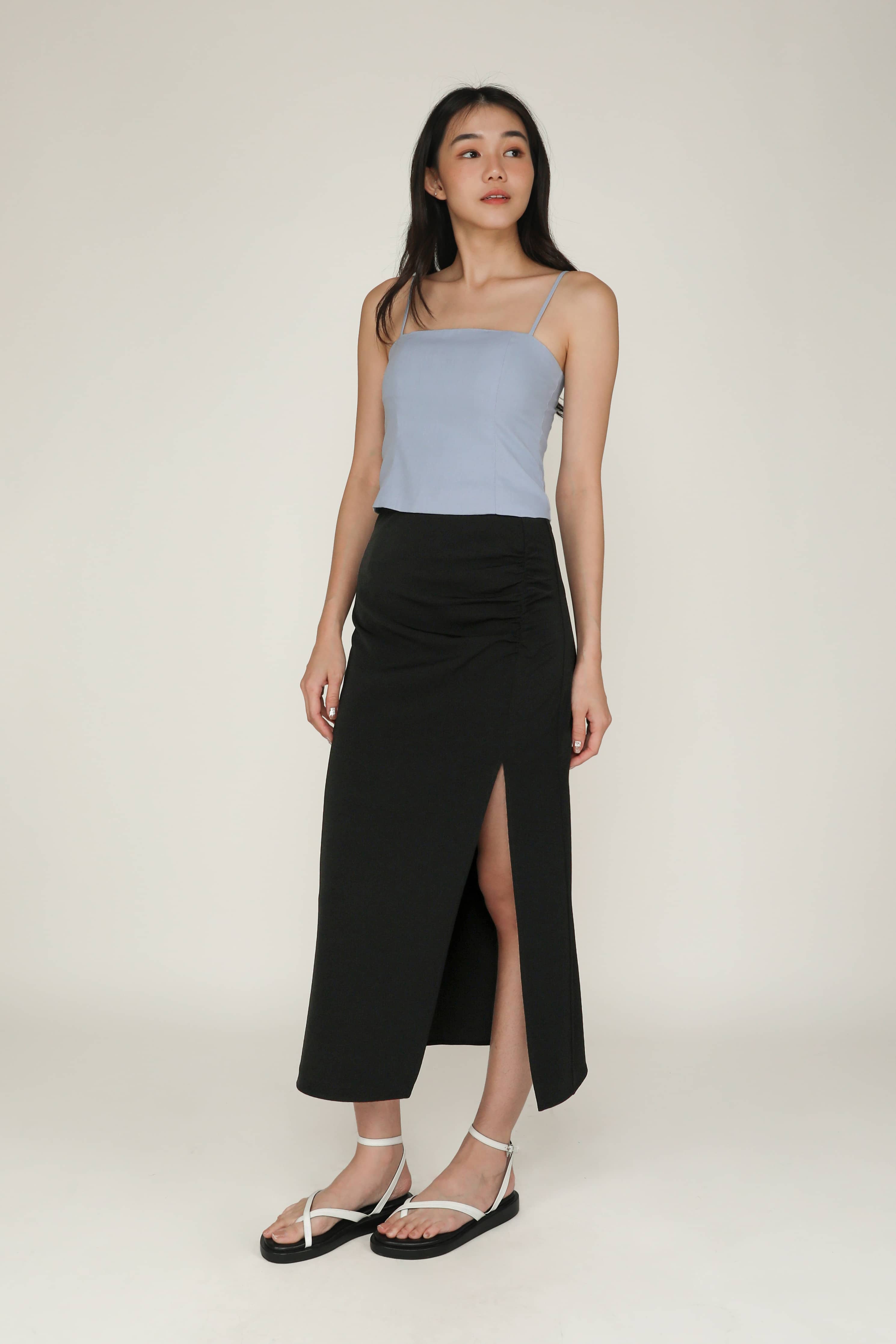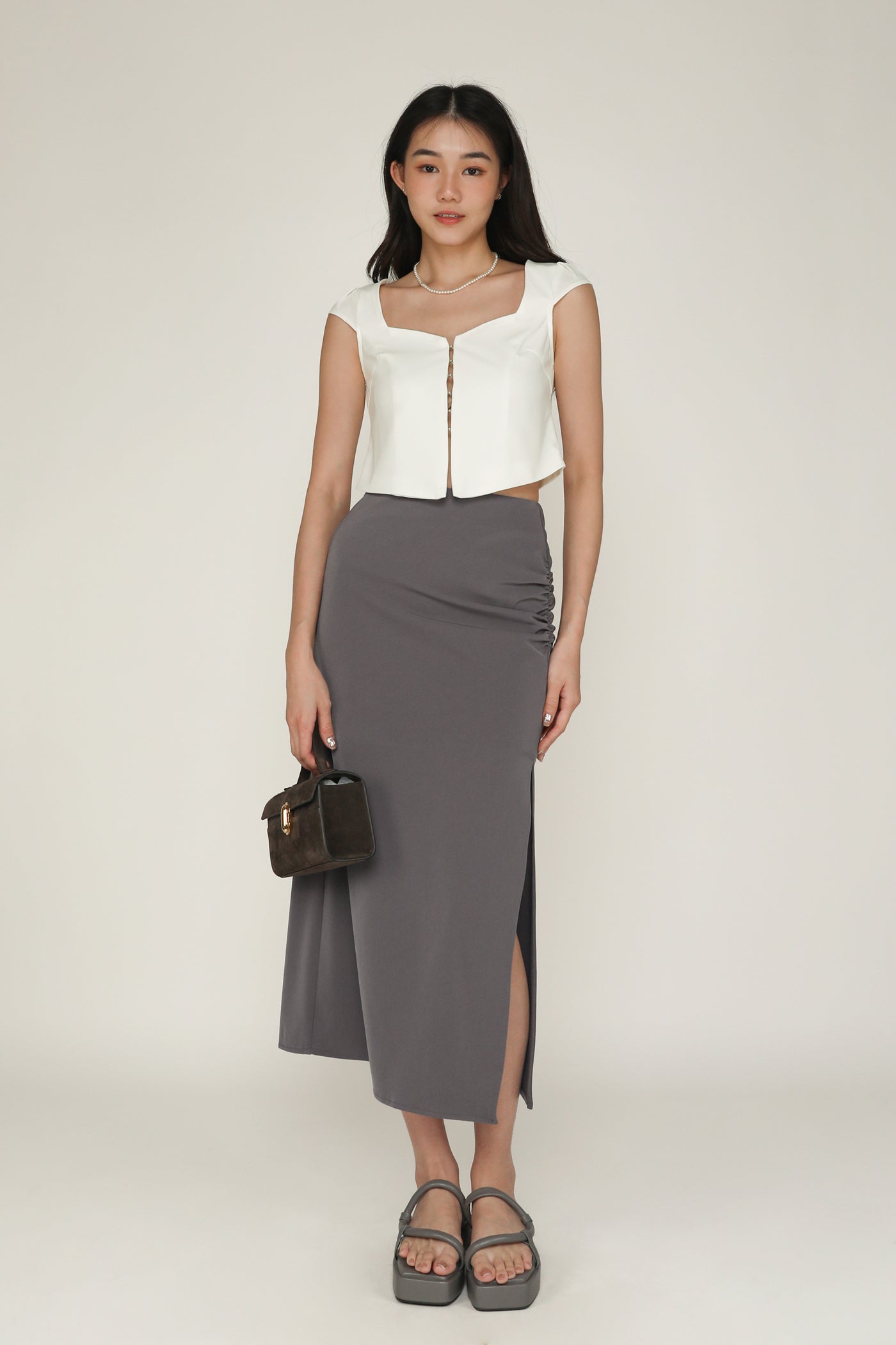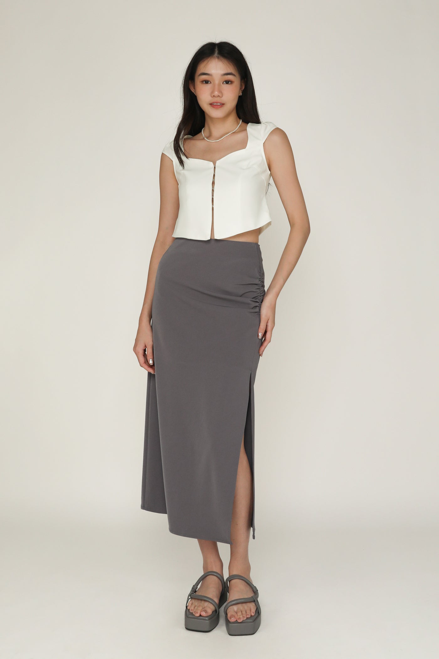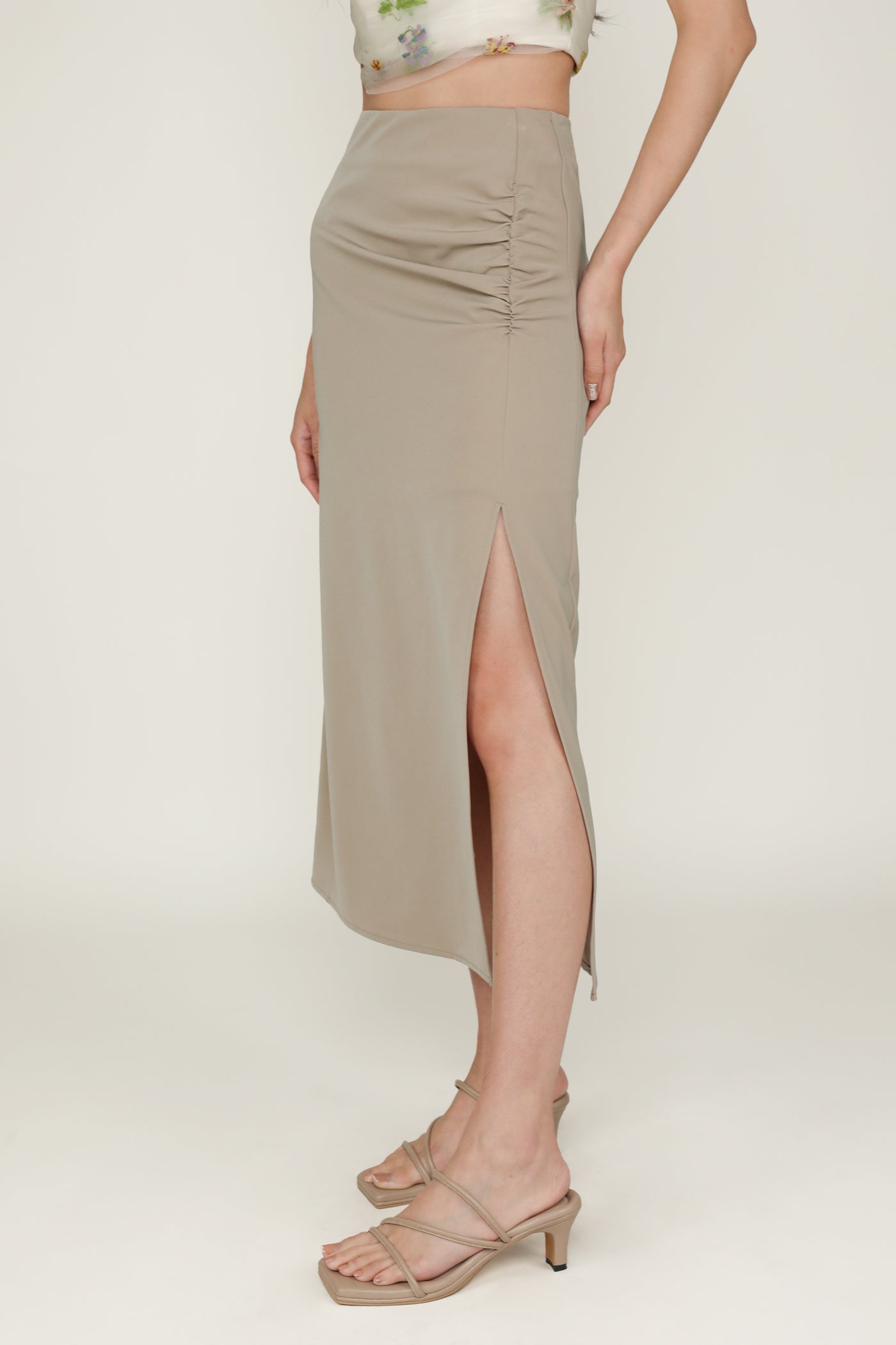 Invite timeless silhouettes with Amina. Amina Ruched Side Midi Skirt keeps it chic and simple with an elegant side slit and feminine ruched details. This midi skirt will add a subtle charm to your weekend looks. Style this with a simple crop top for a fresh and flattering outfit.