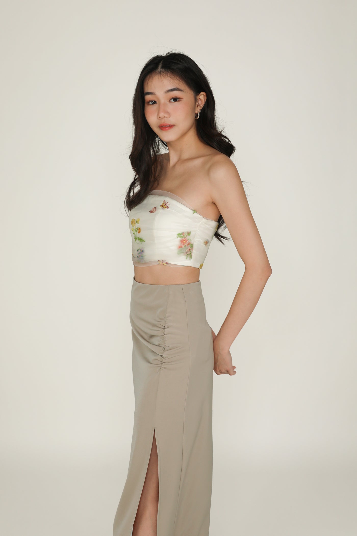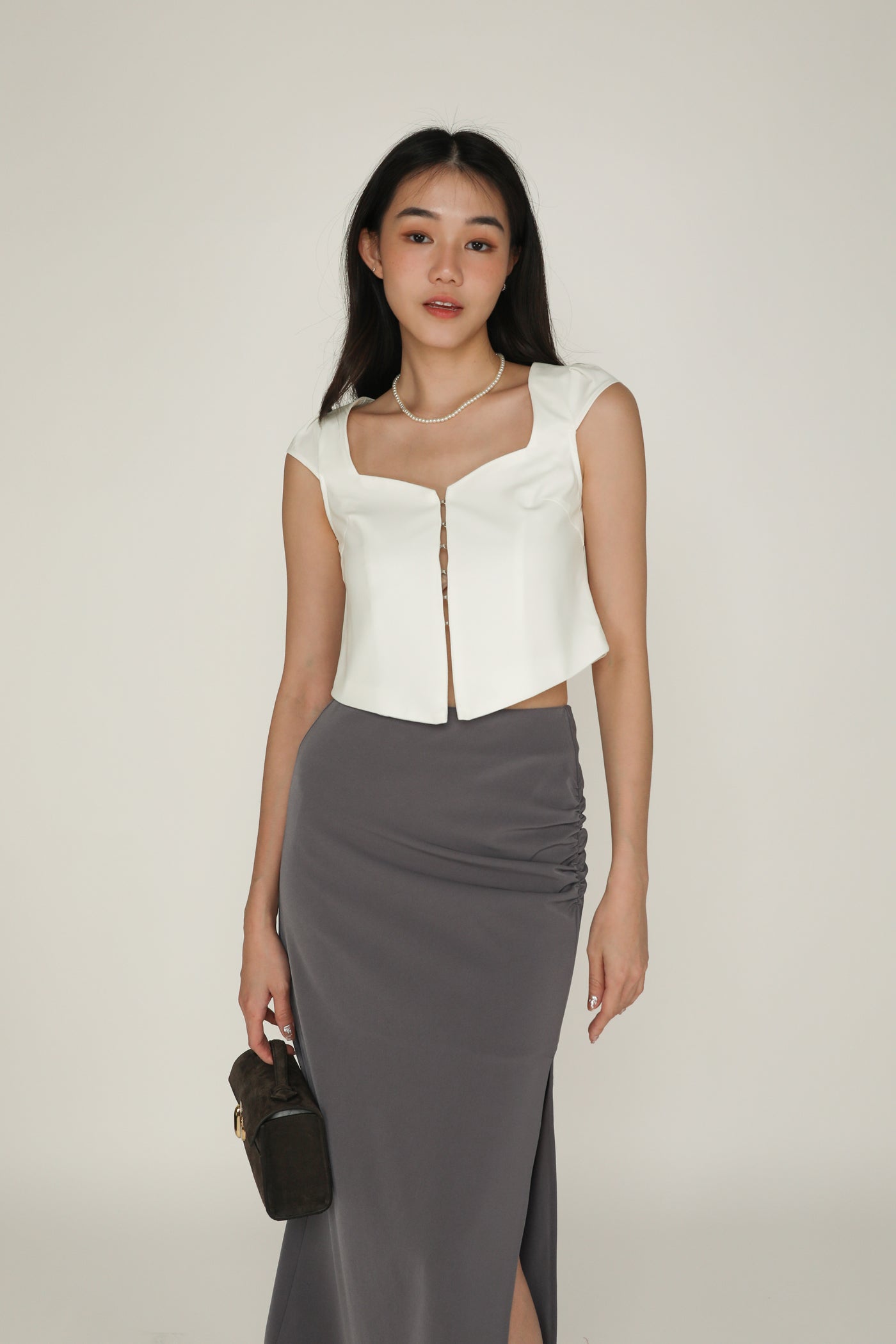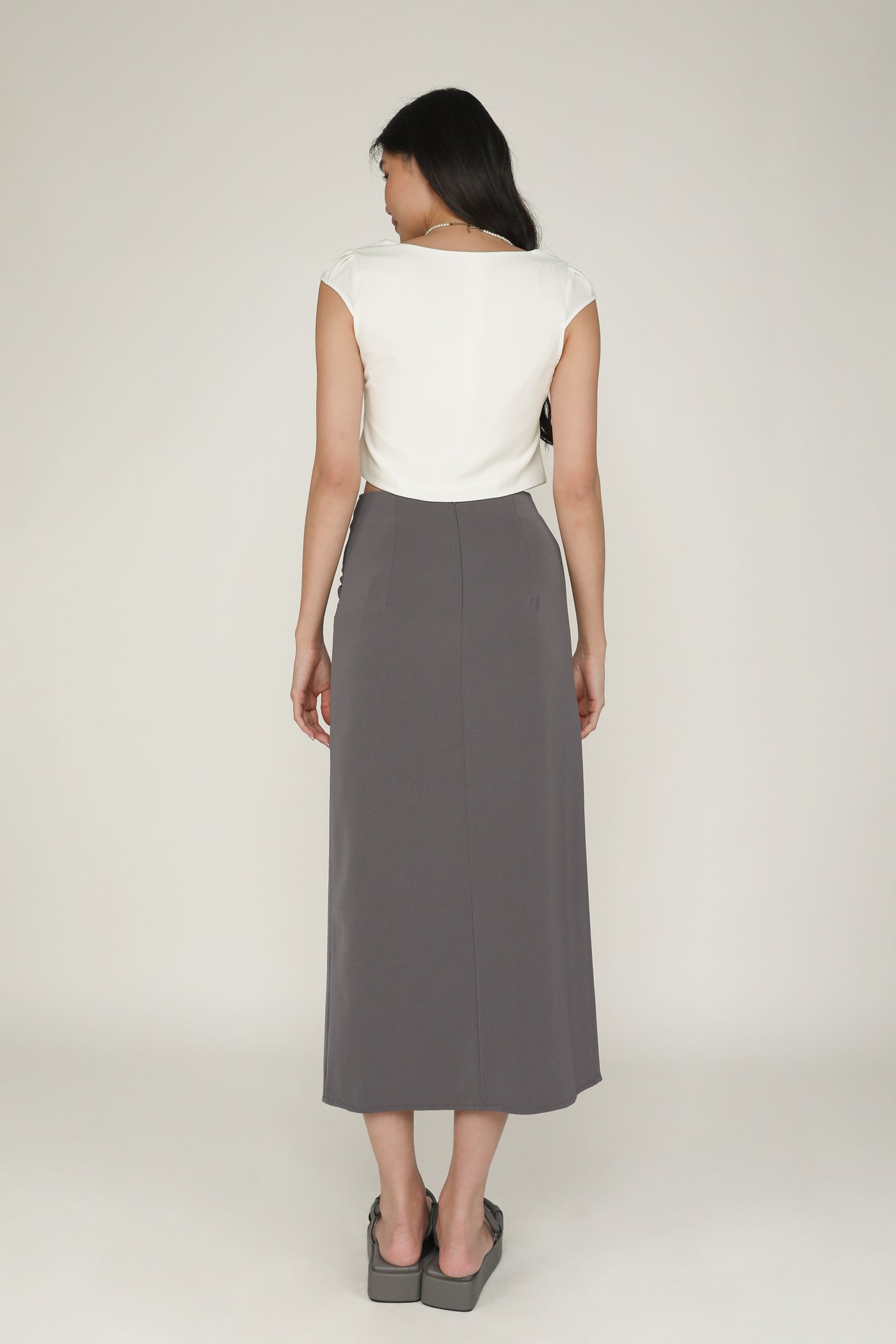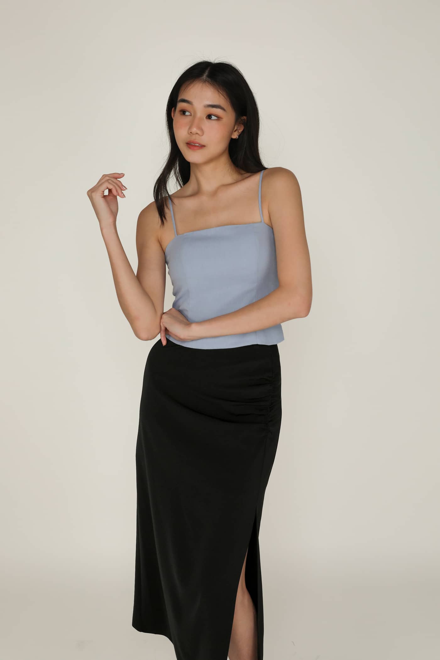 Invite timeless silhouettes with Amina. Amina Ruched Side Midi Skirt keeps it chic and simple with an elegant side slit and feminine ruched details. This midi skirt will add a subtle charm to your weekend looks. Style this with a simple crop top for a fresh and flattering outfit.