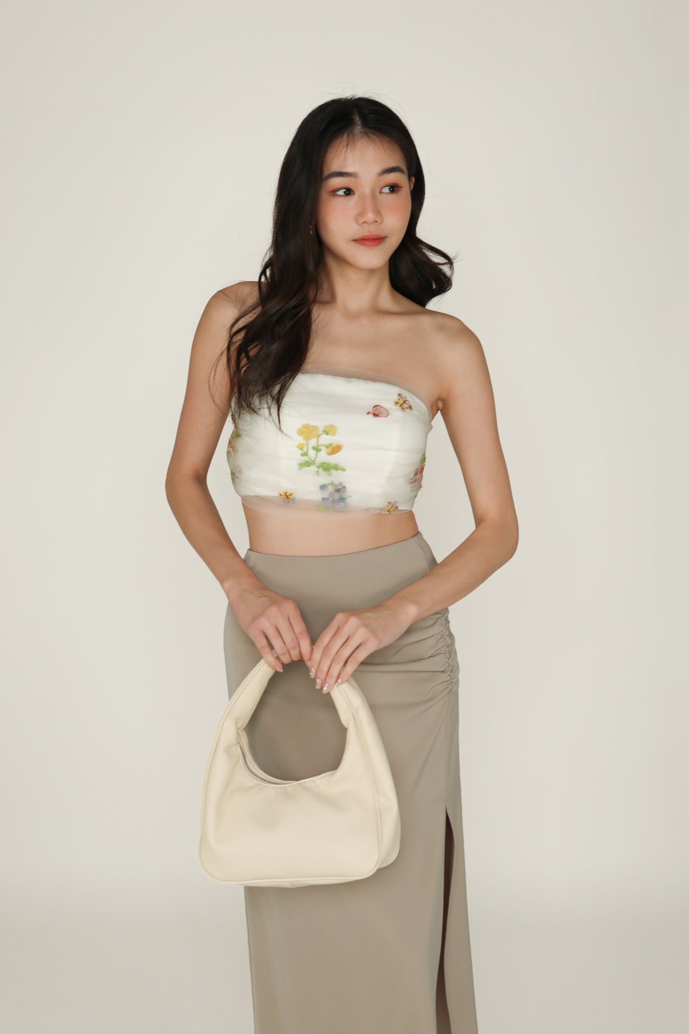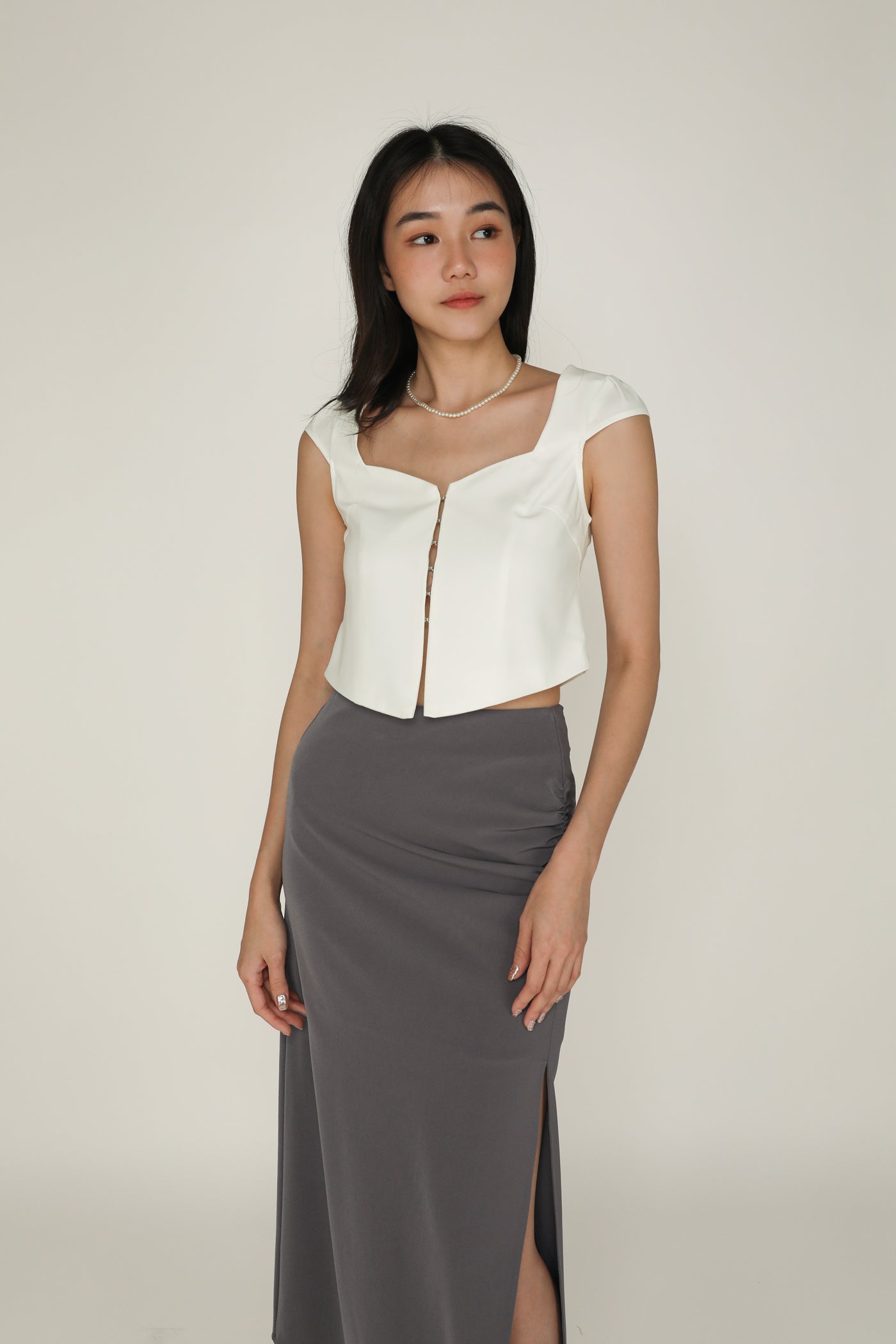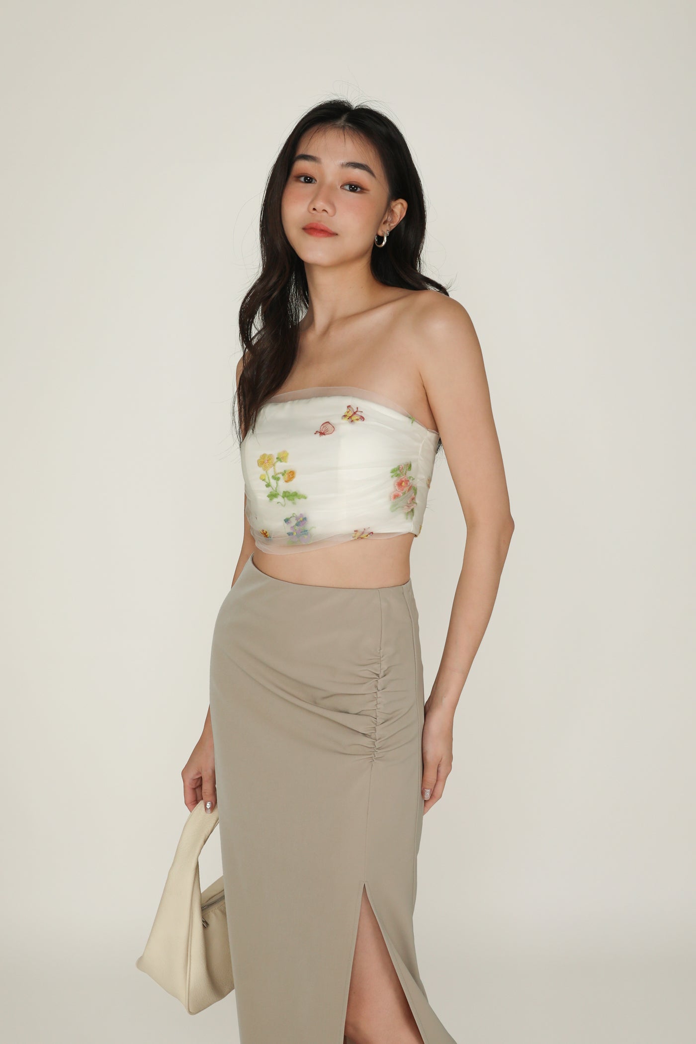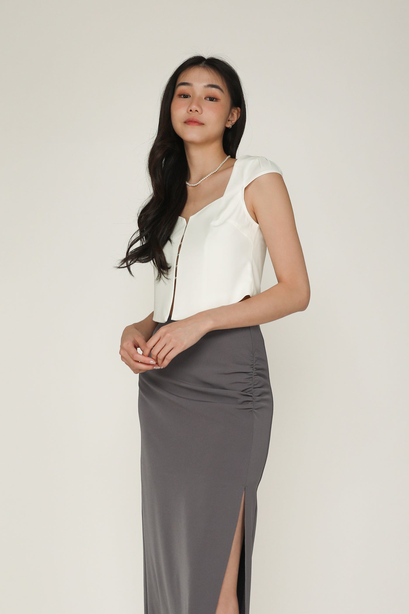 Invite timeless silhouettes with Amina. Amina Ruched Side Midi Skirt keeps it chic and simple with an elegant side slit and feminine ruched details. This midi skirt will add a subtle charm to your weekend looks. Style this with a simple crop top for a fresh and flattering outfit.