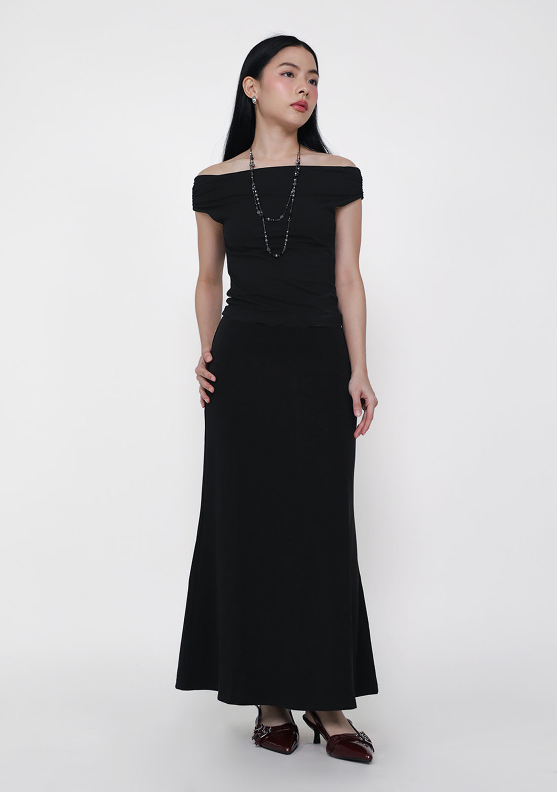 Mollie is here to give your outfit a sweet twist. Tiny polka dots add a soft, retro feel, while the off-shoulder neckline frames your collarbone beautifully. Made from stretchy cotton spandex, she offers both comfort and charm — making her your go-to for brunches, dates, and beyond.