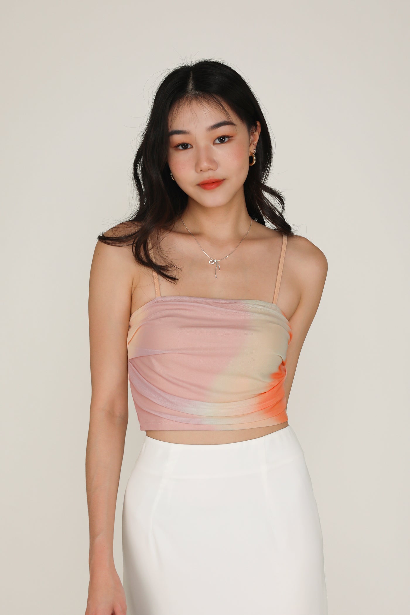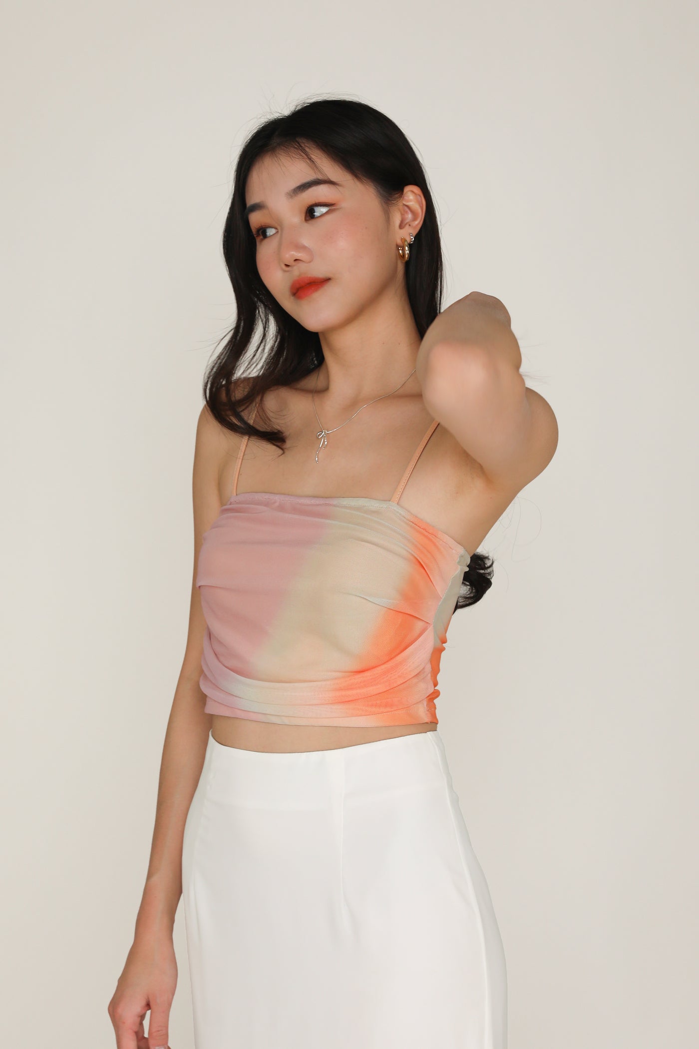 Capture that sunset glow with Catrin. Catrin Mesh Ruched Crop Top is a sweet, feminine piece for your evening looks. The piece features lightweight mesh textures and subtle ruching details for a delicate accent. The intricate blend of pink and orange hues makes this piece an elegant yet casual piece to add to your wardrobe. A radiant pop of colour for special occasions.