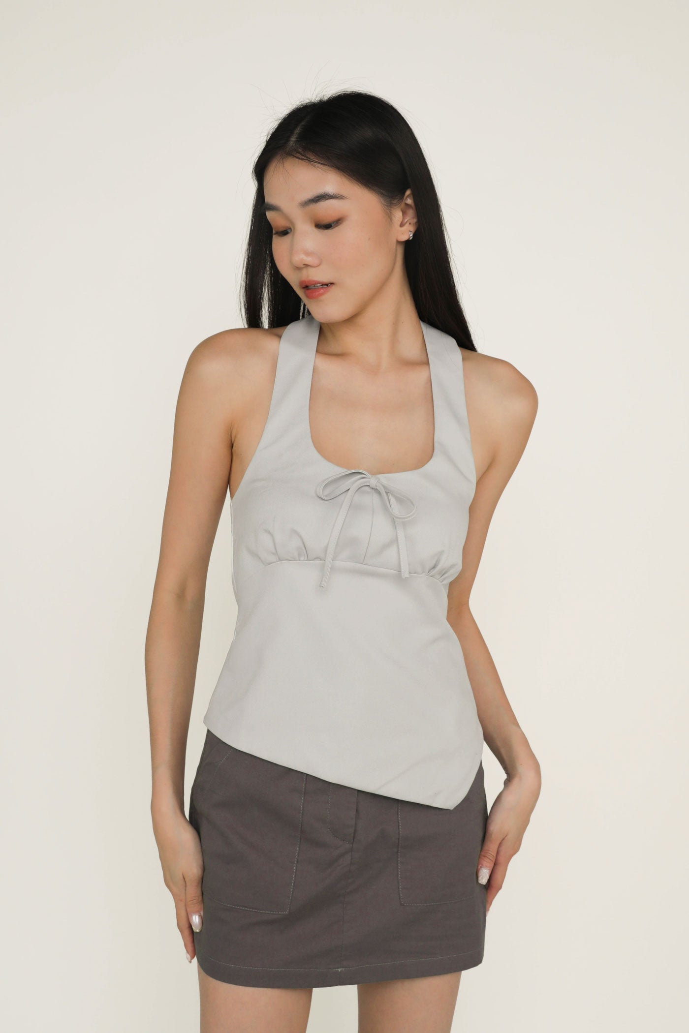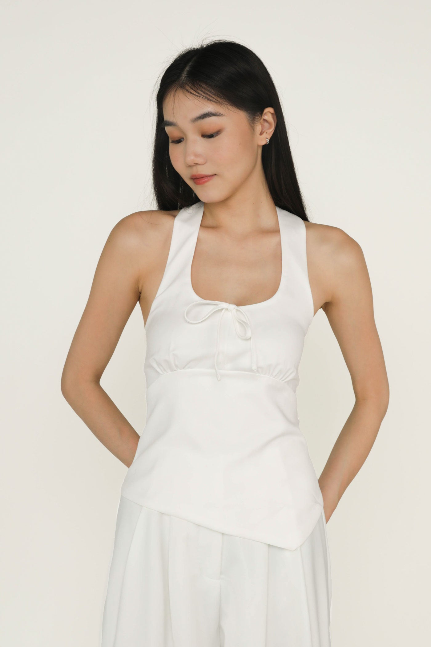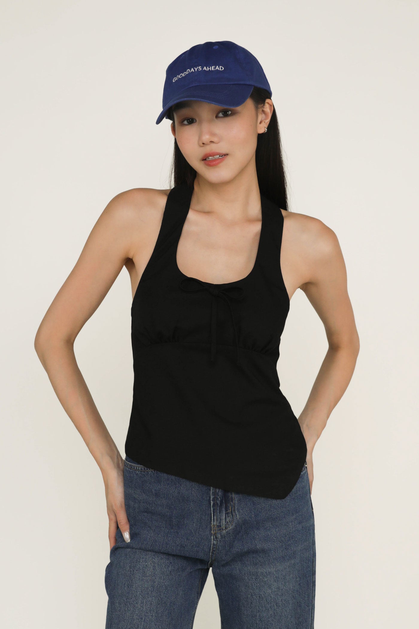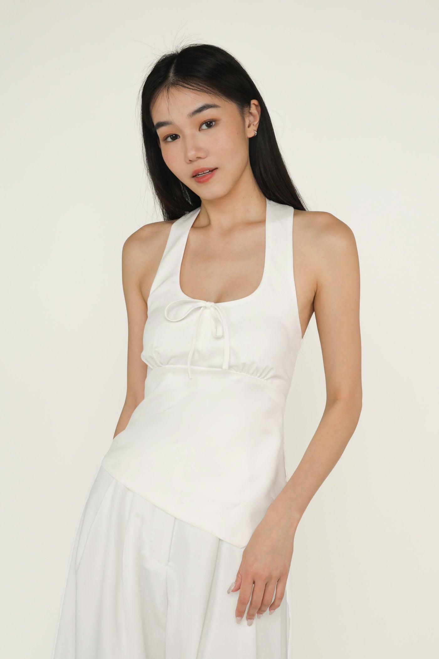 Embrace chic simplicity with Kylene. Kylene Asymmetrical Halter Top is a contemporary piece that effortlessly combines style and versatility. This top features an asymmetrical hem and a ribbon detail on the front. Whether you're dressing up for a night out or keeping it casual for brunch with friends, Kylene brings a minimalistic yet unique statement to any outfit.
