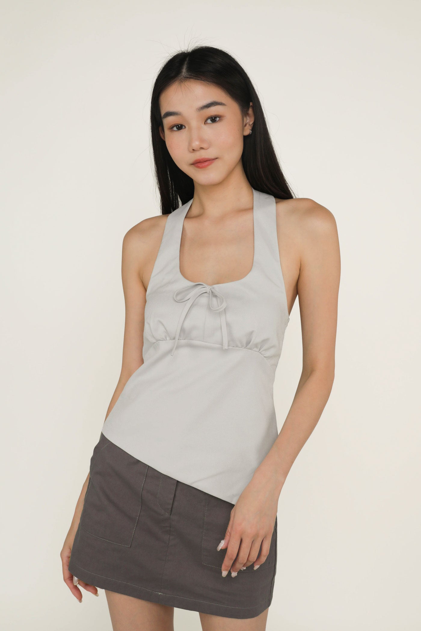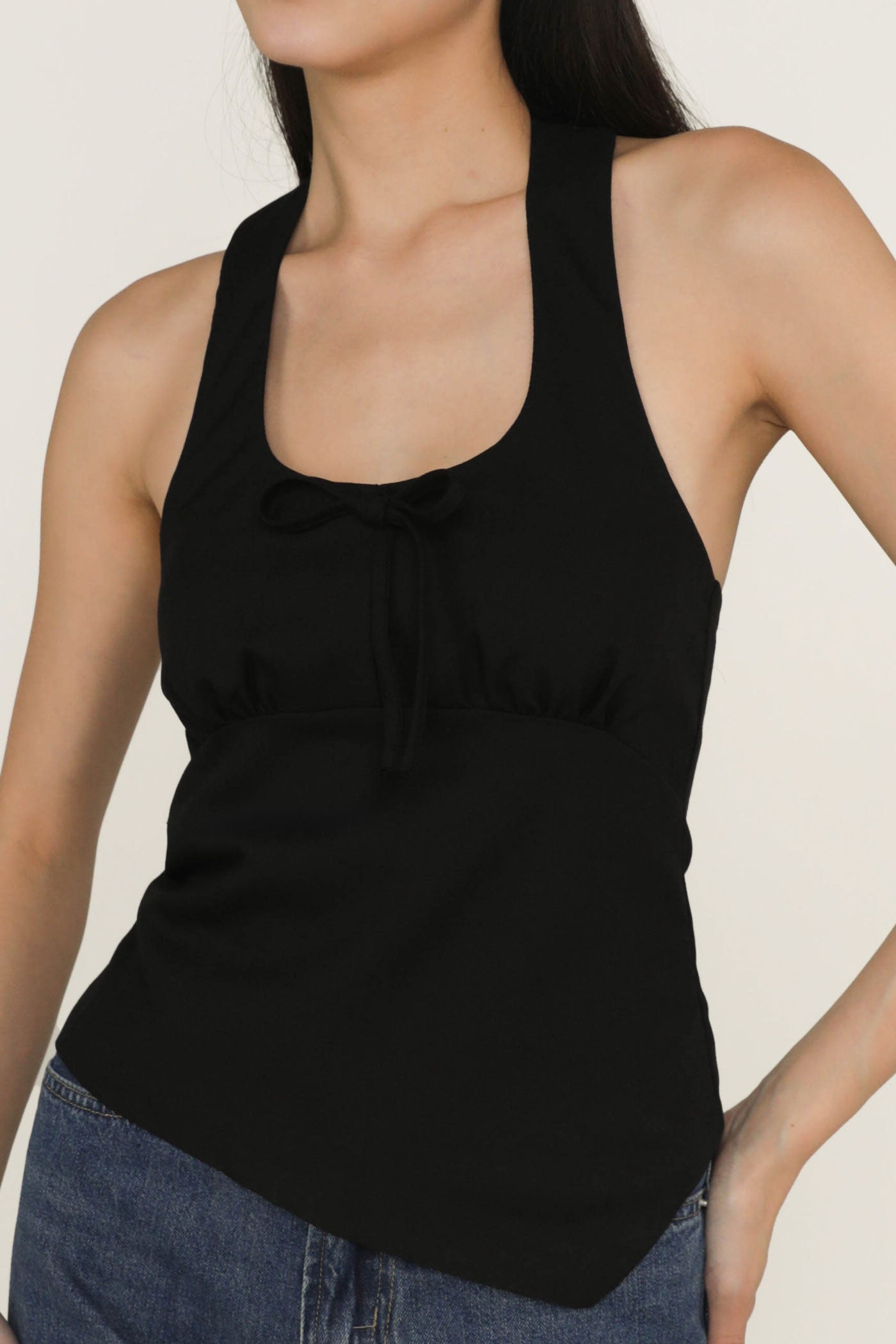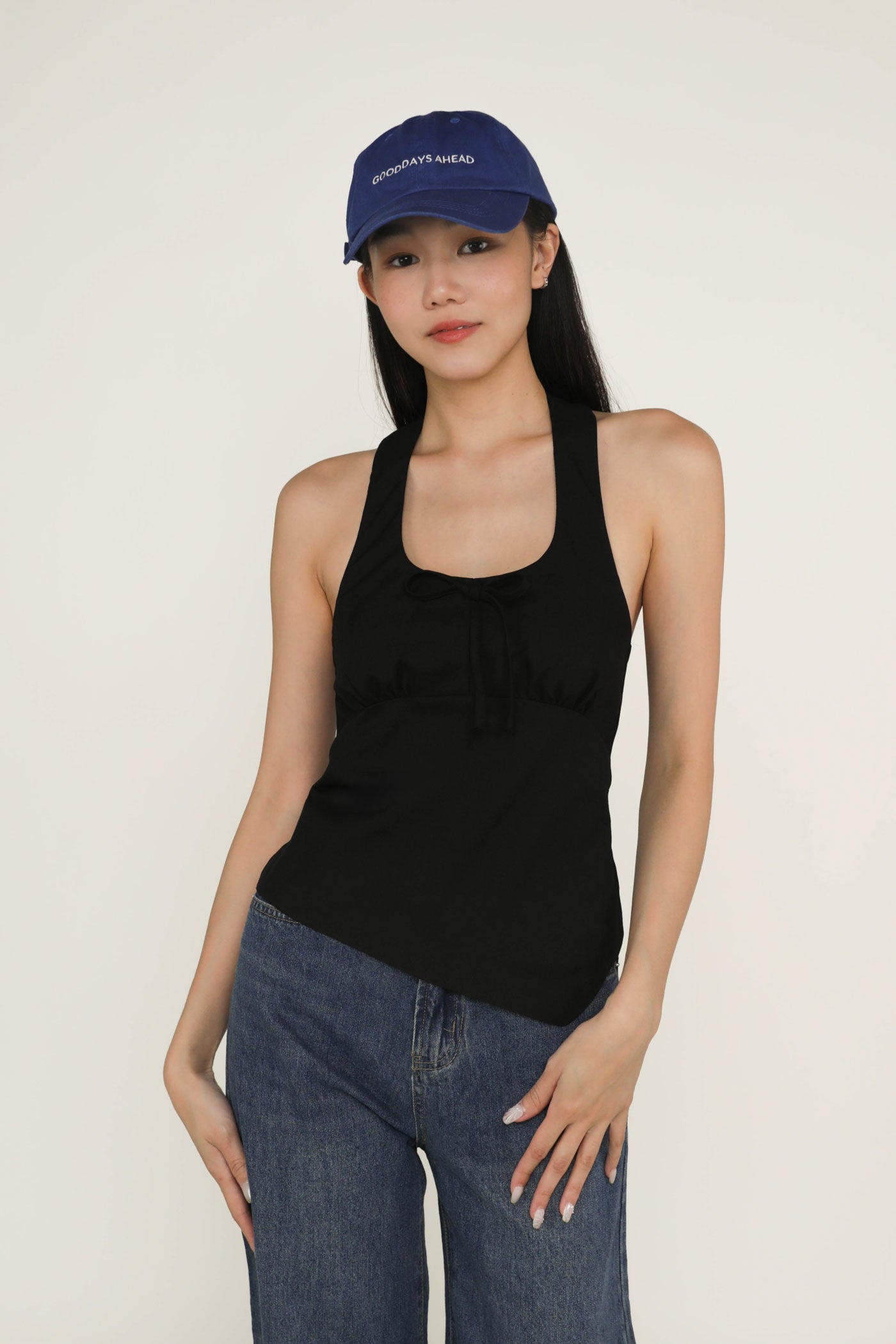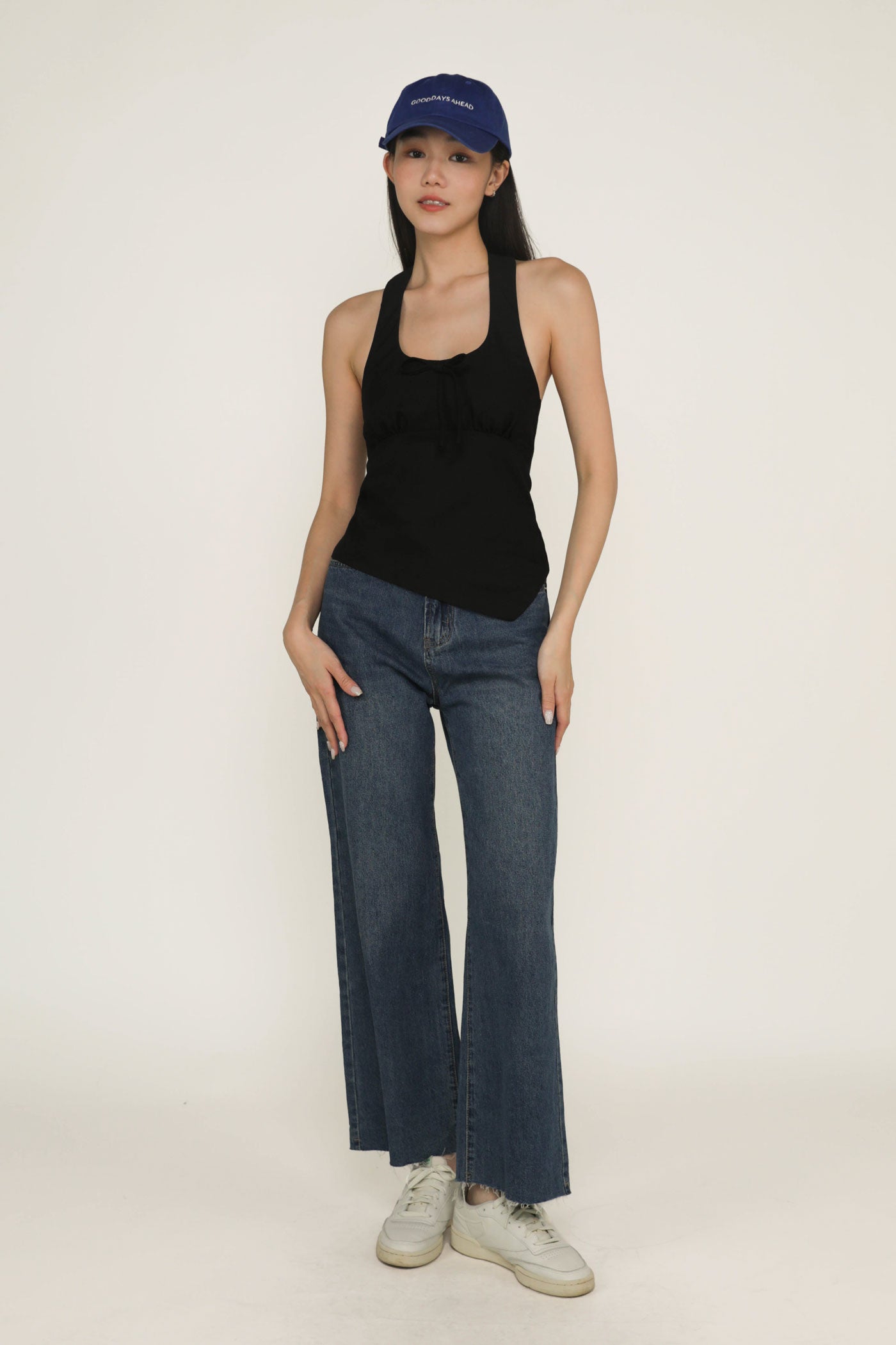 Embrace chic simplicity with Kylene. Kylene Asymmetrical Halter Top is a contemporary piece that effortlessly combines style and versatility. This top features an asymmetrical hem and a ribbon detail on the front. Whether you're dressing up for a night out or keeping it casual for brunch with friends, Kylene brings a minimalistic yet unique statement to any outfit.