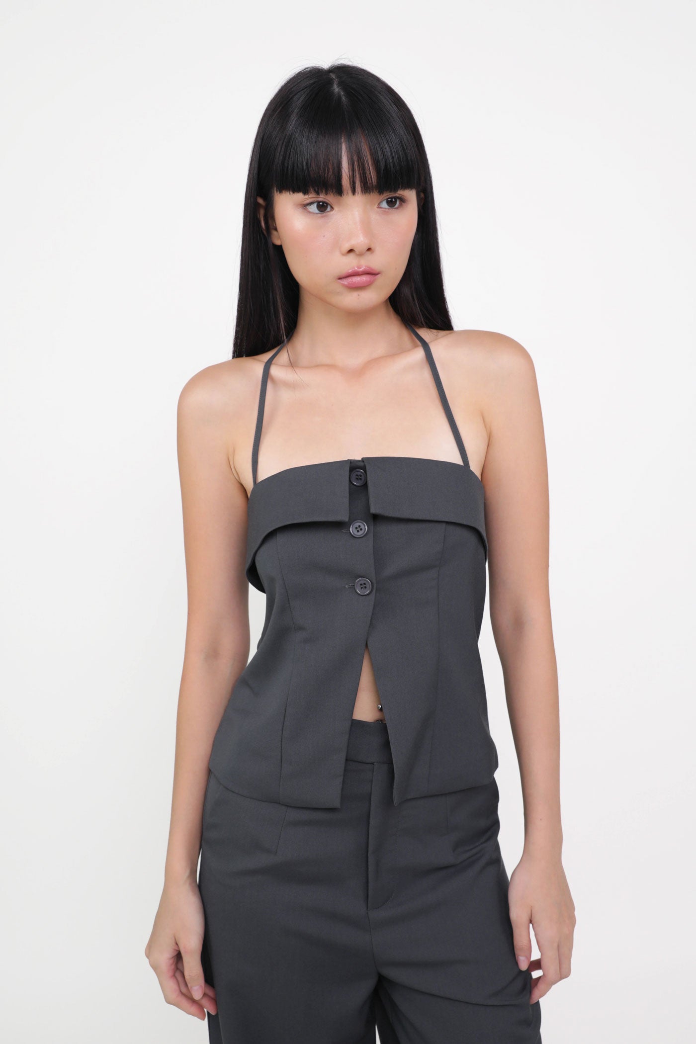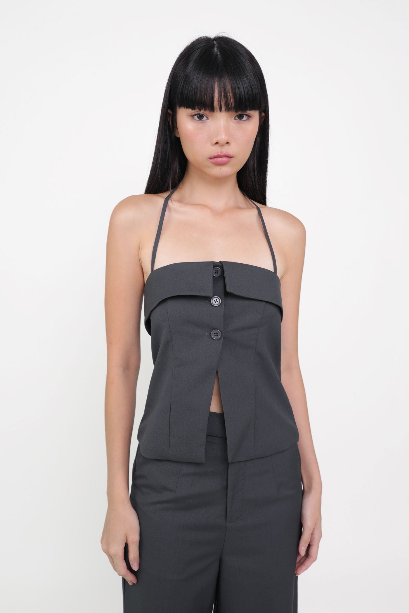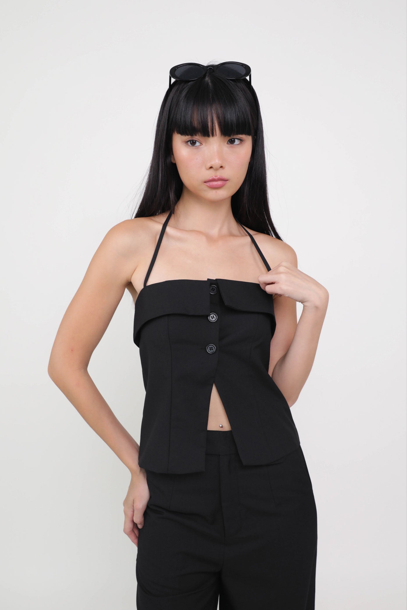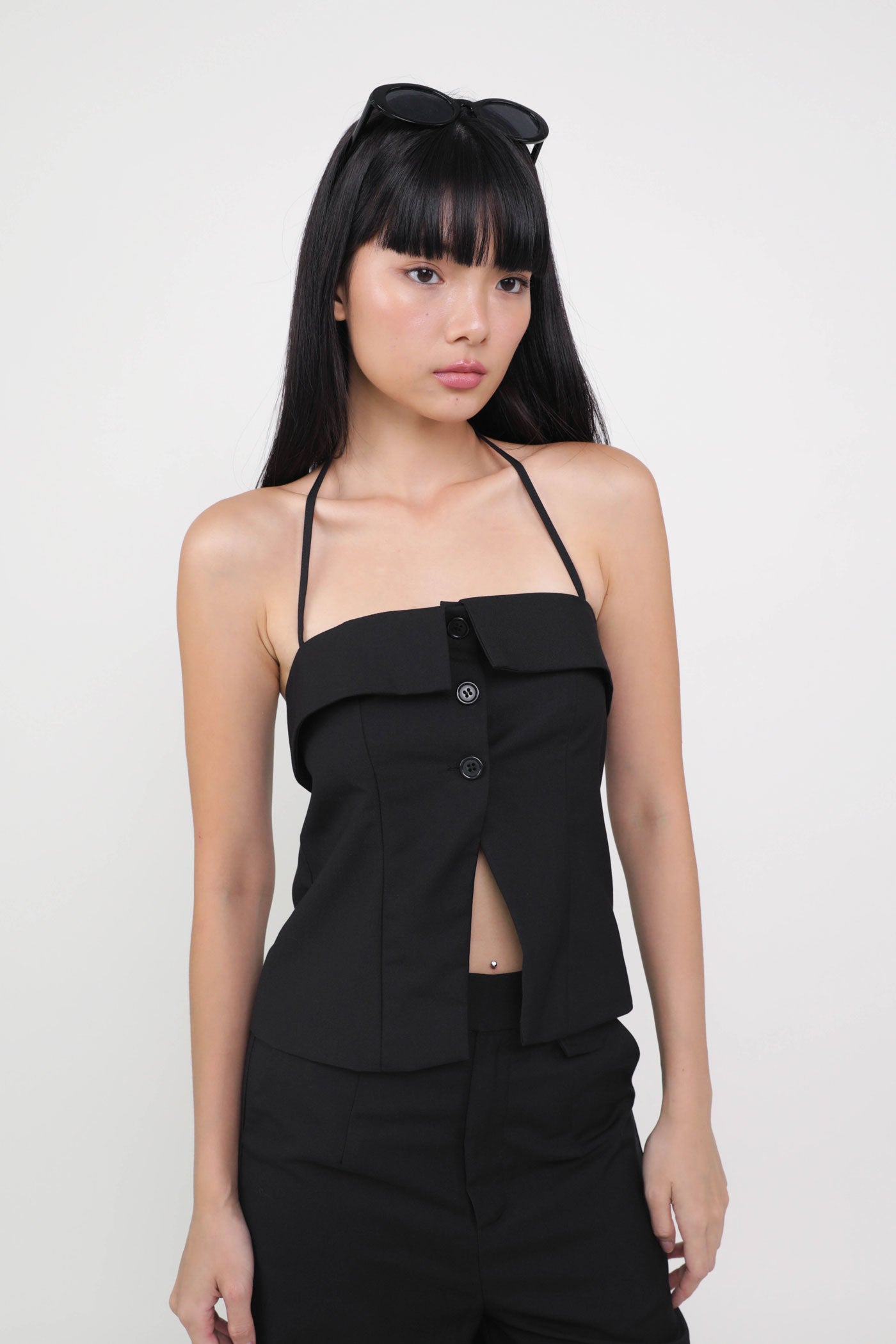 Keep things classy with Marissa. Marissa Tailored Halter Top is the epitome of chic elegance. This top features a timeless halter neckline and sleek button-up details. From office chic to first dates, this top never fails to leave a charming impression. Style it as a co-ord with our Harold Tailored Pants.