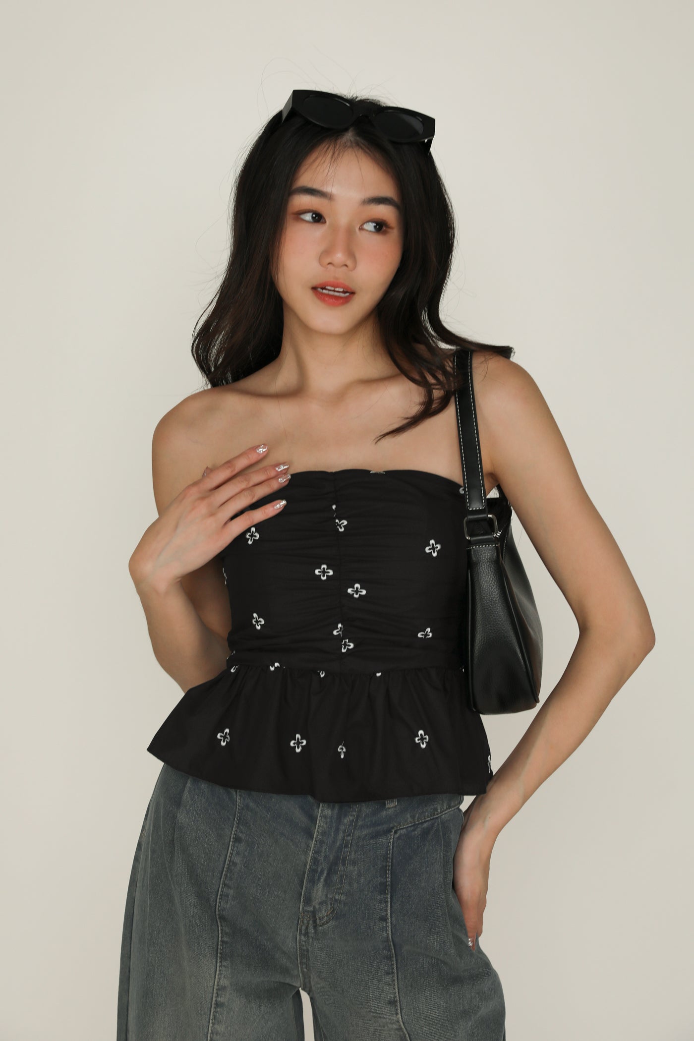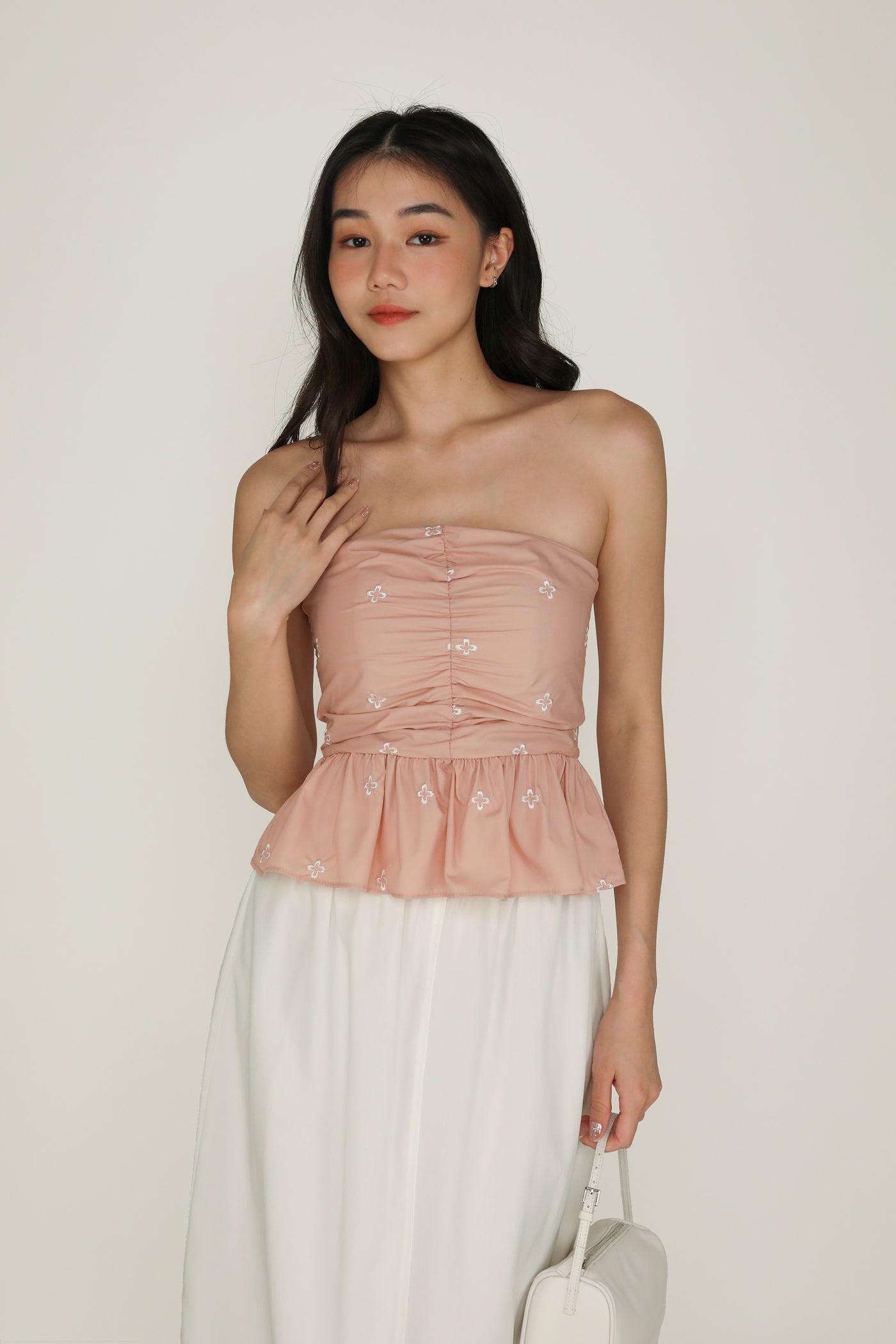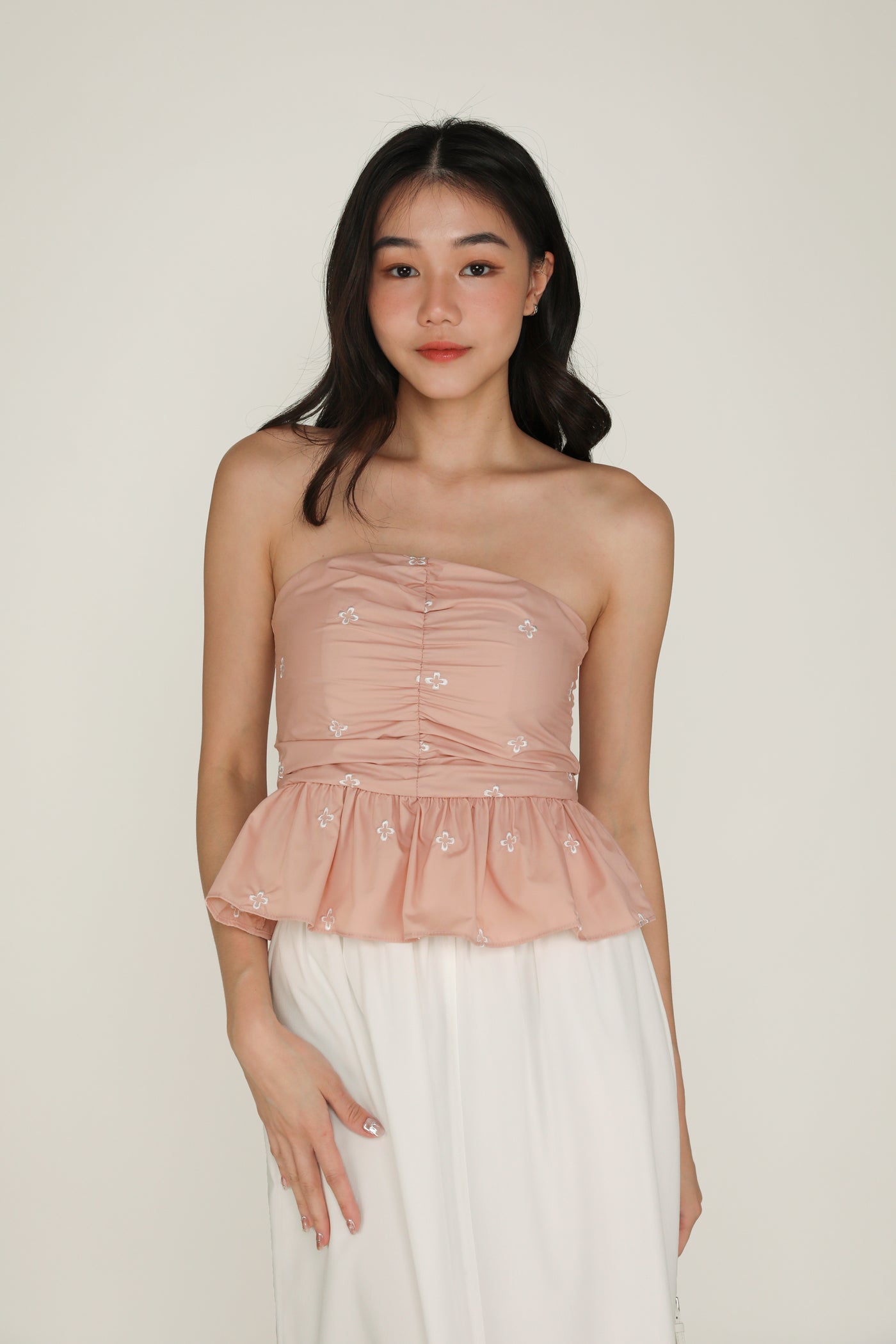 Nina is the icing on the cake for your weekend outfits. This refreshing tube top boasts a babydoll silhouette for a timeless, flattering fit. It is also decorated with abstract floral embroidery and ruching along the front for a feminine flair. Pair Nina with some simple denim shorts or a flowy maxi skirt for a dreamy ensemble.
