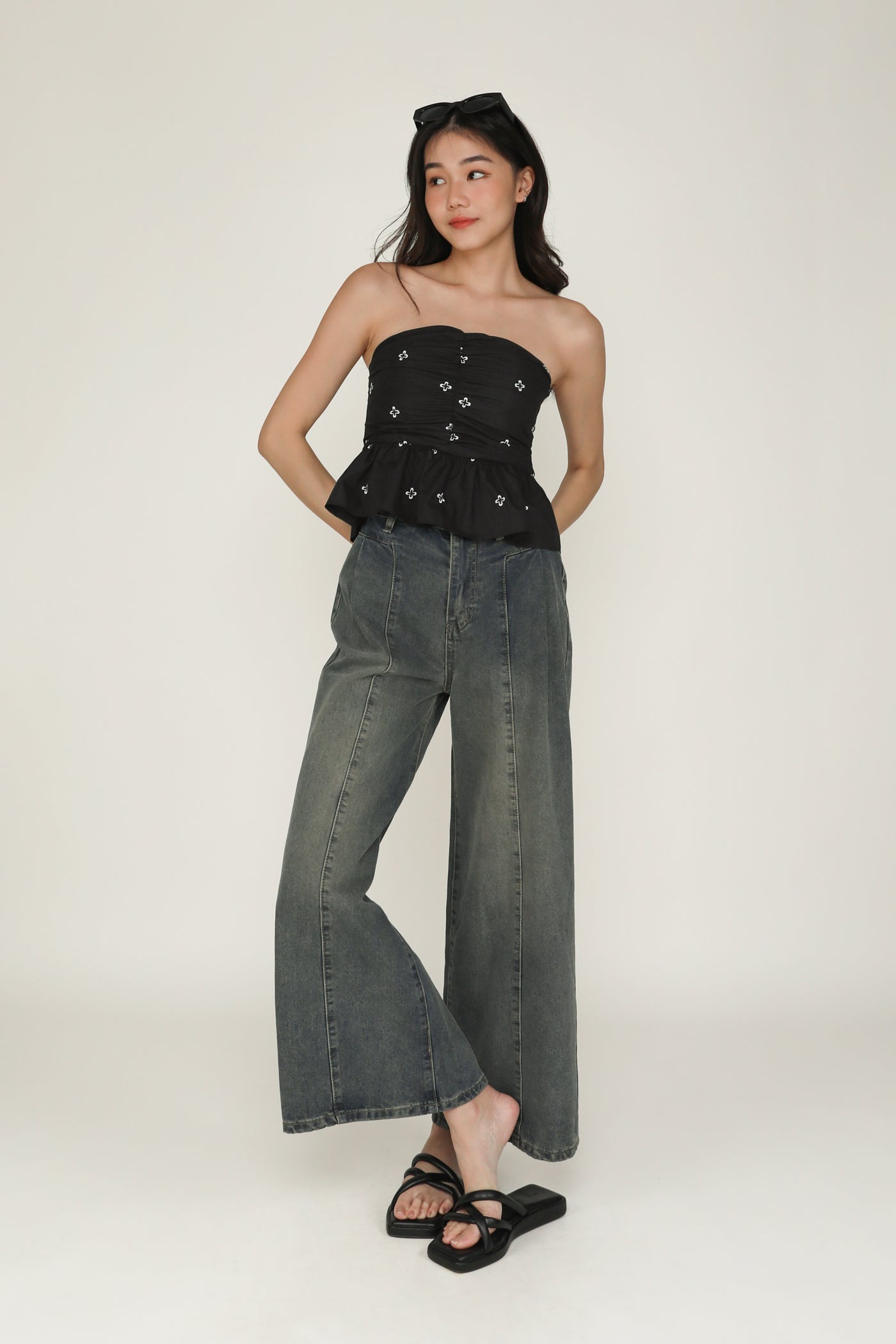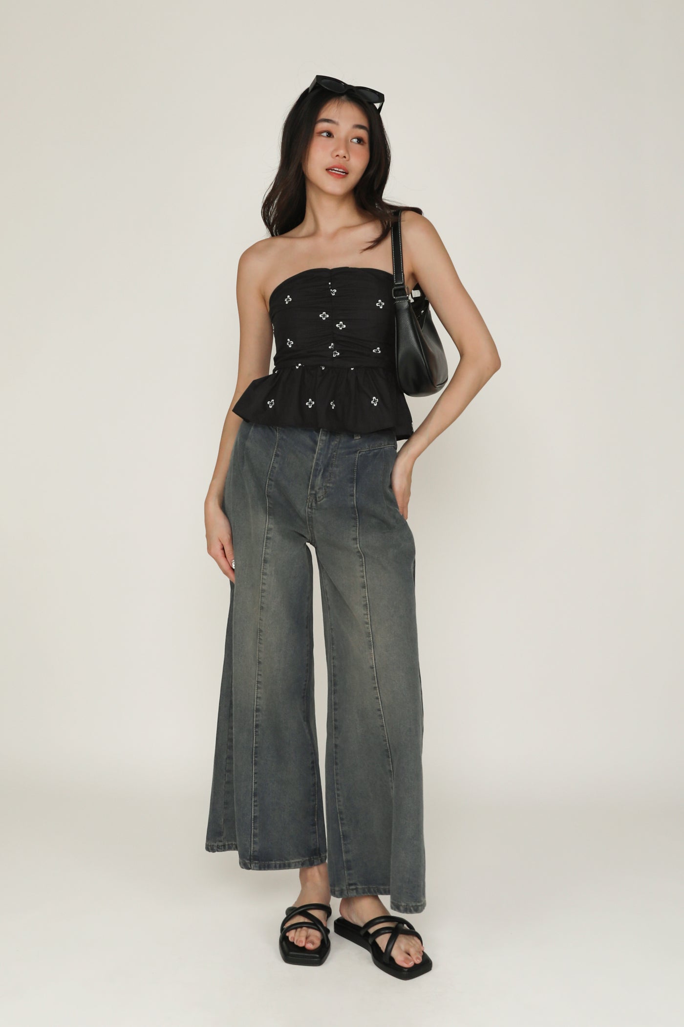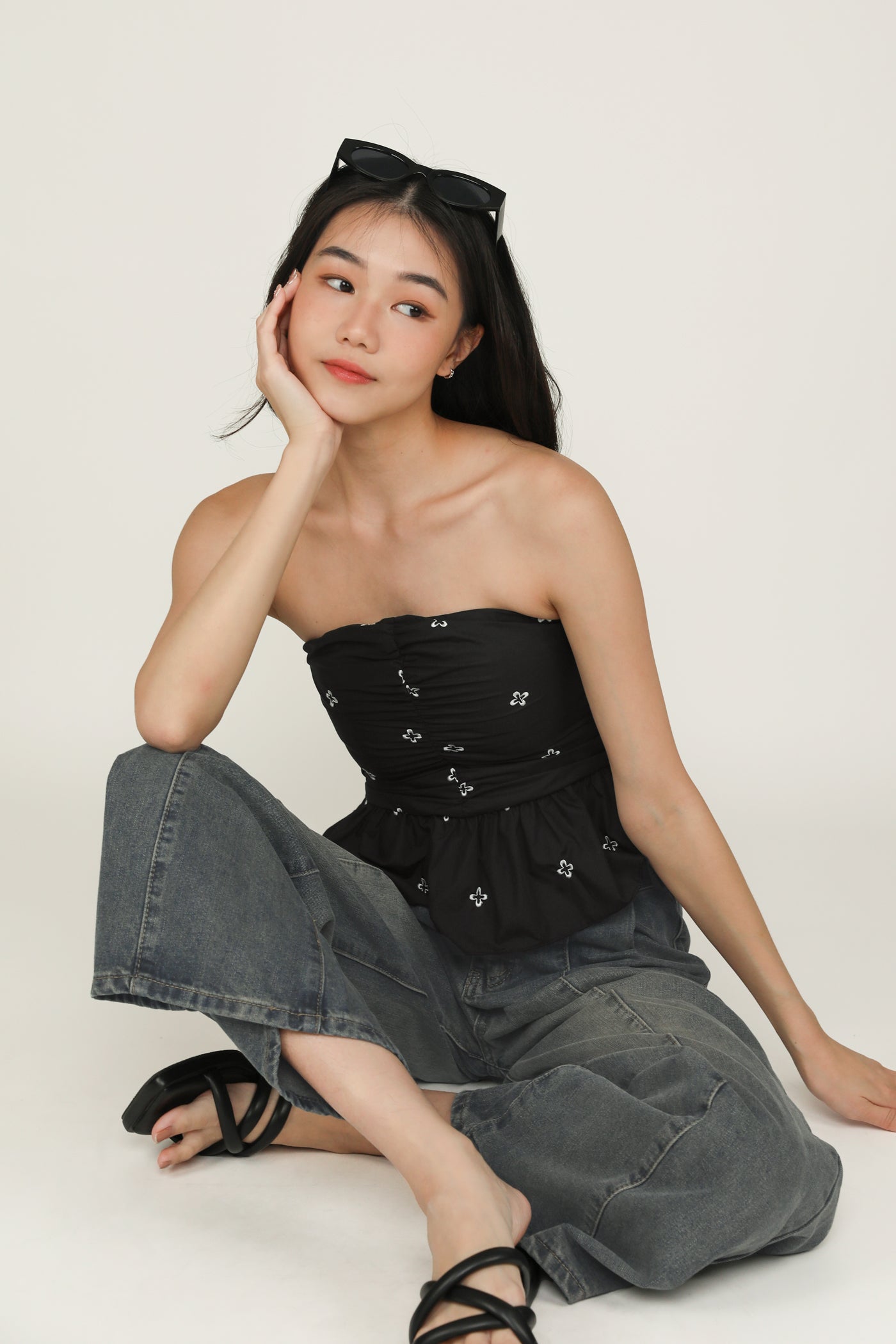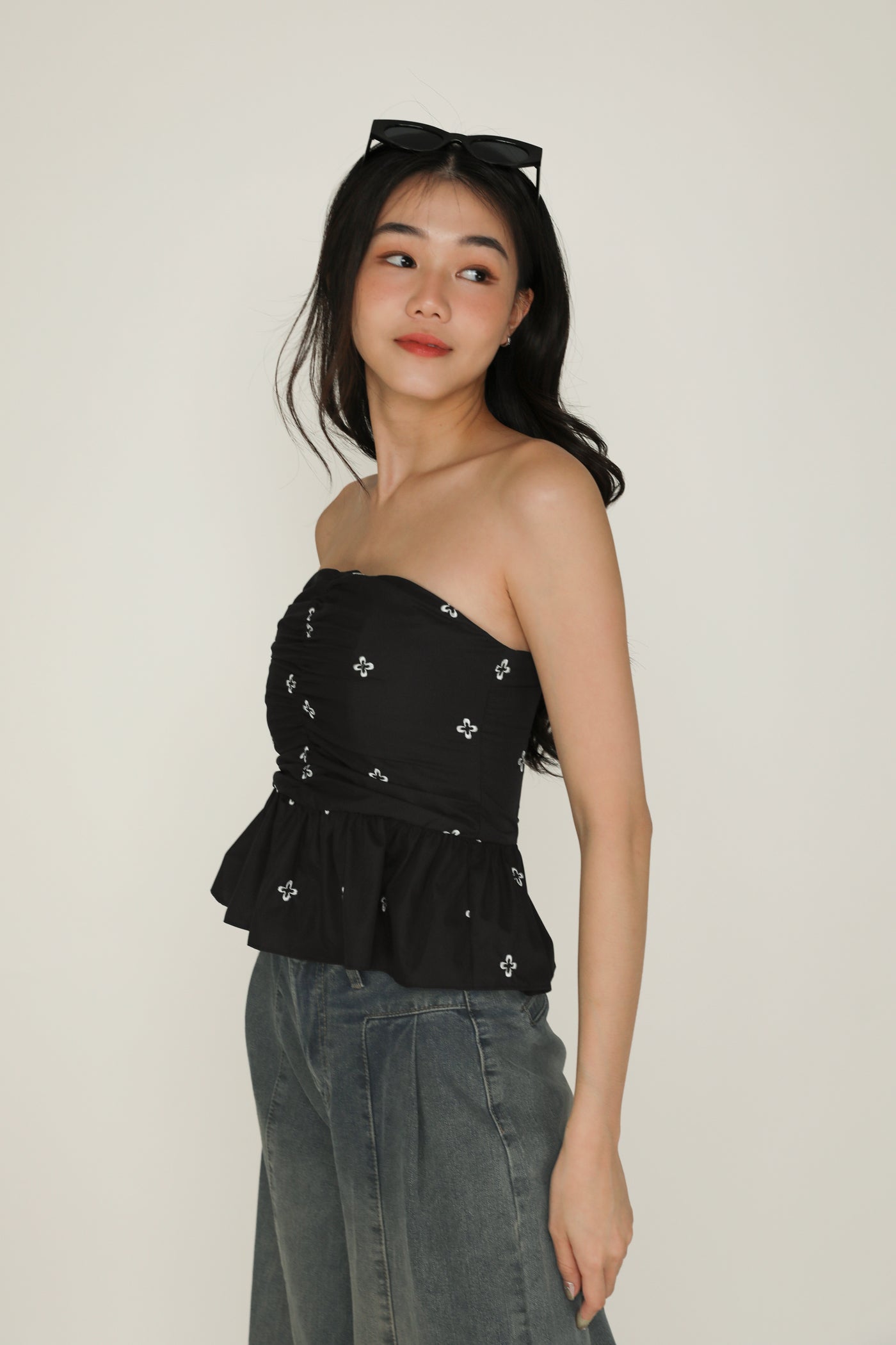 Nina is the icing on the cake for your weekend outfits. This refreshing tube top boasts a babydoll silhouette for a timeless, flattering fit. It is also decorated with abstract floral embroidery and ruching along the front for a feminine flair. Pair Nina with some simple denim shorts or a flowy maxi skirt for a dreamy ensemble.
