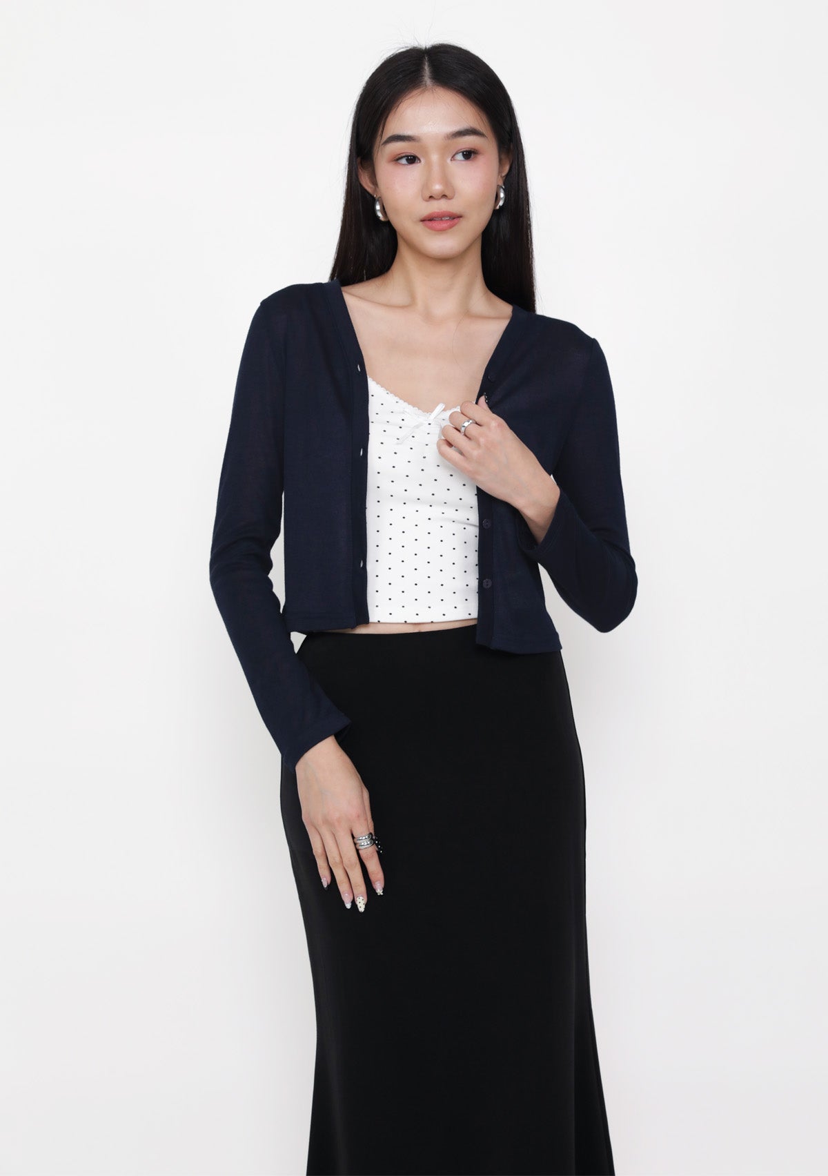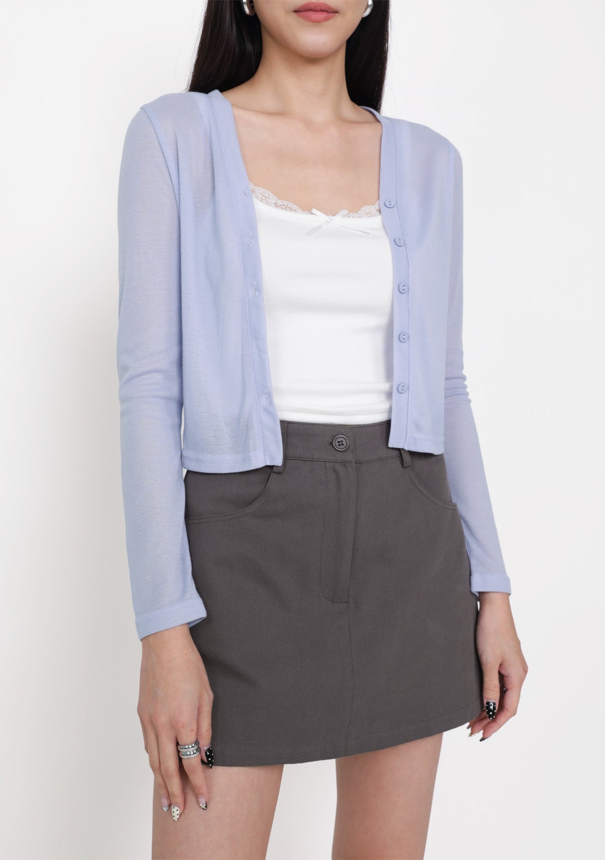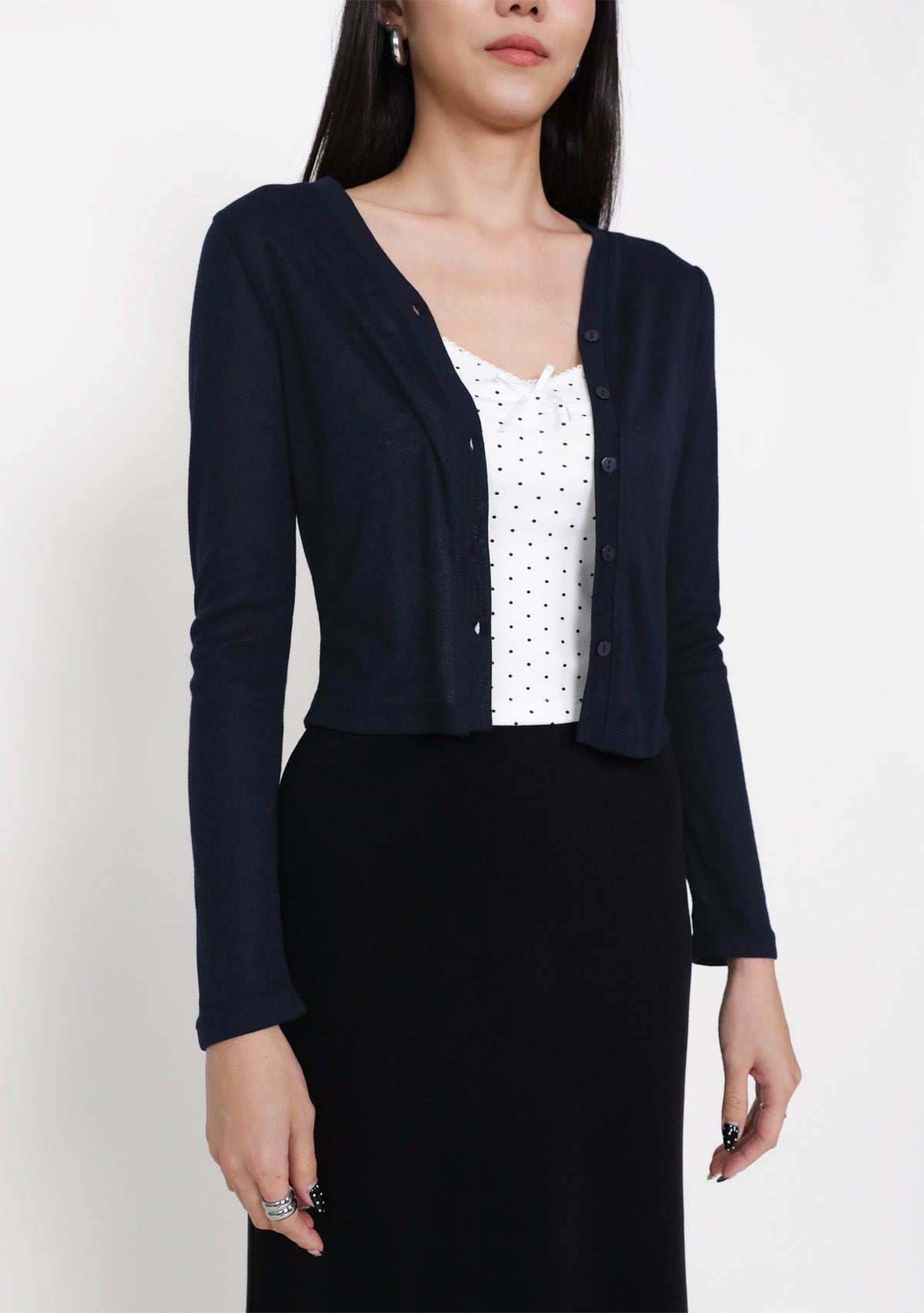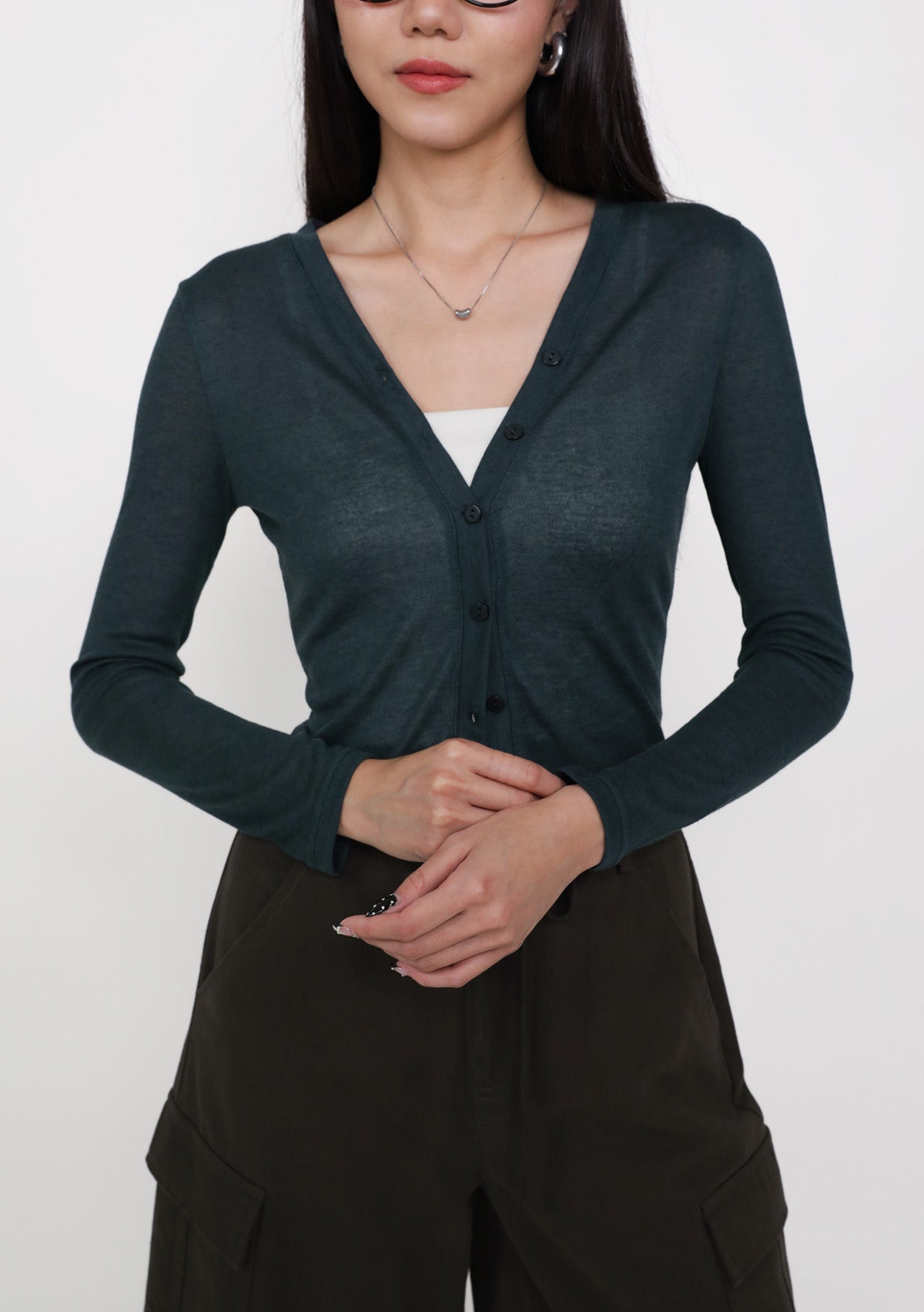 This cardigan is made of polyester rayon material and includes functional front buttons and a matching pouch.