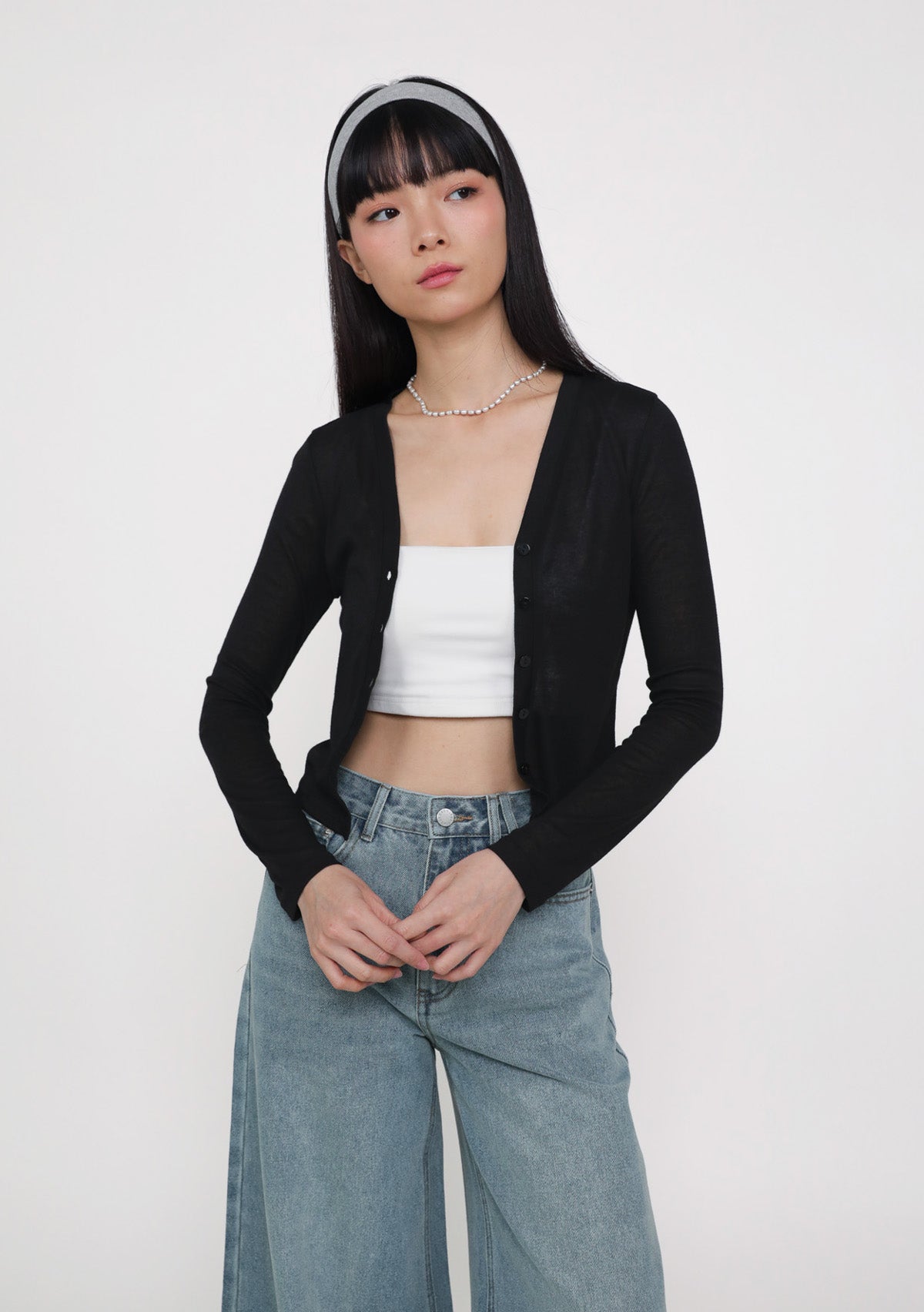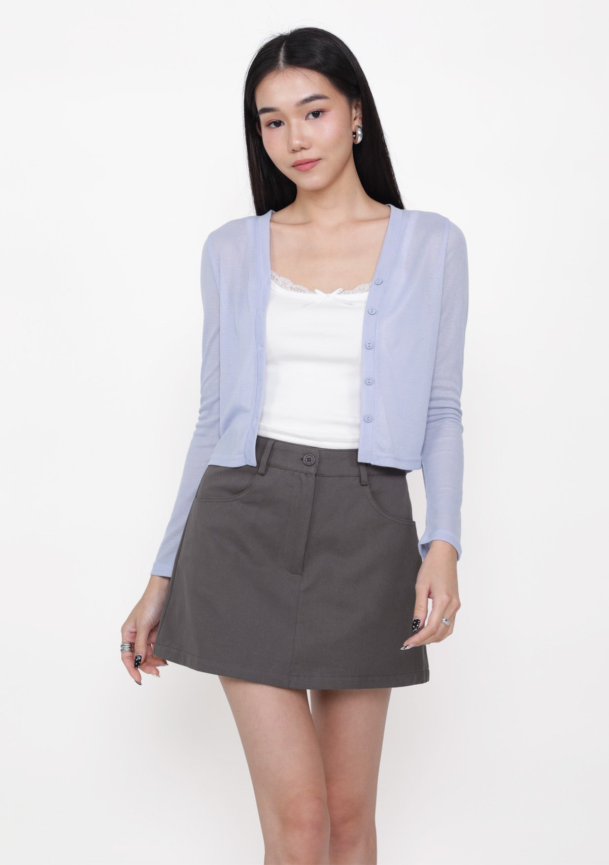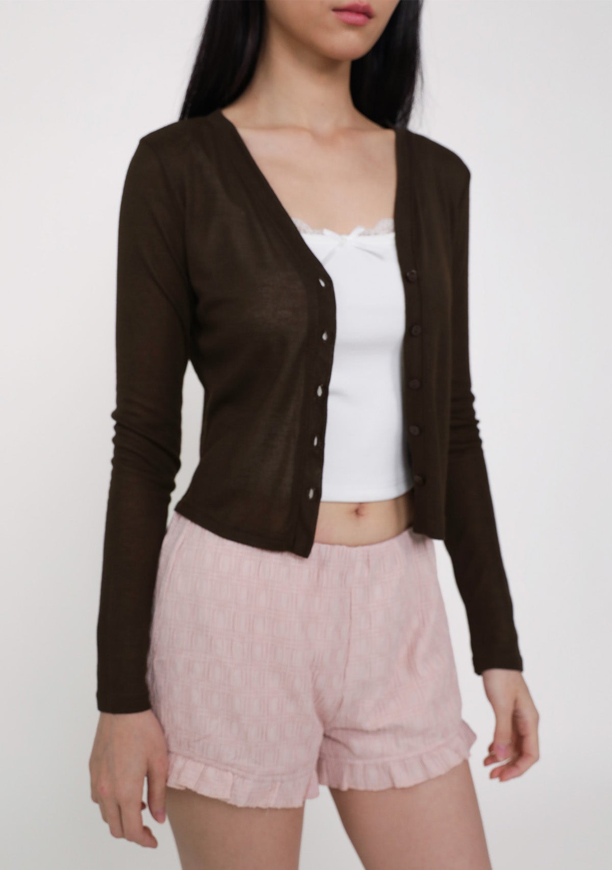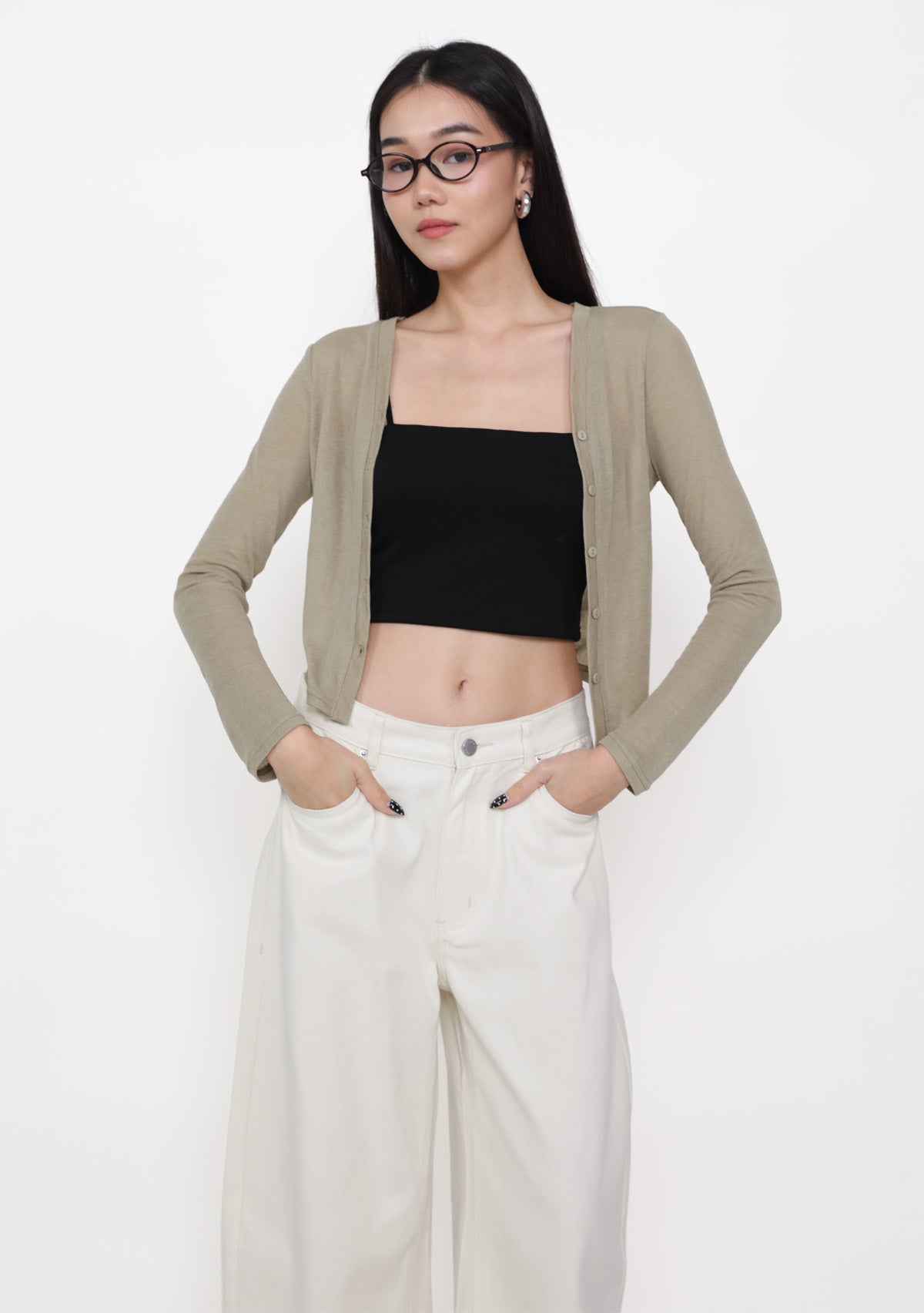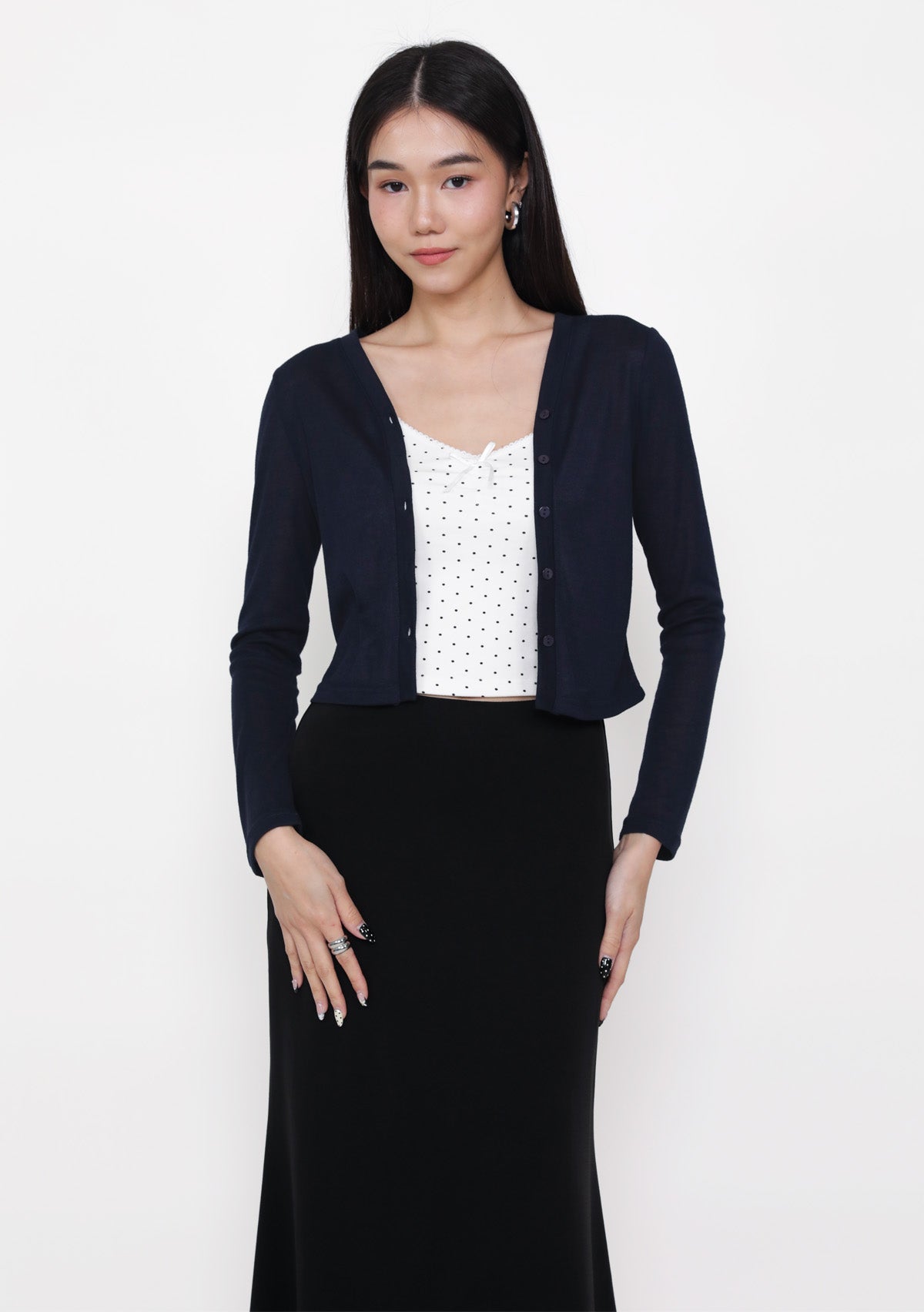 This cardigan is made of polyester rayon material and includes functional front buttons and a matching pouch.
