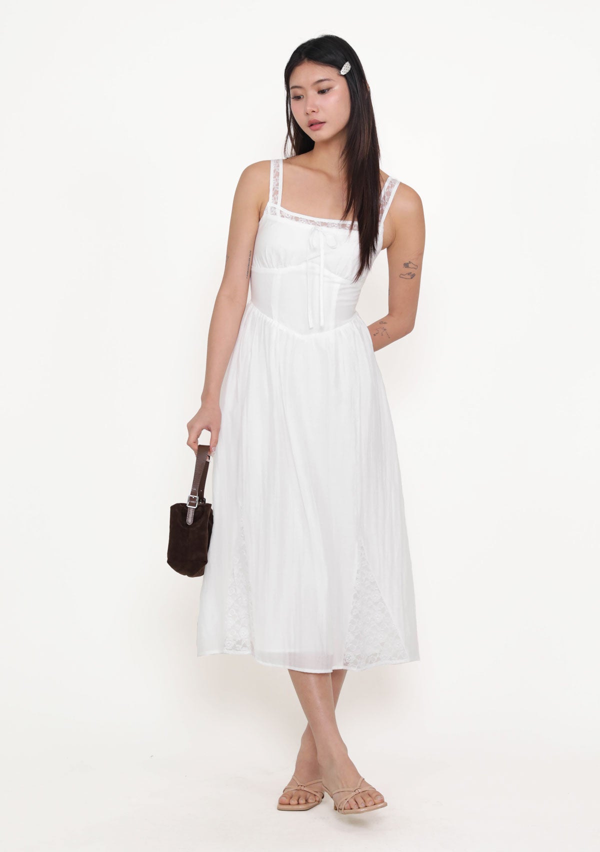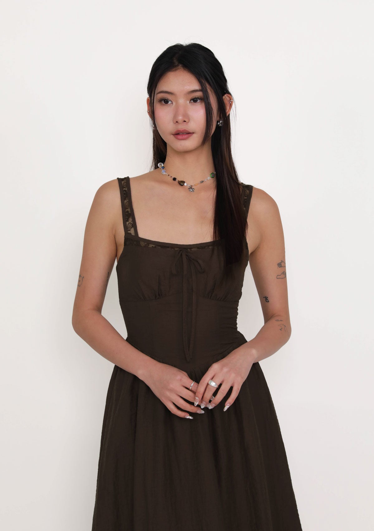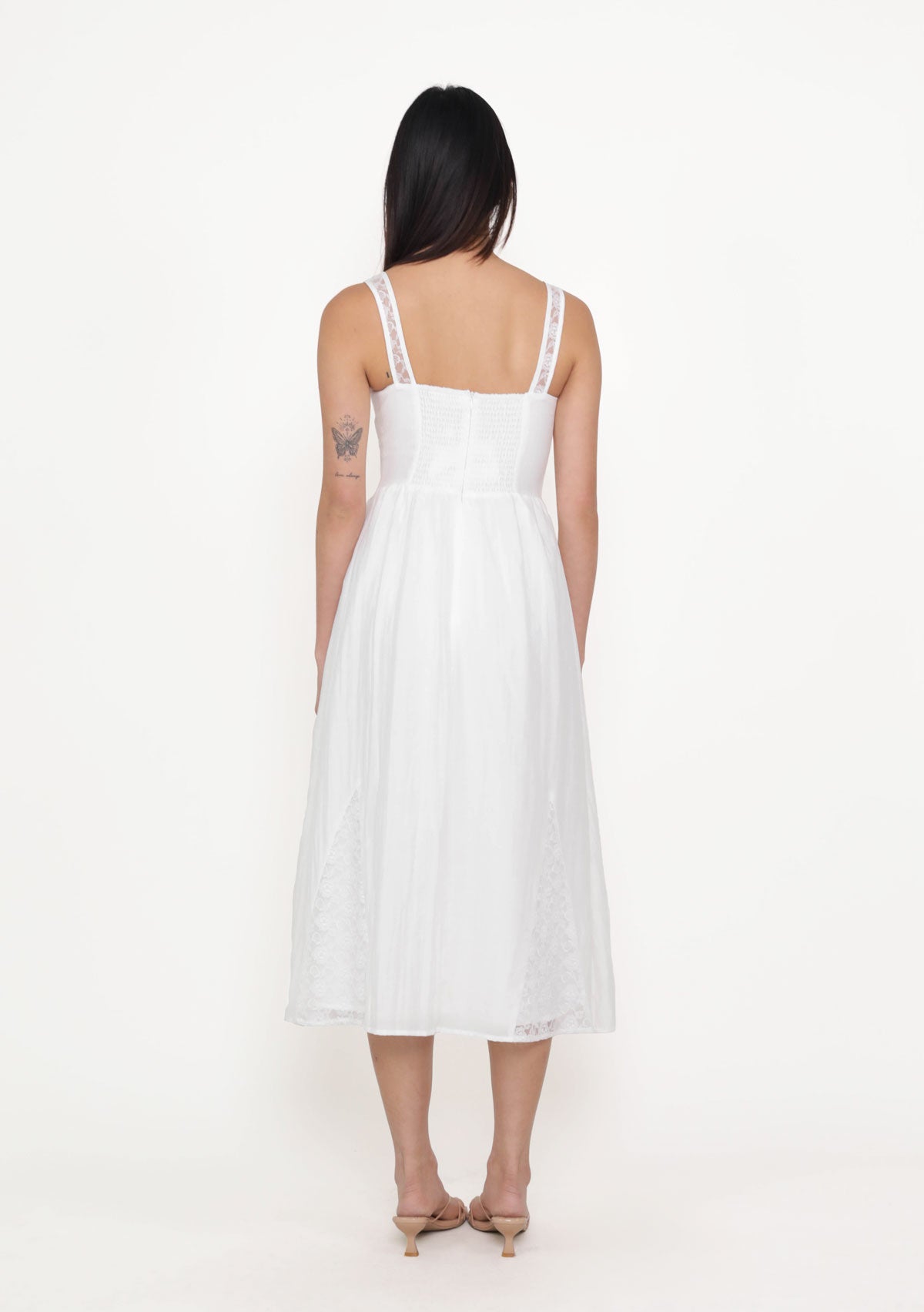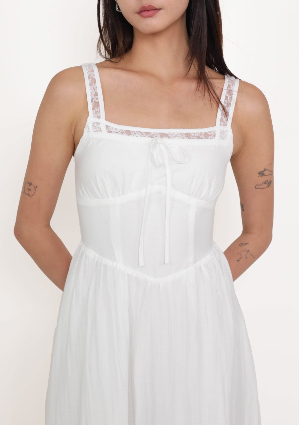 Valeria Lace Padded Maxi Dress is a rayon nylon maxi dress featuring lace detailing, removable paddings, a smocked back, and a self-tie front ribbon.