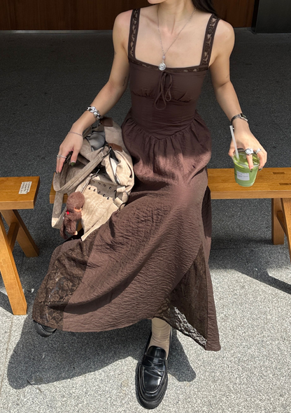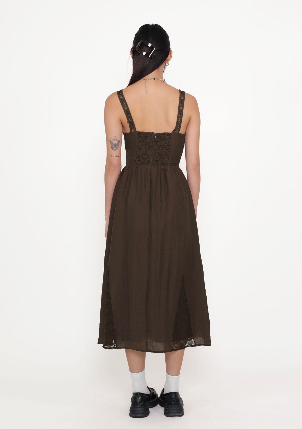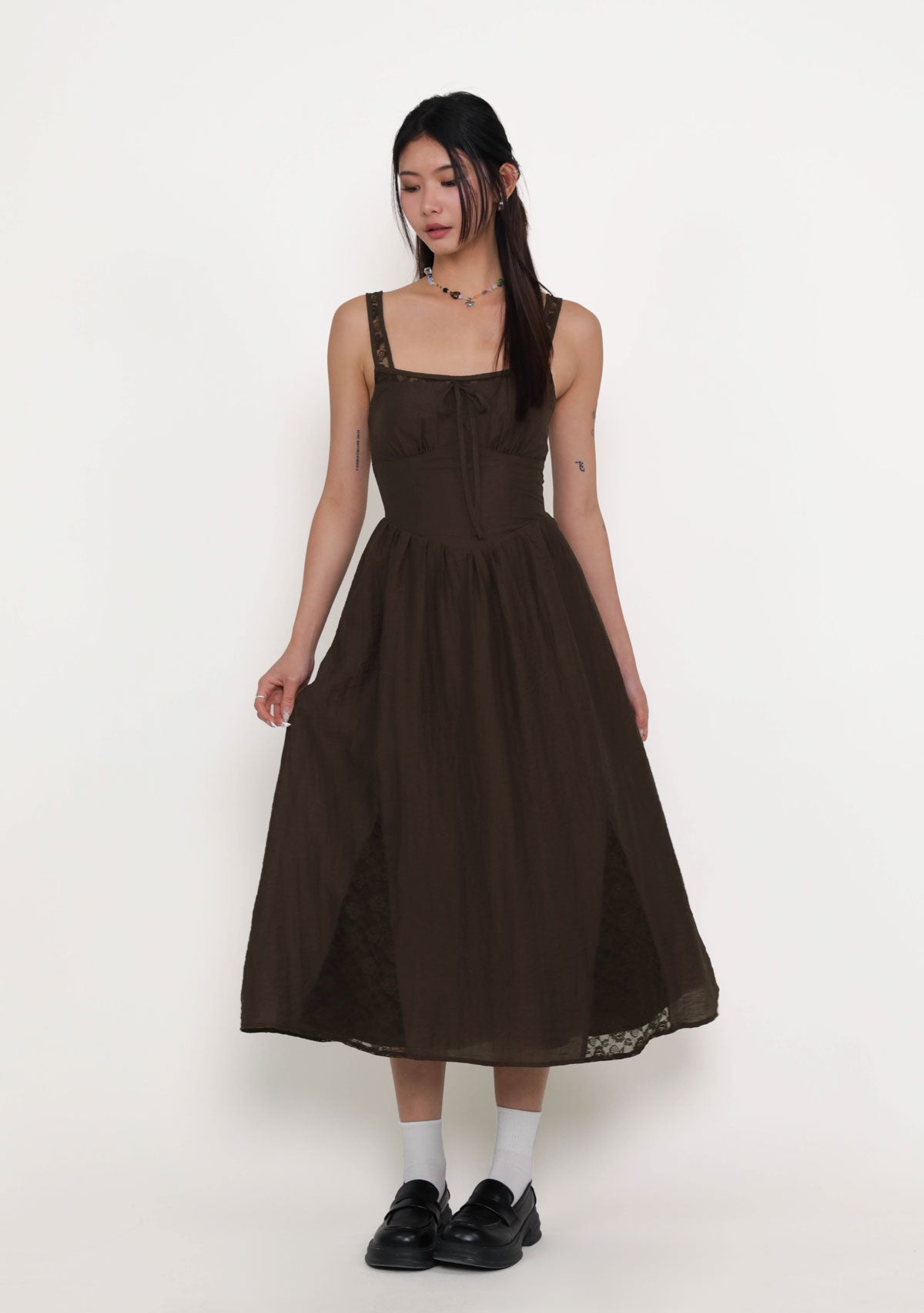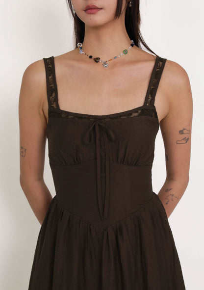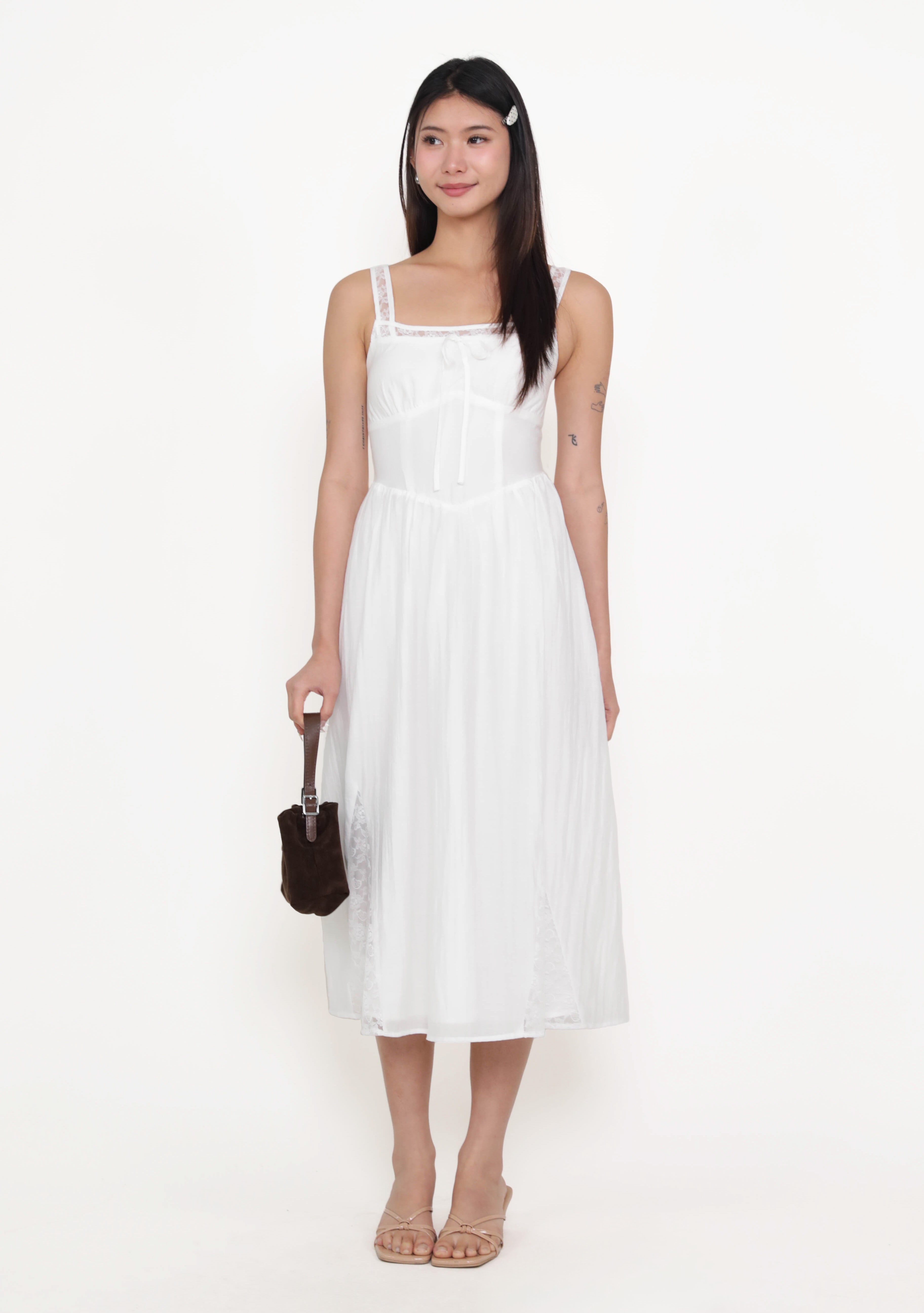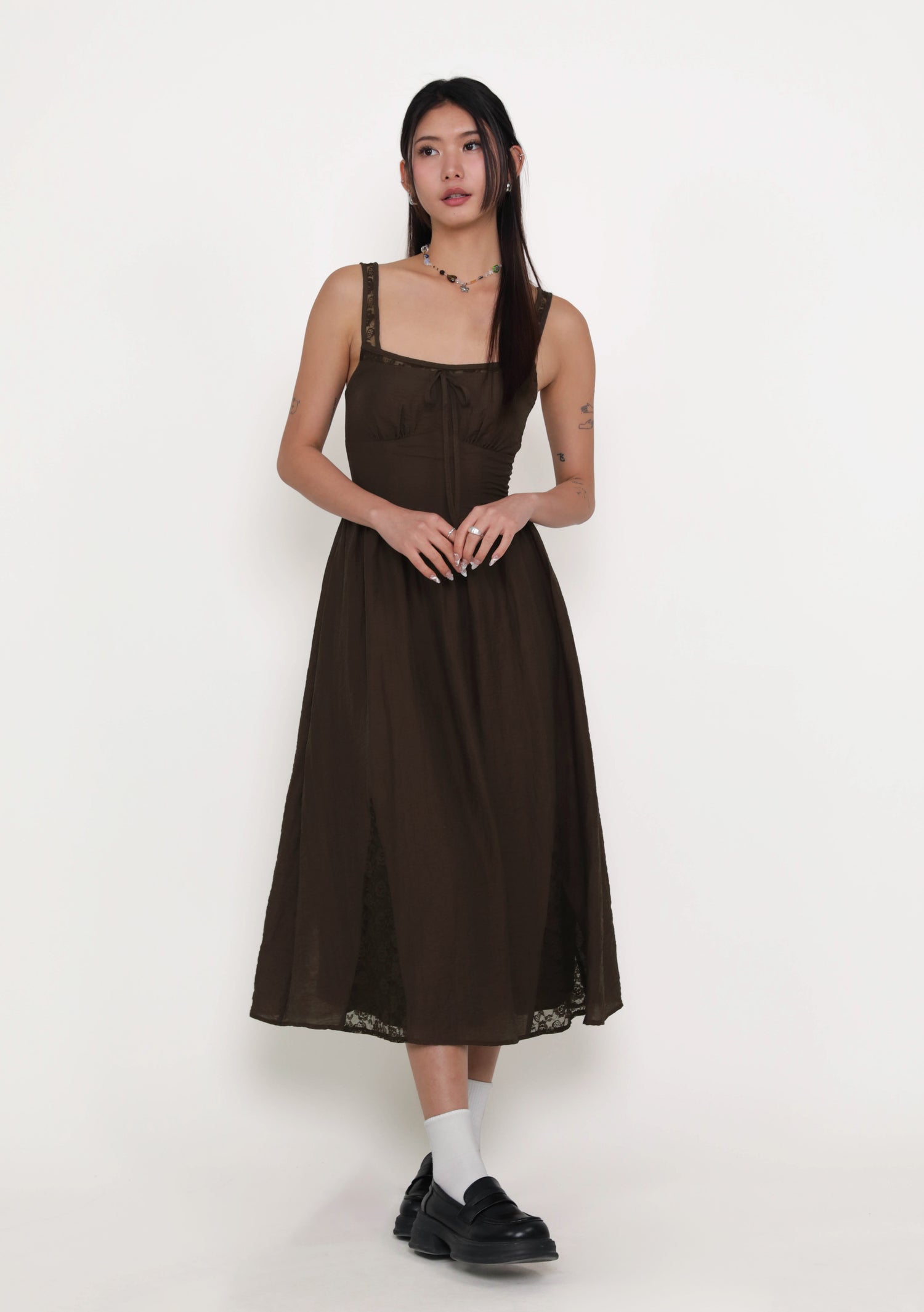 Valeria Lace Padded Maxi Dress is a rayon nylon maxi dress featuring lace detailing, removable paddings, a smocked back, and a self-tie front ribbon.