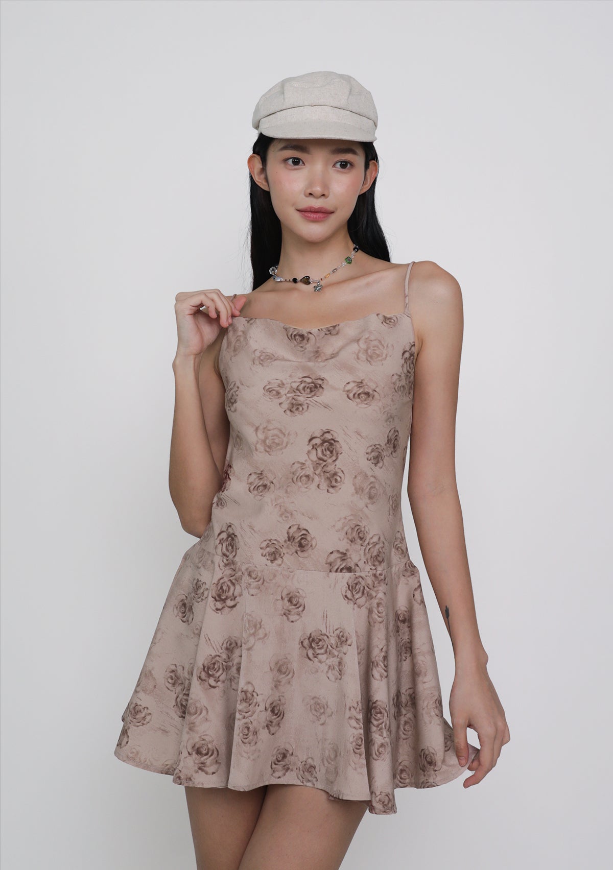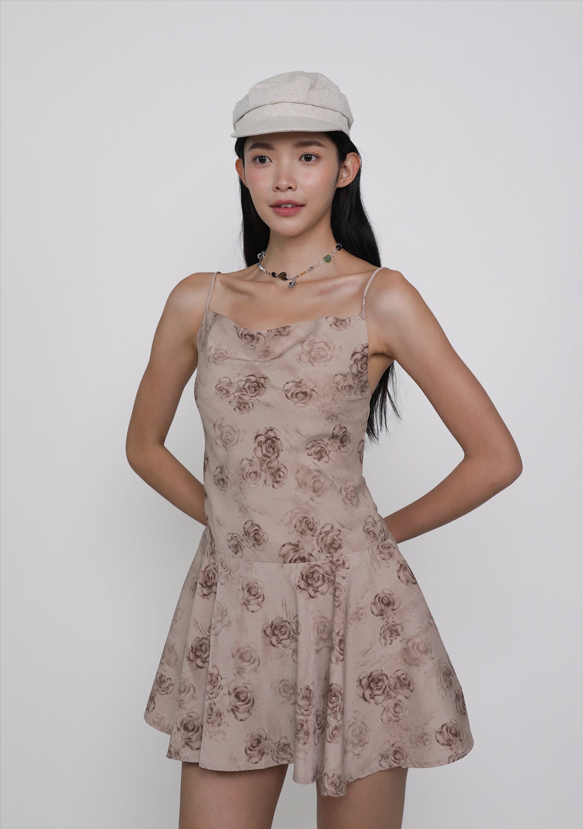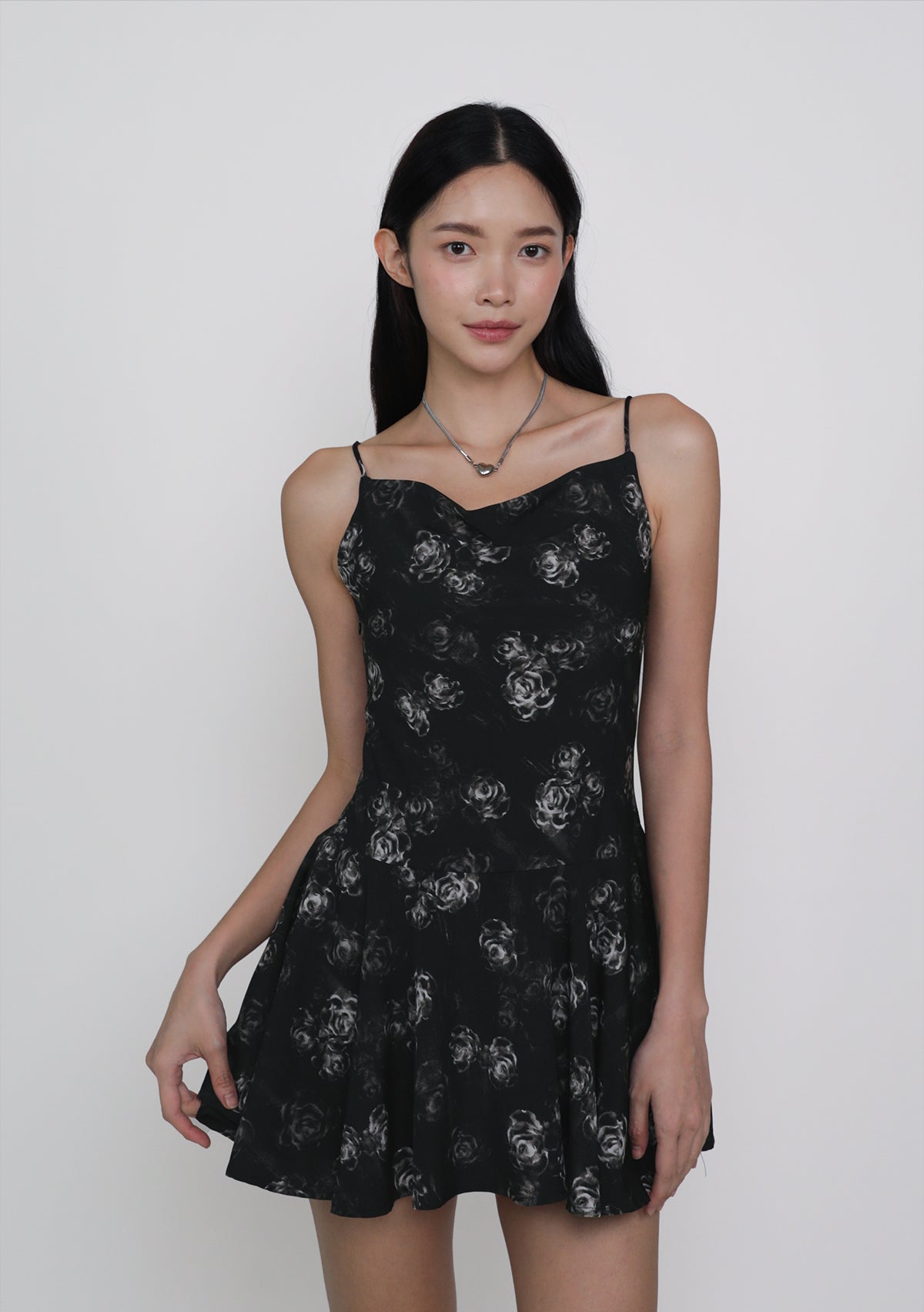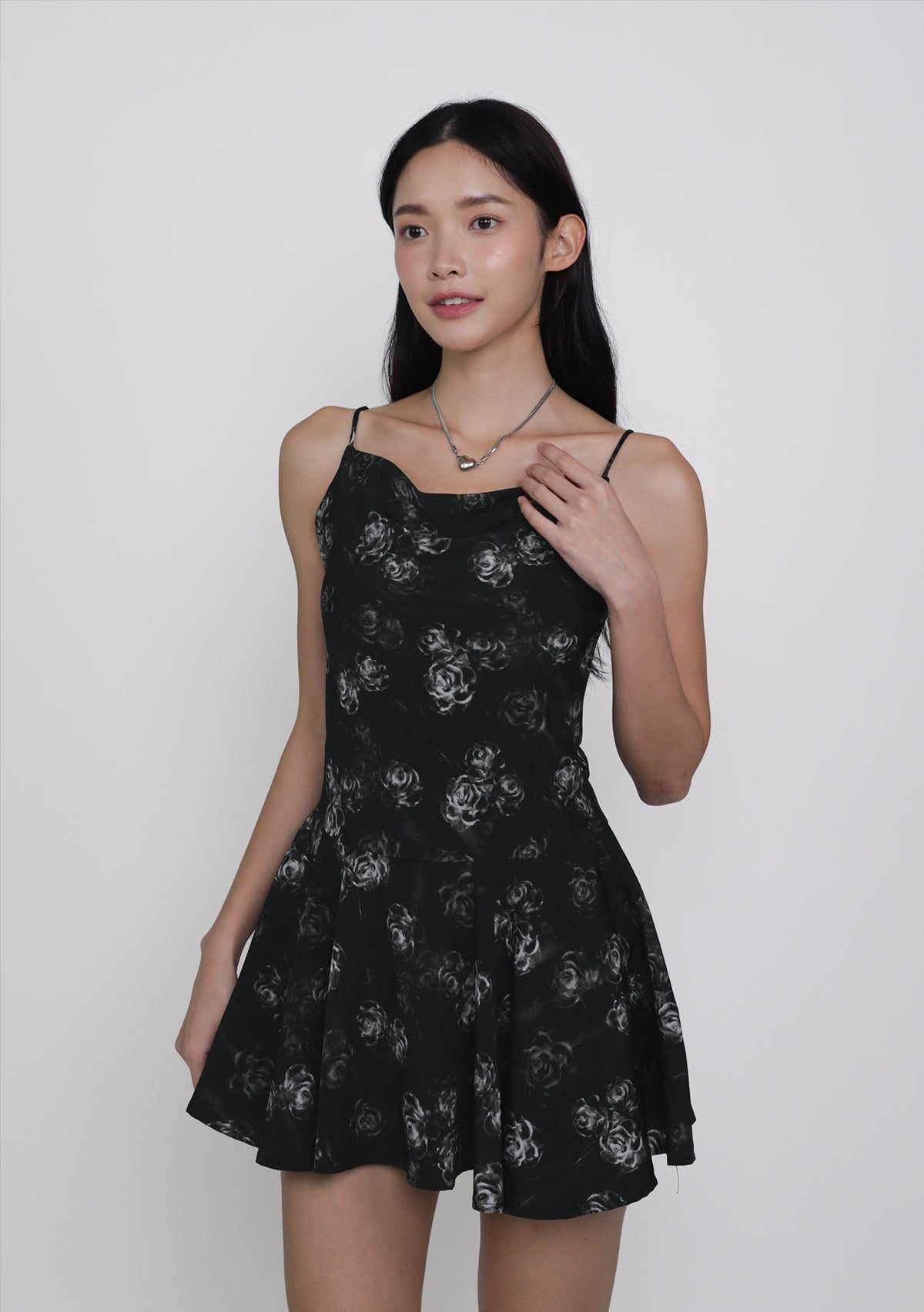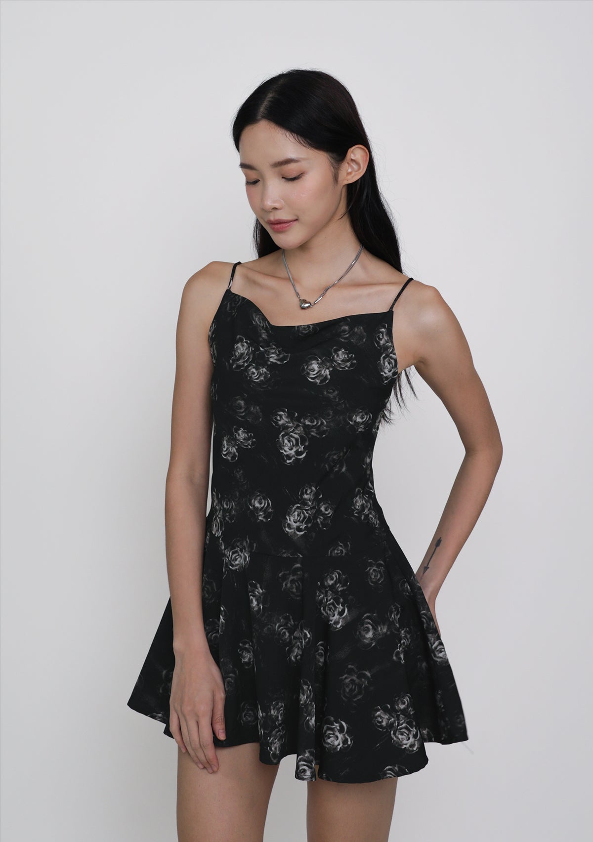 Flirty, floral, and effortlessly chic—Rosy is your new favorite one-and-done outfit. The delicate rose print brings a vintage romance, while the draped cowl neck and dropped waistline sculpt a subtly sultry silhouette. Finished with adjustable self-tie straps for the perfect fit, this romper is a dream from every angle.